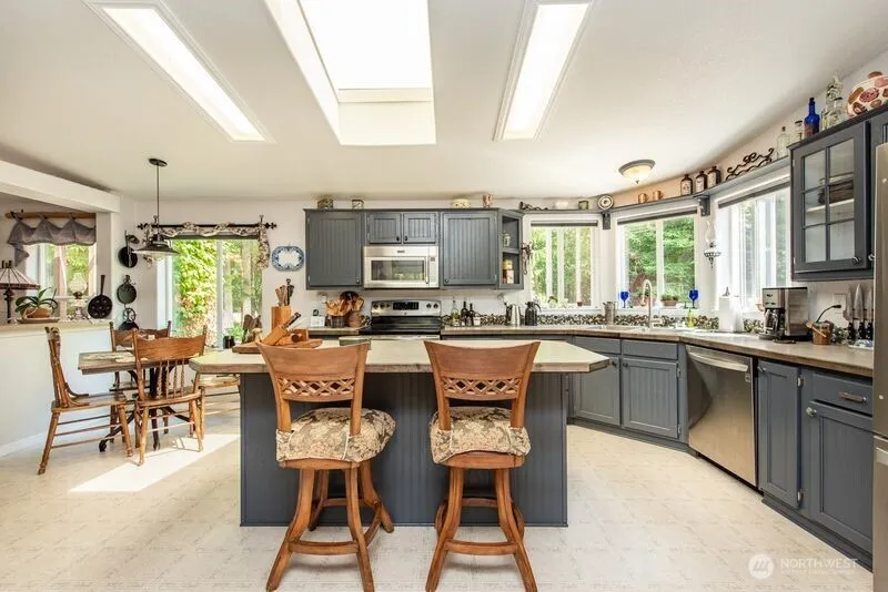 COMPLETELY FENCED YARD ON 5.04 BEAUTIFUL PRIVATE ACRES WITH NO HOA!!! You feel like you are in your own private park. This spacious home and property abuts the eastern side of Miller Peninsula State Park: a 2,800-acre day-use park which has miles of hiking trails & lush coastal forest with views of Discovery Bay & Strait of Juan De Fuca. This 2,722 SF mfg home was built in 2000 with 3 BR & 2 BA, living room with wood stove, family room, dining room, kitchen with island – breakfast bar – pantry (take out some shelves to the left and can add a freezer) – nook, primary BR has a sitting area & his & hers closets & garden room (was a hot tub room – could be converted back). Deck in back stained with Armstrong Clark deck stain, covered front porch. 3 sheds – 1 for mower and equipment, wood shed, plus 2 additional sheds for garden and multi use, 900 SF garage w/shop space (24’5” x 36’ 5”), 2 carports, fenced garden area – 30 amp power and has water, RV hookups including 30 amp plug. Back of the property is wooded w/Western red cedars & trails. Features * brand new hot water heater * 6” walls * under cabinet lighting * spread stone countertops * Energy Star * new roof & skylights in 2016 * double cellular shades * laminate flooring * blueberry, fig, pear tree, plum * 1,000 gallon underground water storage tank – water from gutters & downspouts – use to water the yard * sump pump under the house * circular driveway around back * septic & community water * very private and quiet