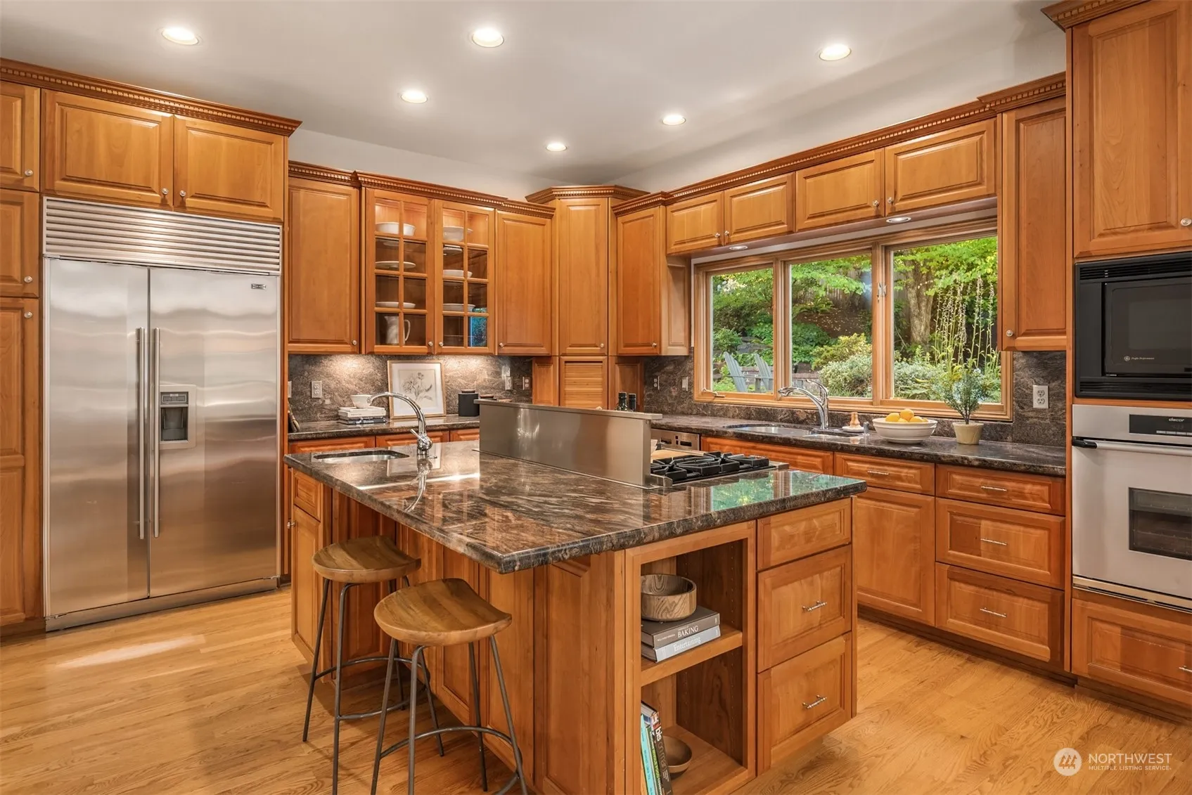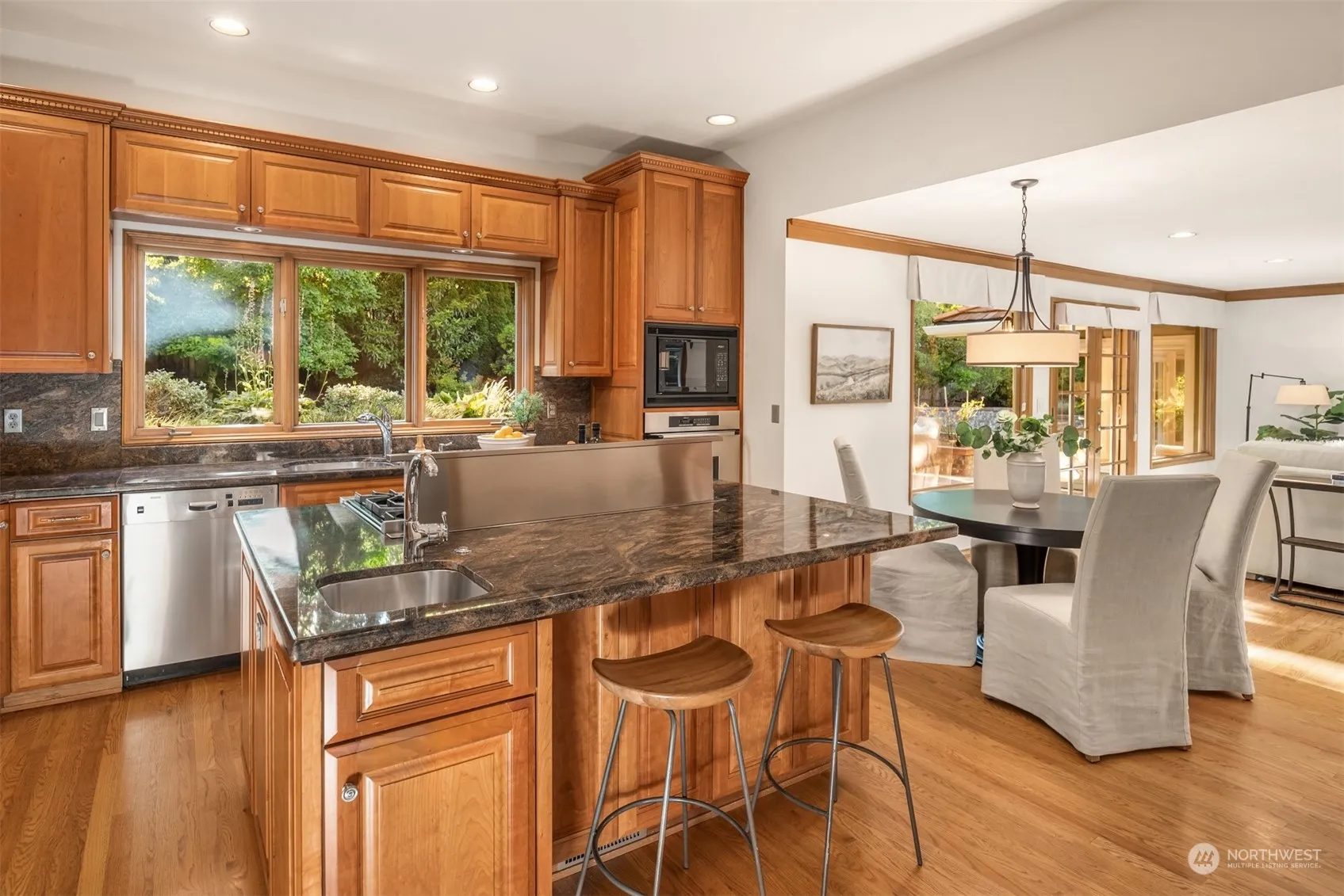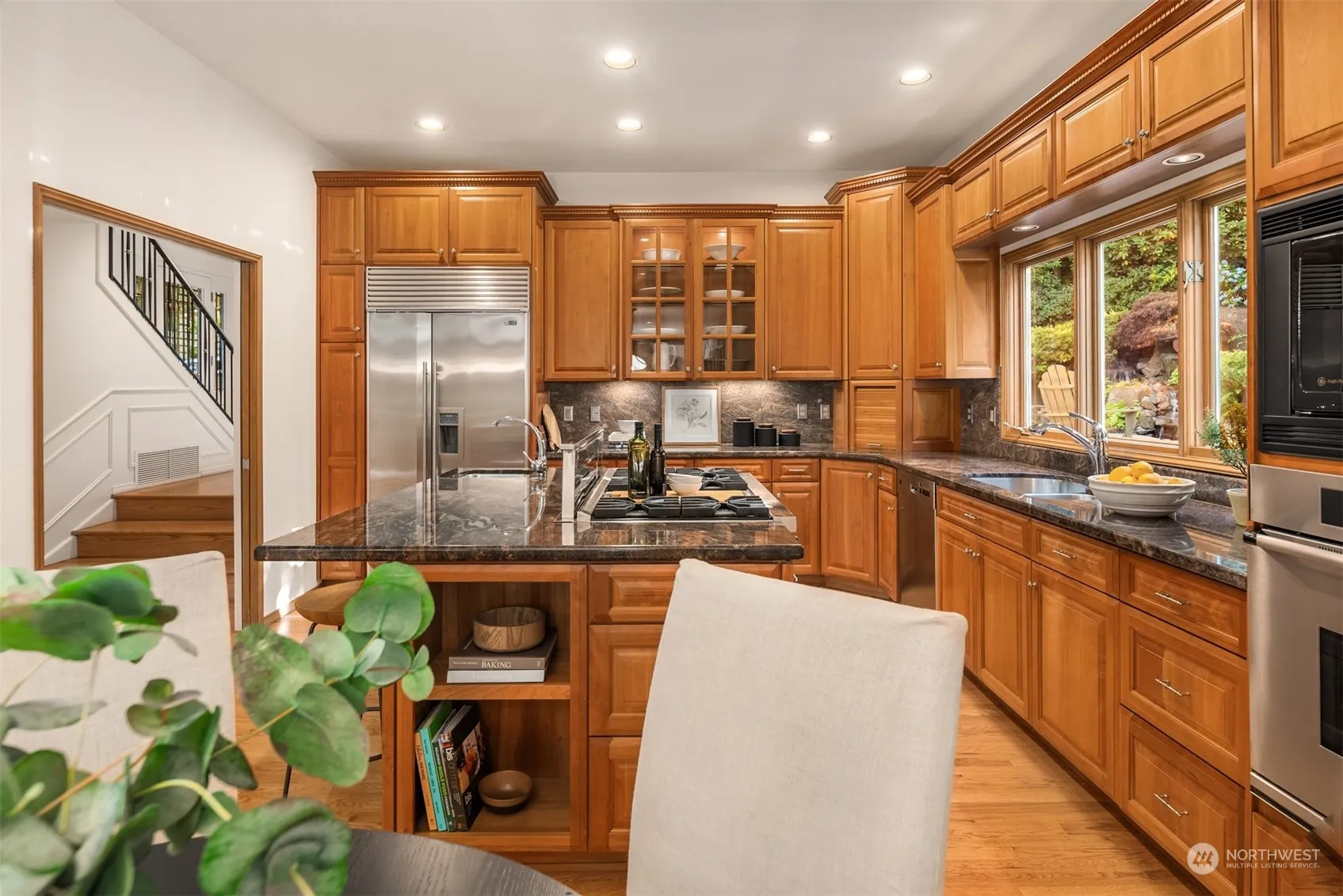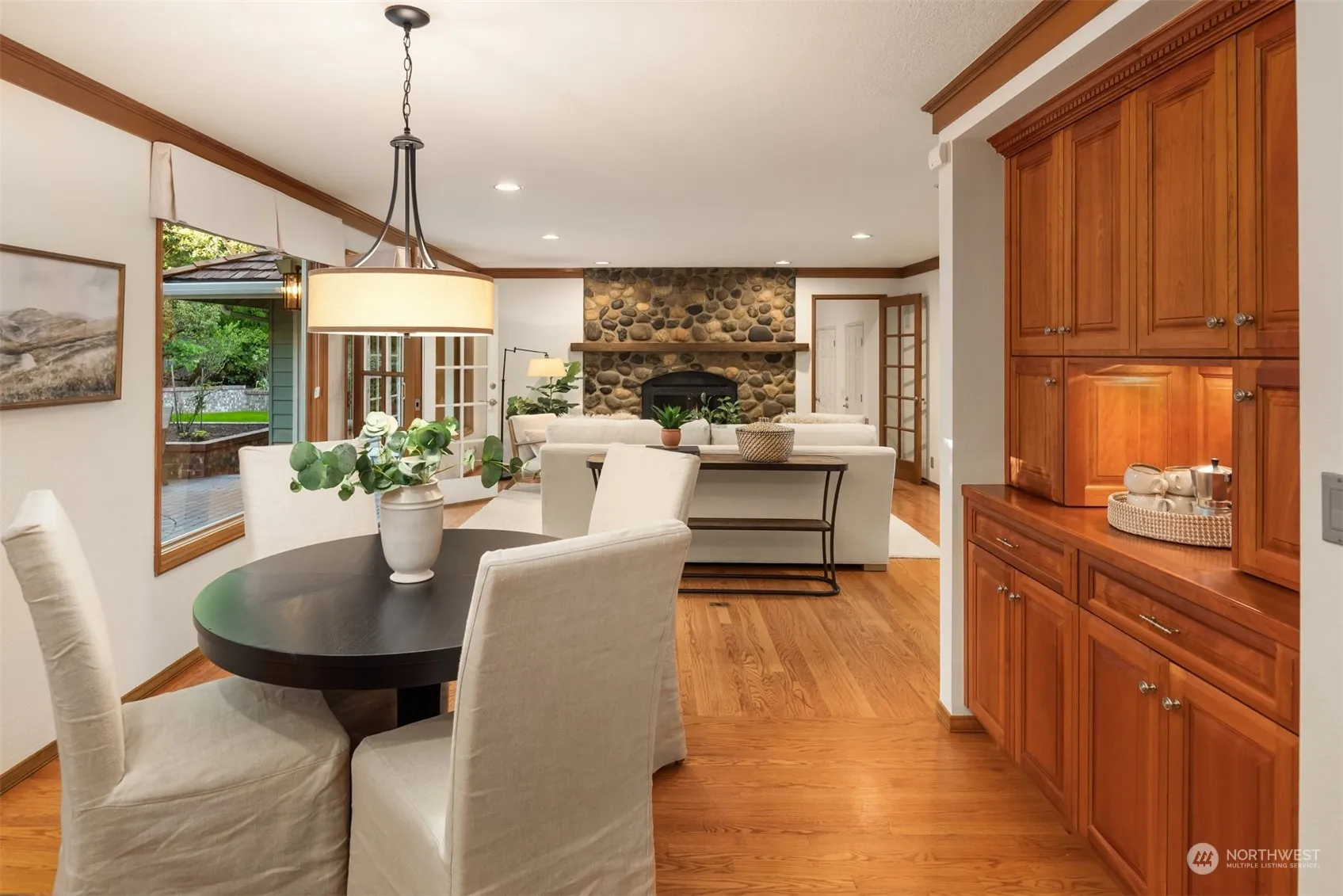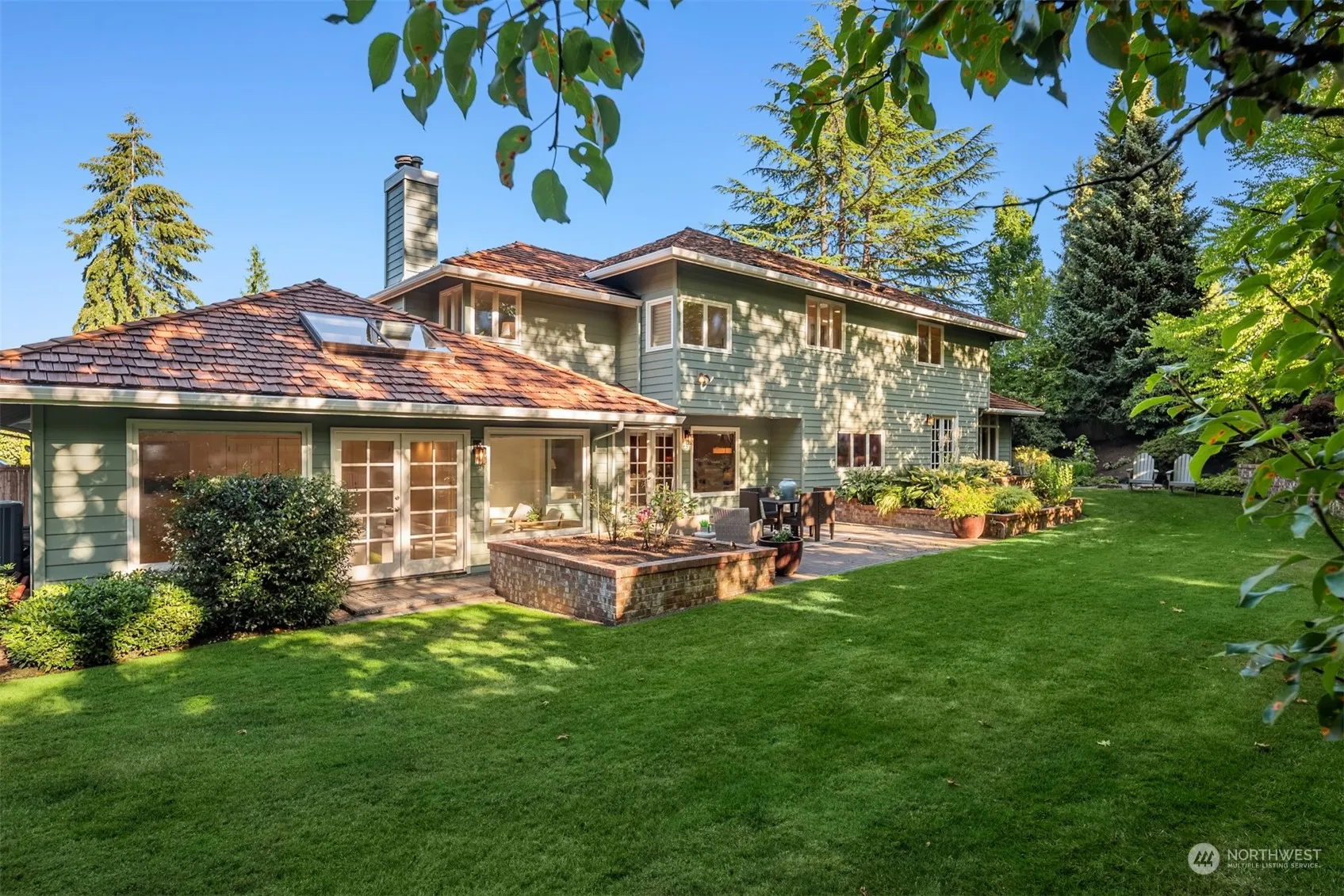 This Medina Traditional is placed on a private lane on beloved NE 10th Street. Sited on a serene 21,954 sq ft lot with large, flat, fully fenced backyard. Sunny updated interiors boast a spacious kitchen & great room with floor-to-ceiling rock fireplace & French doors out to expansive patios. Also on the main: formal living & dining, rec room & office. The upper level offers 4 generous bedrooms including a primary suite with sitting area. The peaceful & quiet setting is enhanced by a tightknit community in an ideal locale with the Points Loop Trail at the end of the block. Stroll to Overlake Golf & Country Club, Medina Elementary, St. Thomas School, Medina Park & the Green Store (now Kitchen & Market). A wonderful lifestyle awaits!