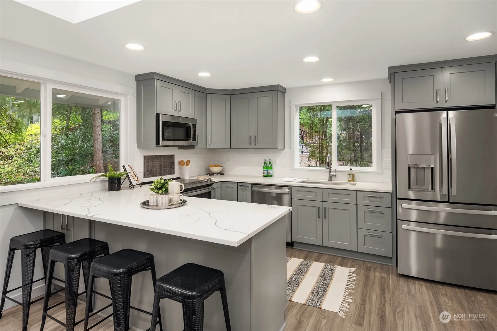 This meticulously renovated home perched near the end of a quiet dead-end street will squash your DIY dreams! Nothing to be done here, except move in & enjoy the fruits of this labor of love & serene park-like setting. The main floor features abundant natural light with a reimagined eat-in kitchen, formal dining & generous living room with gas fireplace, leading to an ample deck for al fresco summer nights & peekaboo mountain views. The primary bed & ¾ bath ensuite, 2 beds & full bath complete the main floor. The daylight basement offers a 2nd kitchen, bed, bath, rec room & generous laundry/mudroom. Oversized 1-car garage w/ bountiful storage. Acclaimed Northshore Schools & easy commute to Bothell, Kirkland & either side of Lake Washington.