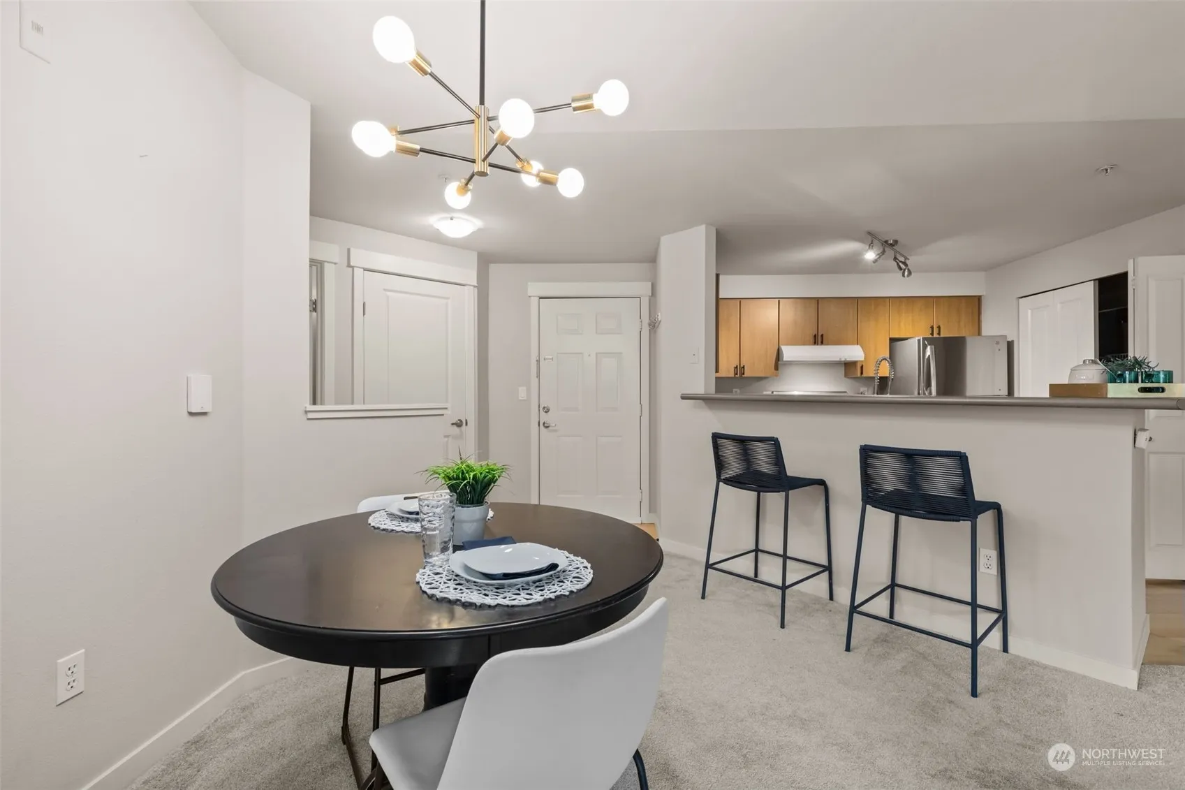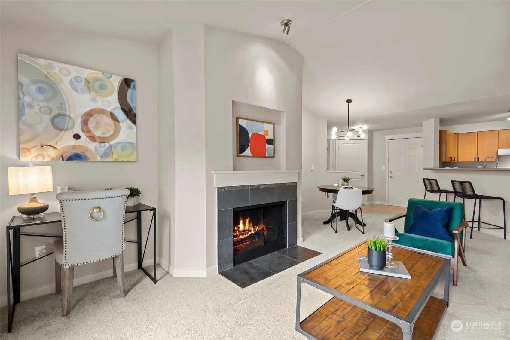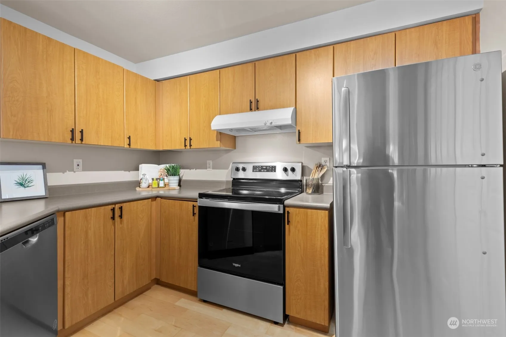 This magnificent light & bright top floor Trail Walk condo w/ vaulted ceilings, a huge open kitchen w/lots of cabinets, counterspace & stainless appliances. Spacious bedrooms are separated for privacy & include a sumptuous primary suite w/en-suite bathroom. Private covered balcony great for sipping your favorite beverage & relaxing in any weather. Tons of storage, wood burning fireplace, full size W/D, new water heater & more! This sought after complex features a secured ELEVATOR, secured garage parking, Clubhouse, pool, hot tub, gym & pea patch. Pets of all sizes welcomed! Super well located close to the Burke Gilman Trail, delicious food, coffee, breweries, shopping, services, transportation, the slough, recreation options & so much more!