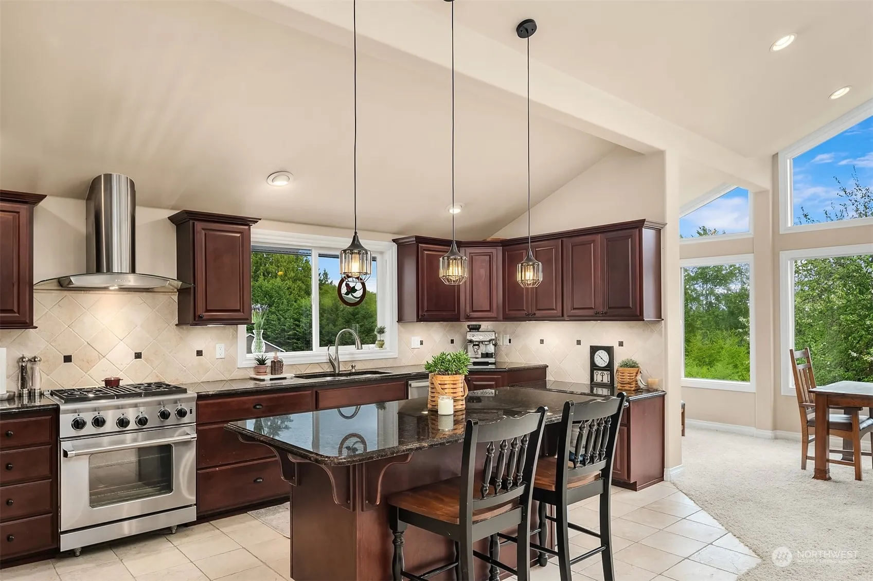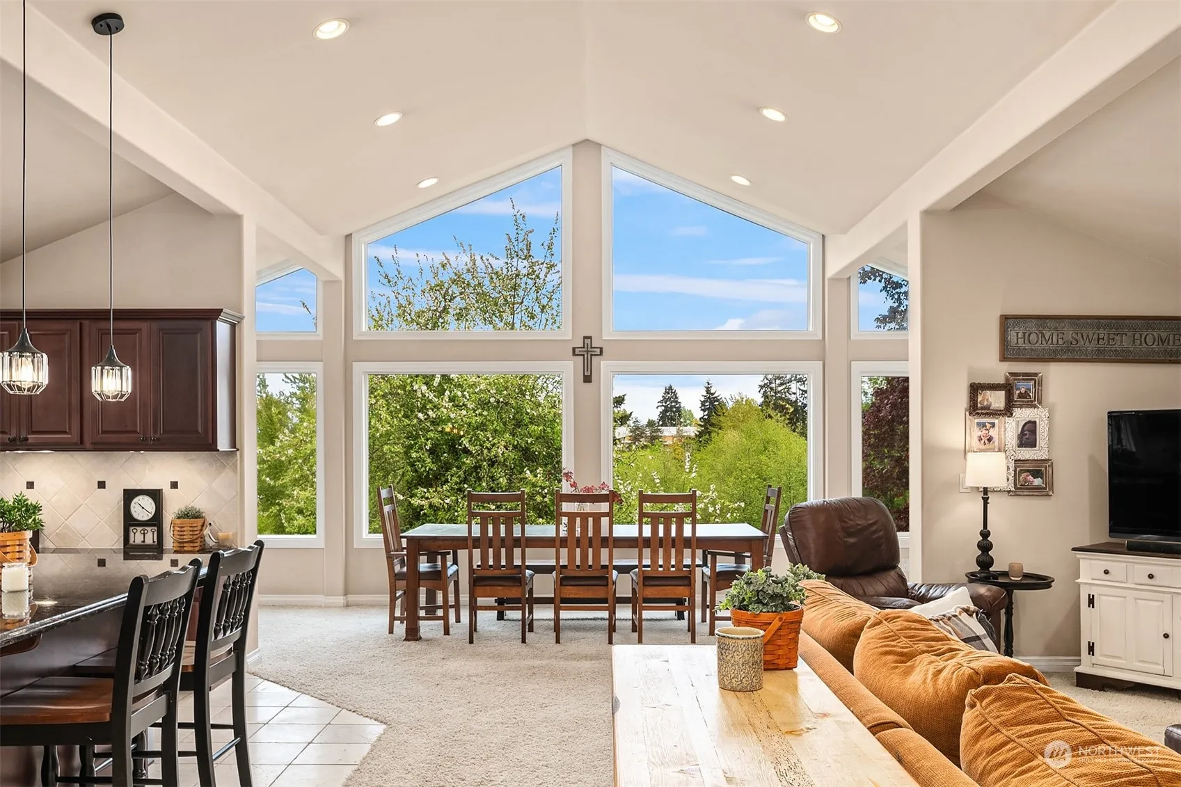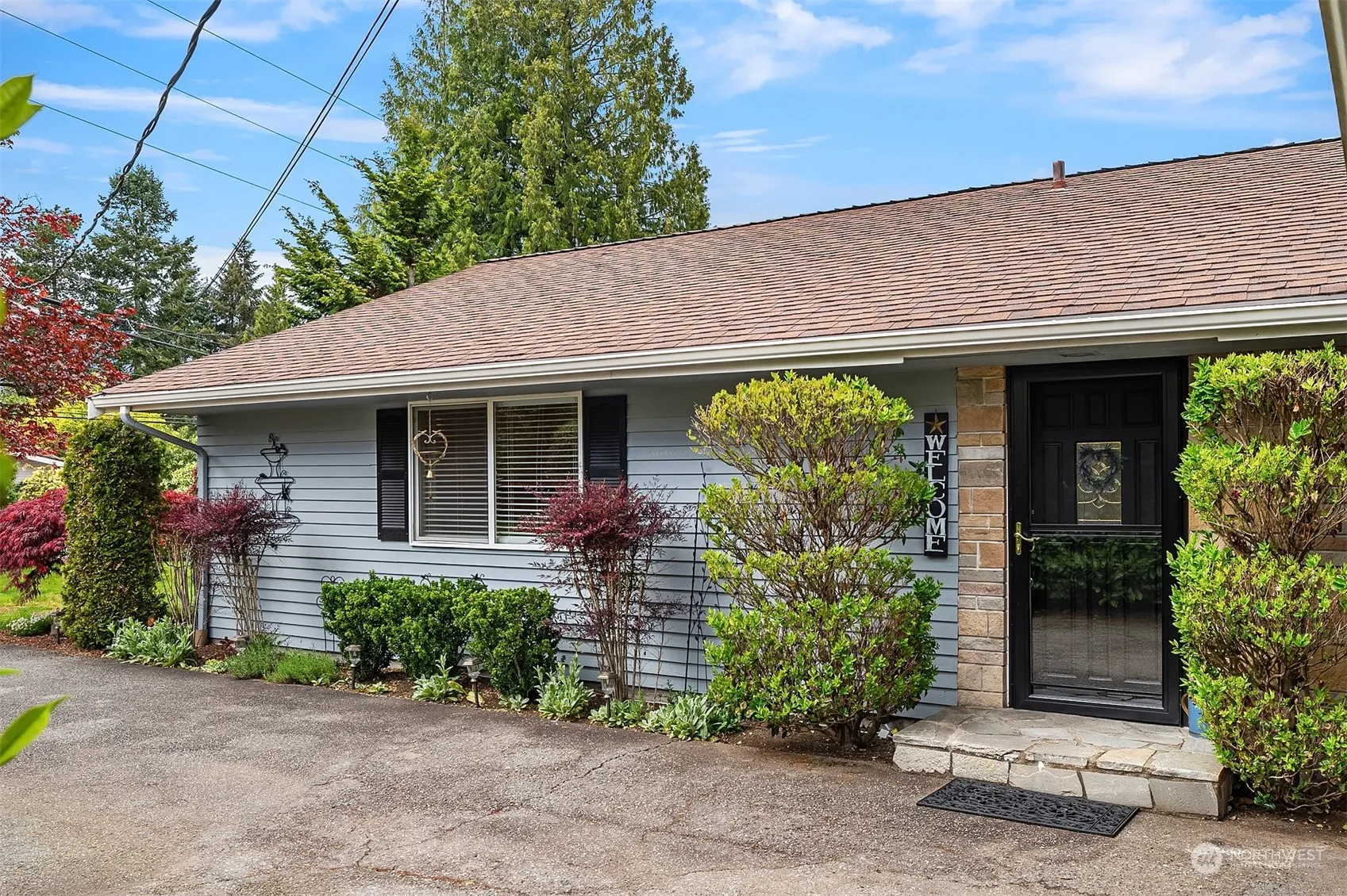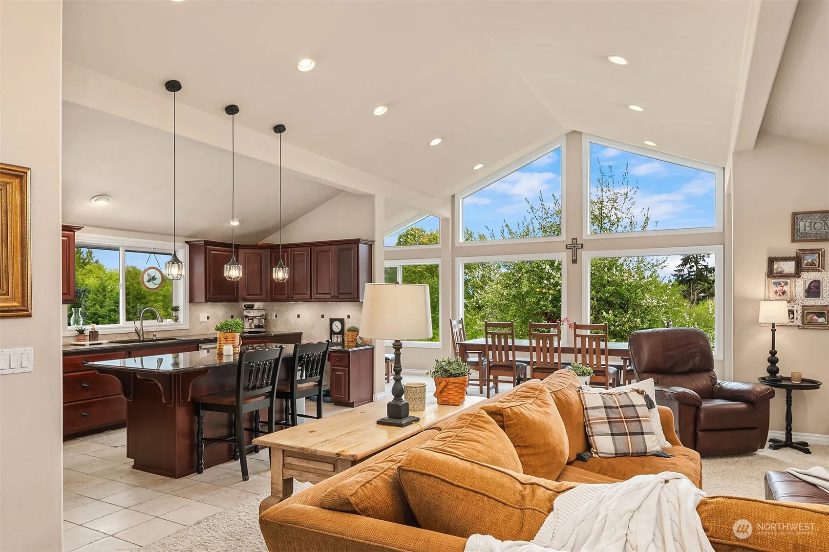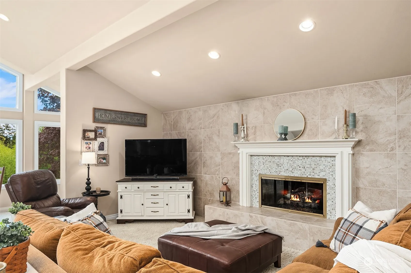 This Daylight Rambler has been well maintained & cared for & is flooded with light through the picture windows. Well equipped kitchen for culinary delights, spacious great rm w/vaulted ceilings, & views of nature beyond. A gas fireplace anchors the room making it perfect for intimate gatherings, or larger parties! Sumptuous & spacious primary suite on main floor, with laundry for ease of living. Second bedroom on main has generous built-in cabinetry. Lower level is open & inviting w/a masonry fireplace & wet bar complete w/sink, microwave & small refrigerator. Laundry room, den, bedroom, ¾ bath. Outside is a private covered patio perfect for entertaining on those damp days, or al fresco under the stars! Welcome Home!