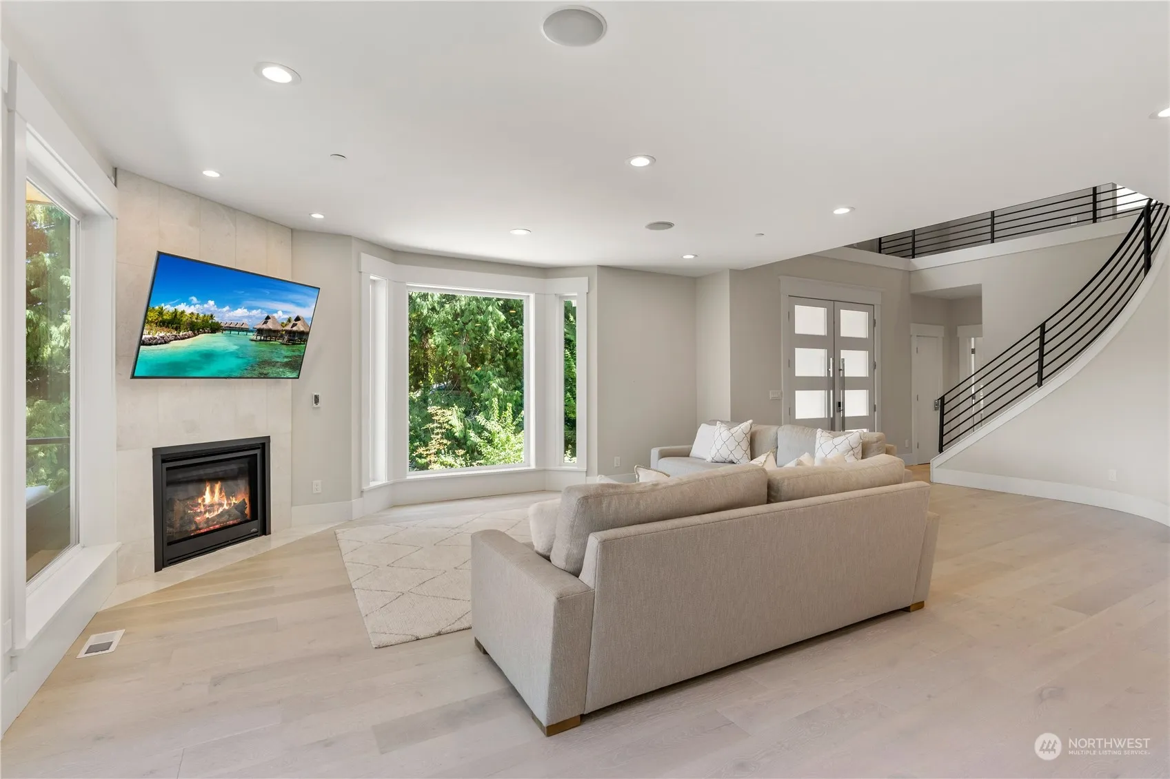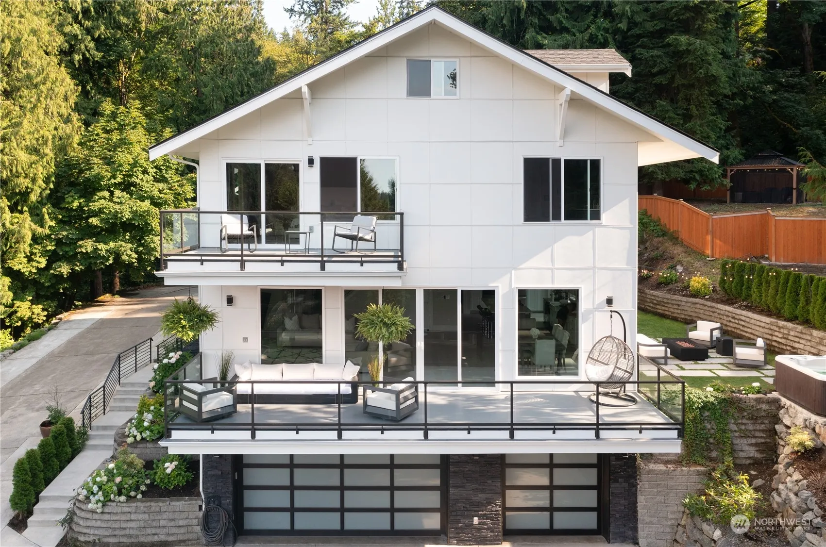 Sitting on top of the hill, on a private road, you will find this absolutely grand 4300 sq. ft. modern home. Custom built-in 2020. Main level w/ 9 ft. ceilings with a truly open concept from kitchen to the dining room, great room, and 4-panel sliding door that opens up to the impressive deck (w/in-ceiling heaters), making this a seamless indoor/outdoor entertaining space. Gorgeous kitchen with white cabinets, quartz countertops, glass backsplash, and GE stainless steel appliances. Oversized windows in the great room/dining for maximum natural light. The Grand staircase takes you to the upper level. Primary bedroom with its own deck. Beautiful territorial views of Sammamish River Valley. Oversized 3 car garage. Burke Gilman Trail nearby.
