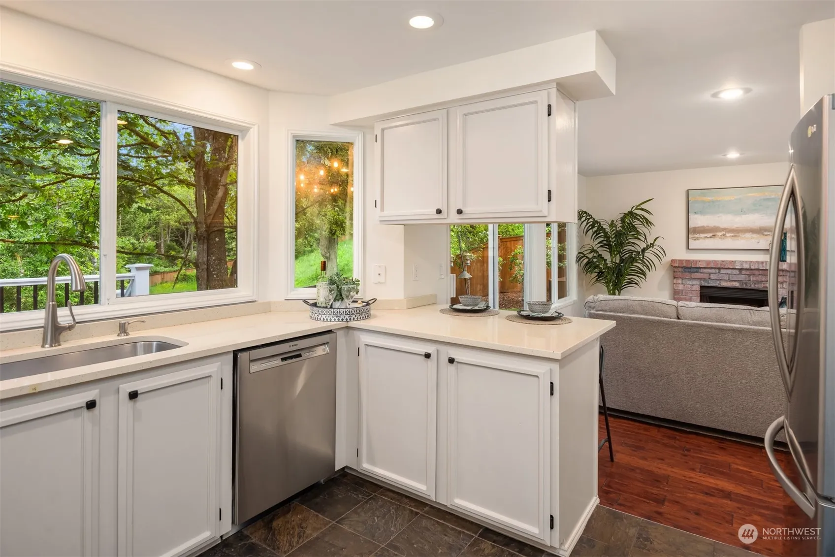Welcome to your serene sanctuary in sought-after Inglewood! Nestled in a quiet cul-de-sac, this beautifully updated home offers comfort and sophistication. The slate tile entry leads to a bright living and dining area with hardwood floors. The kitchen features stainless steel appliances, quartz counters, and lush greenspace views. Enjoy the cozy wood-burning fireplace in the family room or step out to the spacious, fully-fenced backyard—an oasis of greenery and wildlife. The master suite includes a walk-in closet and en-suite bath with dual vanity. With a 2-car garage, AC and prime Kenmore location, updates include a Trex deck, new roof, water heater, fresh paint, hot tub, and fruit trees. Schedule a showing today!