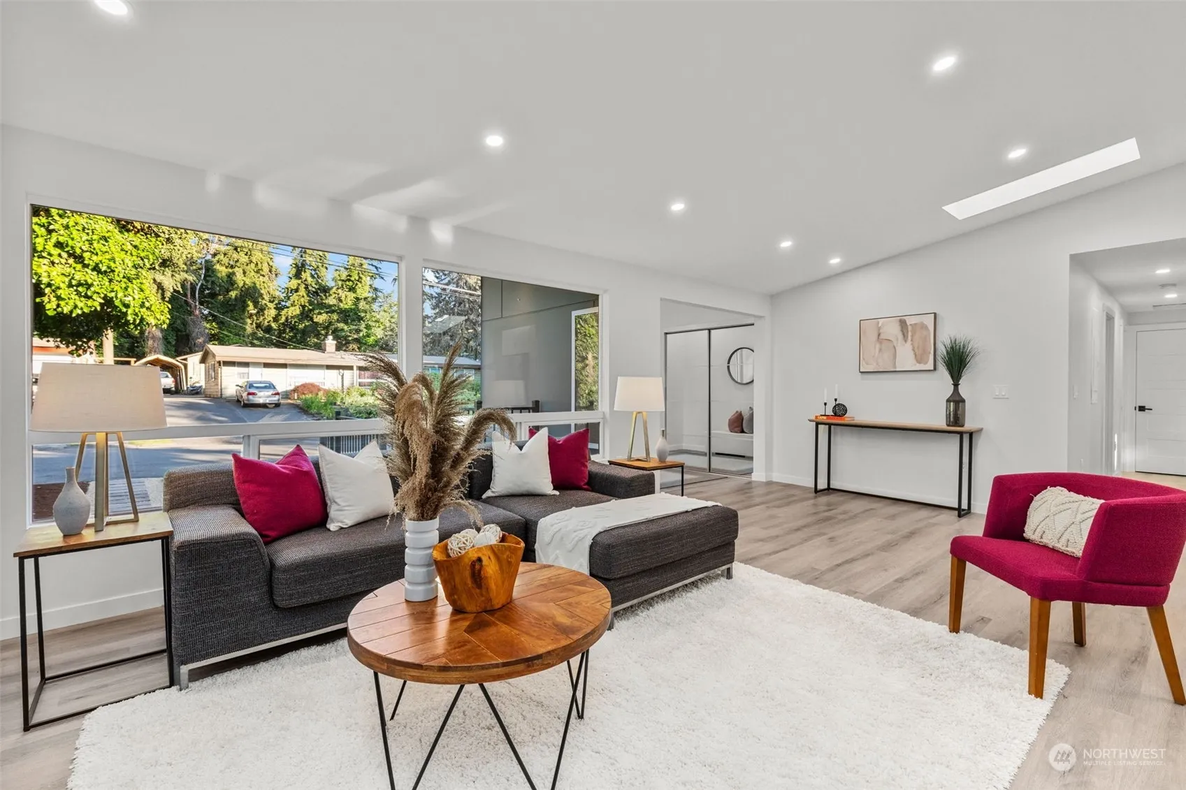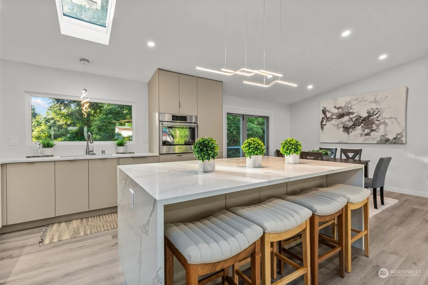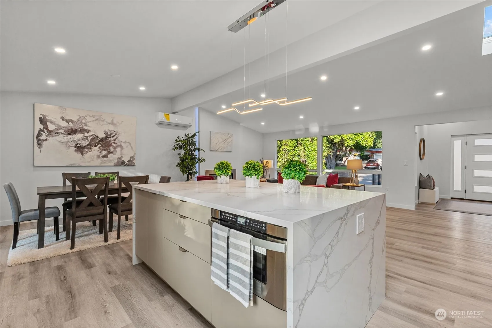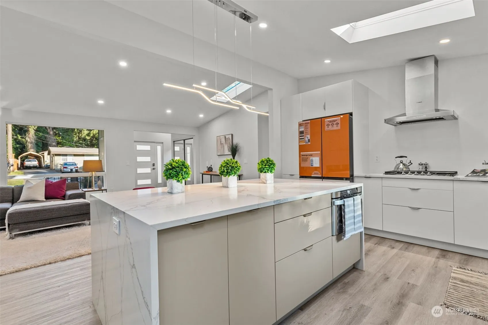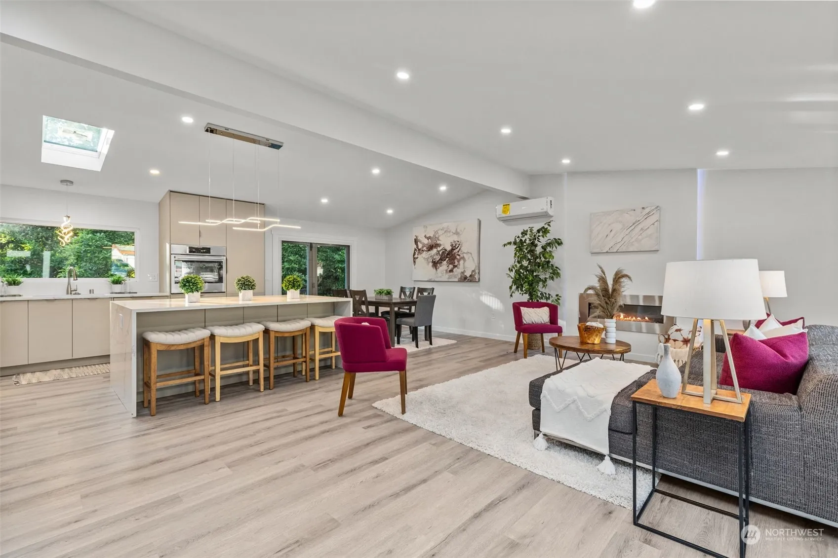 Experience modern luxury in this fully renovated home w/ an open layout featuring a state-of-the-art kitchen, SS appliances, wood flooring & sleek waterfall island. Cozy up by the fireplace or bask in natural light pouring through expansive windows. Upstairs: Primary bed w/ en suite full bath, 3/4 guest bath, 2 guest bedrooms, utility room & kitchen-connected deck. Downstairs: ADU 2nd exterior entrance, 2nd primary suite w/ 3/4 bath, 2nd utility room, 2 guest rooms, full bath & a full kitchen in an open living space. Metered separately—perfect setup for multi-generational living or rental income. Alternative floor plans can be completed by seller. A/C, wall heaters, new roof, new electrical/plumbing, fenced yard, EV charger. Pre-inspected.