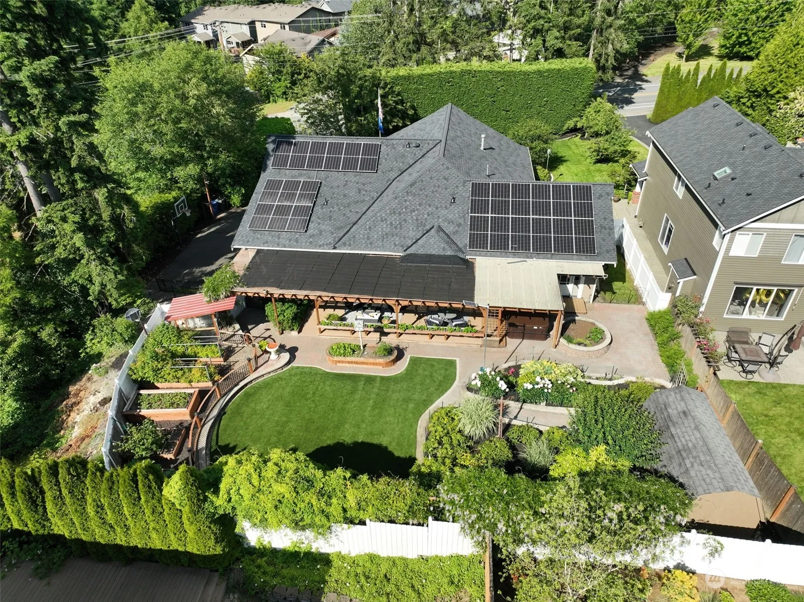 Nestled on a private .37-acre lot, this updated 4bed 3bath home blends luxury and comfort. The open-concept design features a custom kitchen flowing into a grand family room. The master suite boasts a walk-in closet and luxurious bath. Upstairs, find a 4th bedroom, a bonus room, and 300 sq. ft. of storage, plus potential for an ADU conversion. The 1,395 sq. ft. partially finished basement offers extra space. Outside, enjoy a backyard oasis with a covered porch, hot tub, outdoor theater, water feature, garden, artificial turf, and sprinkler system. Recent updates include a new roof, heat pump, central AC, air filtration, and solar panels. With a garage workshop, this home epitomizes luxury, convenience, and comfort.