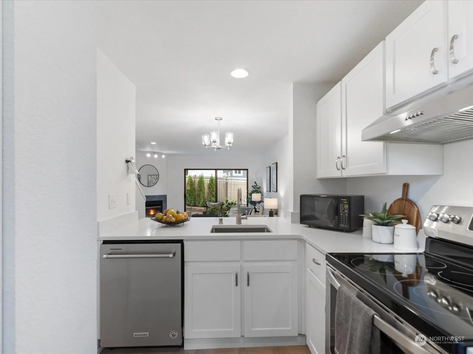 Outstanding Kenmore location, just 1 block from the Burke-Gilman Trail & near parks, park-n-ride, dining & shopping. This end-unit, 2-story townhouse is tucked back from the main road & backs to a wooded greenbelt for added privacy. Recent upgrades include quartz kitchen countertops, stainless steel appliances, & engineered hardwood flooring. Sun drenched living & dining room with a wood-burning fireplace. The primary bedroom fits king-sized furniture. Updated full bath. Features a private back patio, single-car garage w/an additional space, & storage. HOA dues include water, sewer, garbage, exterior, & grounds maintenance. Affordable & quiet with greenery & territorial views. Easy access to I-405, Lake Washington, & buses.