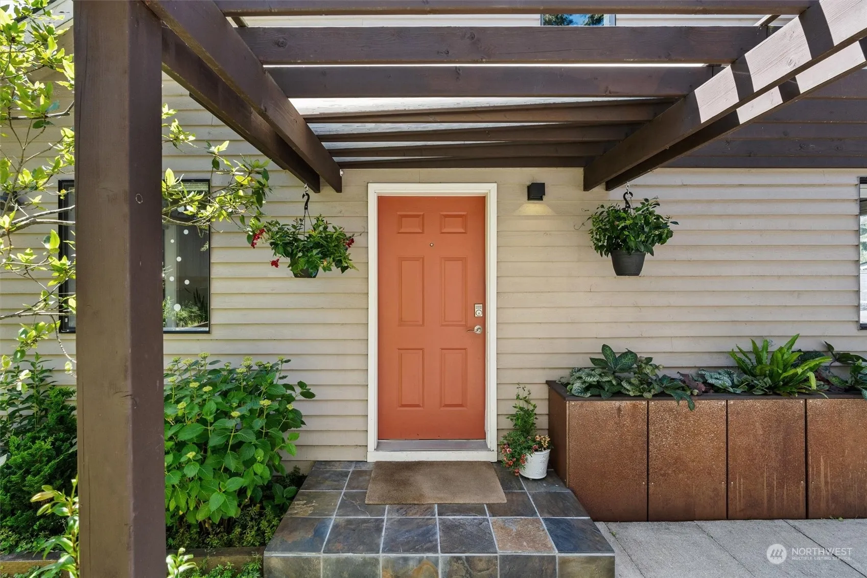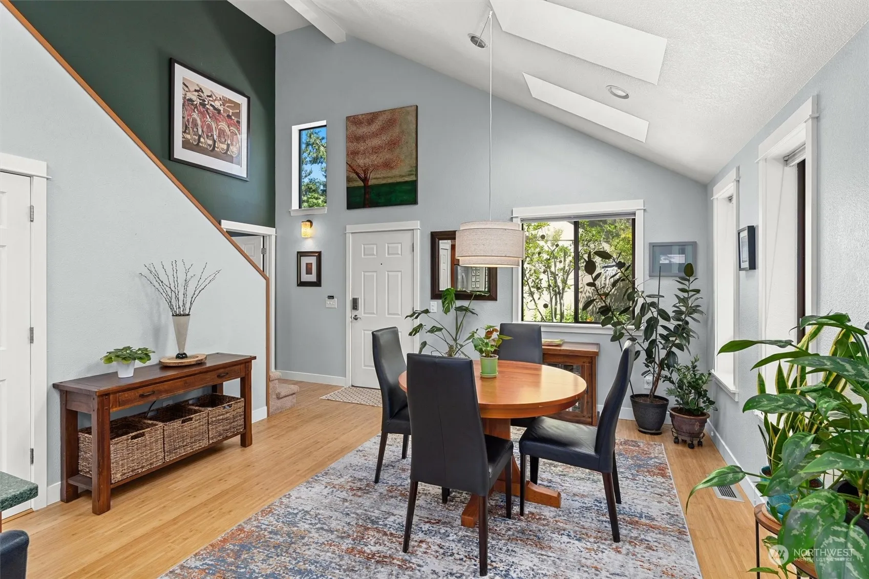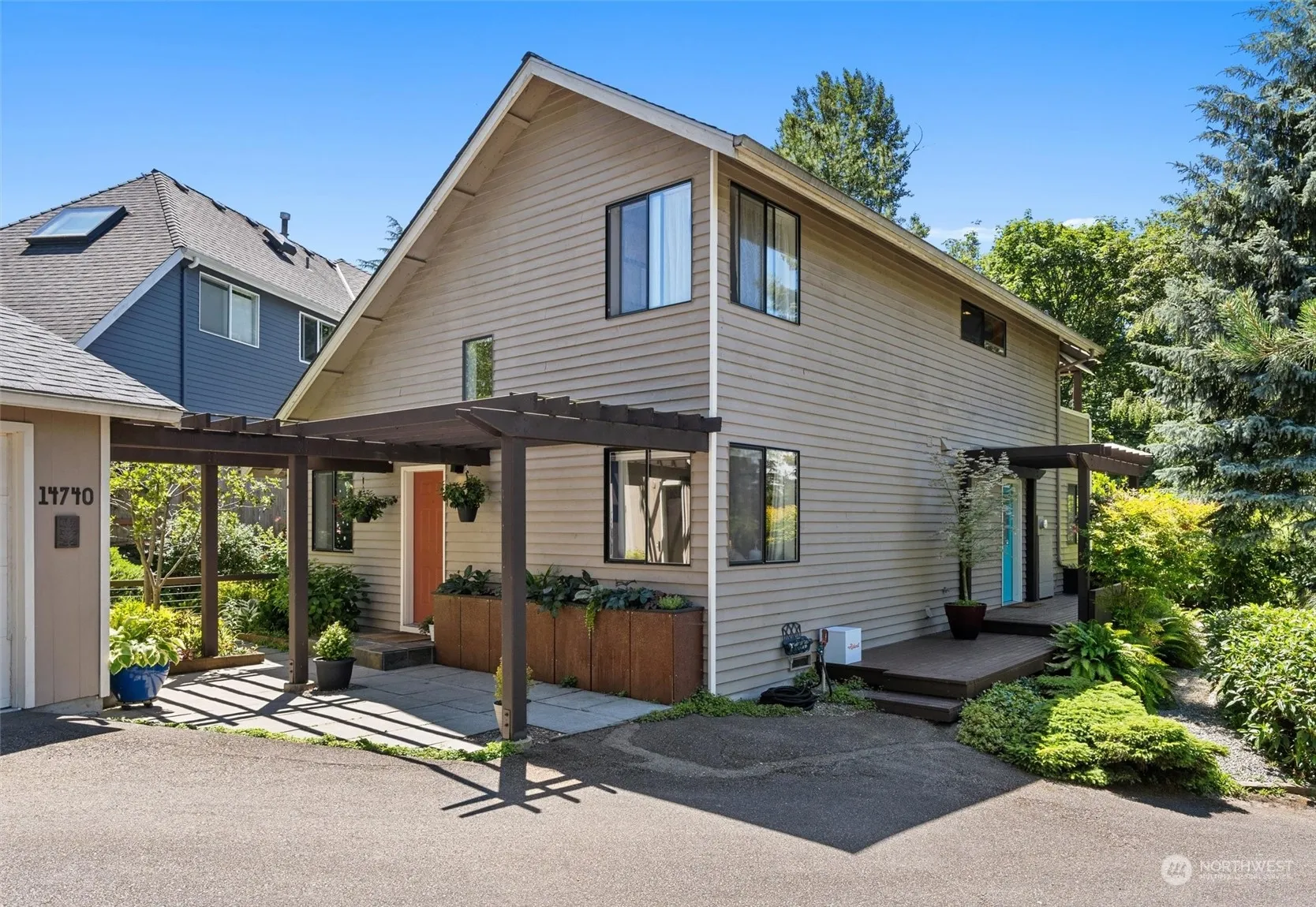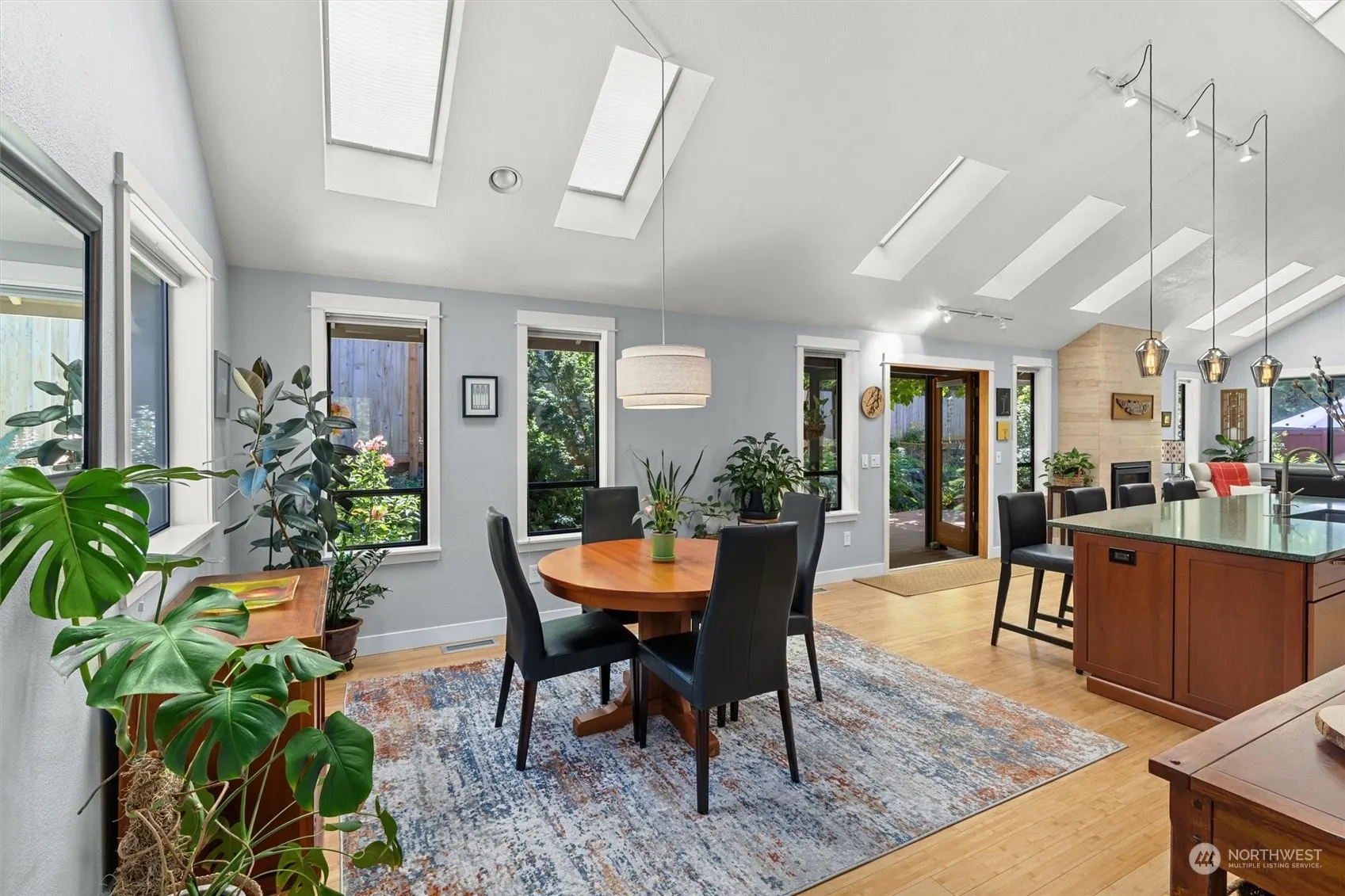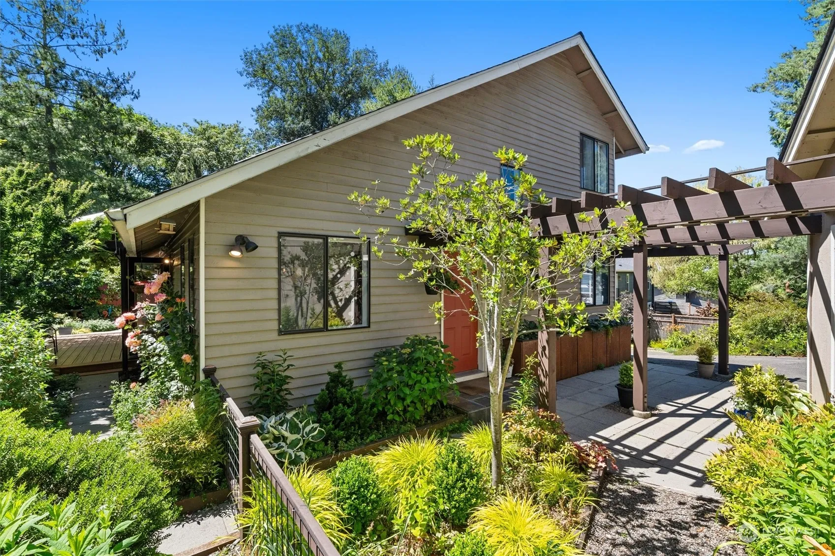 Welcome to this charming one and a half story home, a perfect blend of style and comfort. Step inside to discover vaulted ceilings and an abundance of natural light that enhance the open, airy feel. The heart of the home is the kitchen, featuring a center island, bar seating, and a spacious dining area—ideal for both casual meals and entertaining. The upstairs primary suite provides a private retreat, while two additional bedrooms on the main floor offer flexibility and convenience. Outside, enjoy the lovely gardens, a covered deck for year-round enjoyment, and a cheerful patio area perfect for relaxation. A detached two-car garage adds practicality. Perfectly located near parks & amenities, this home offers the very best of Kenmore living.