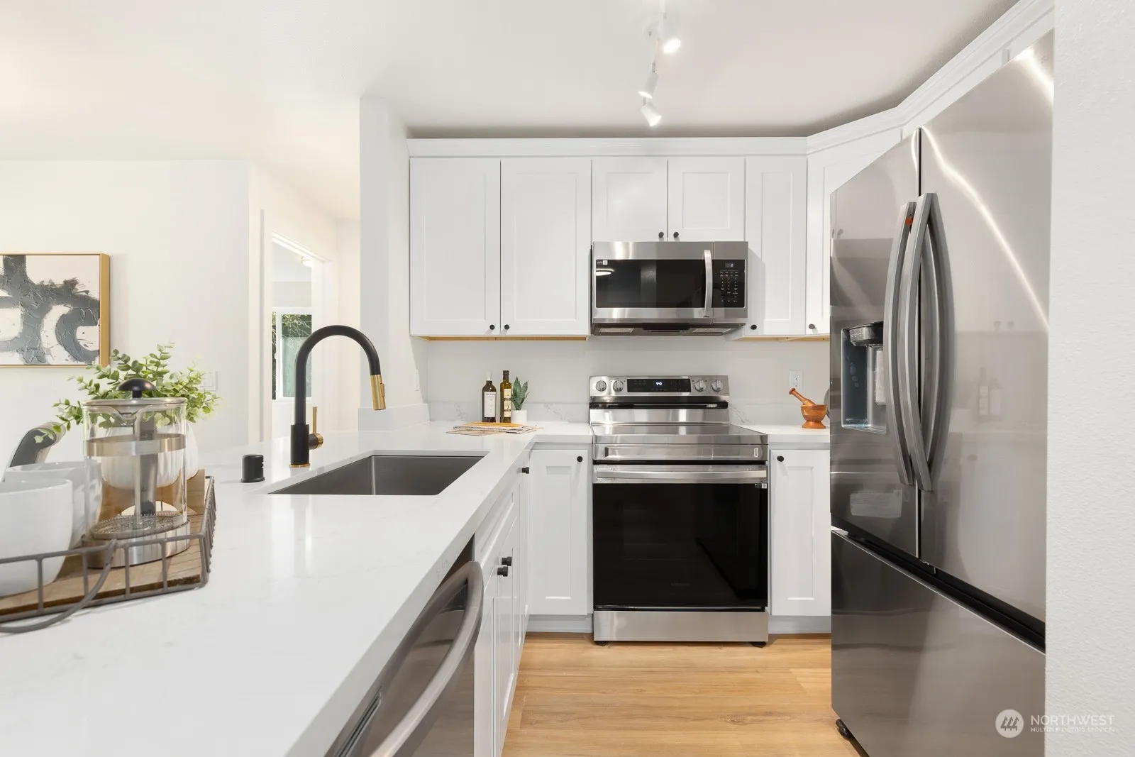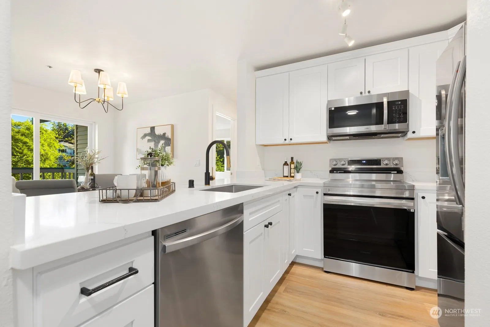 Beautifully remodeled 2BR/1BA condo in Inglewood Heights! Top floor, end unit boasts fabulous updates throughout. New vinyl plank flooring graces the main living spaces, while plush carpets comfort the bedrooms. The well-appointed kitchen features bright quartz countertops, white cabinets, & stainless steel appliances. The lovely full bathroom has quartz countertops & white cabinets. Enjoy cozy nights by the beautiful fireplace. Step outside to your private balcony off the dining room for a breath of fresh air. Full-size washer and dryer in the oversized laundry room offer convenience. New double pane windows & a sliding door keep the condo warm, bright, & energy-efficient. Close to shopping, restaurants, and parks. Don’t miss this gem!