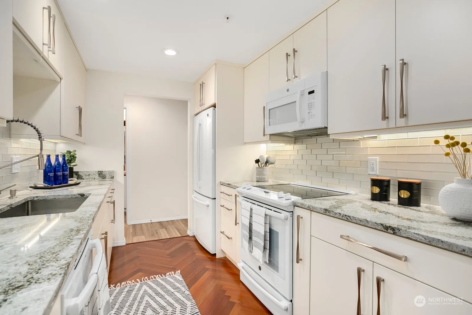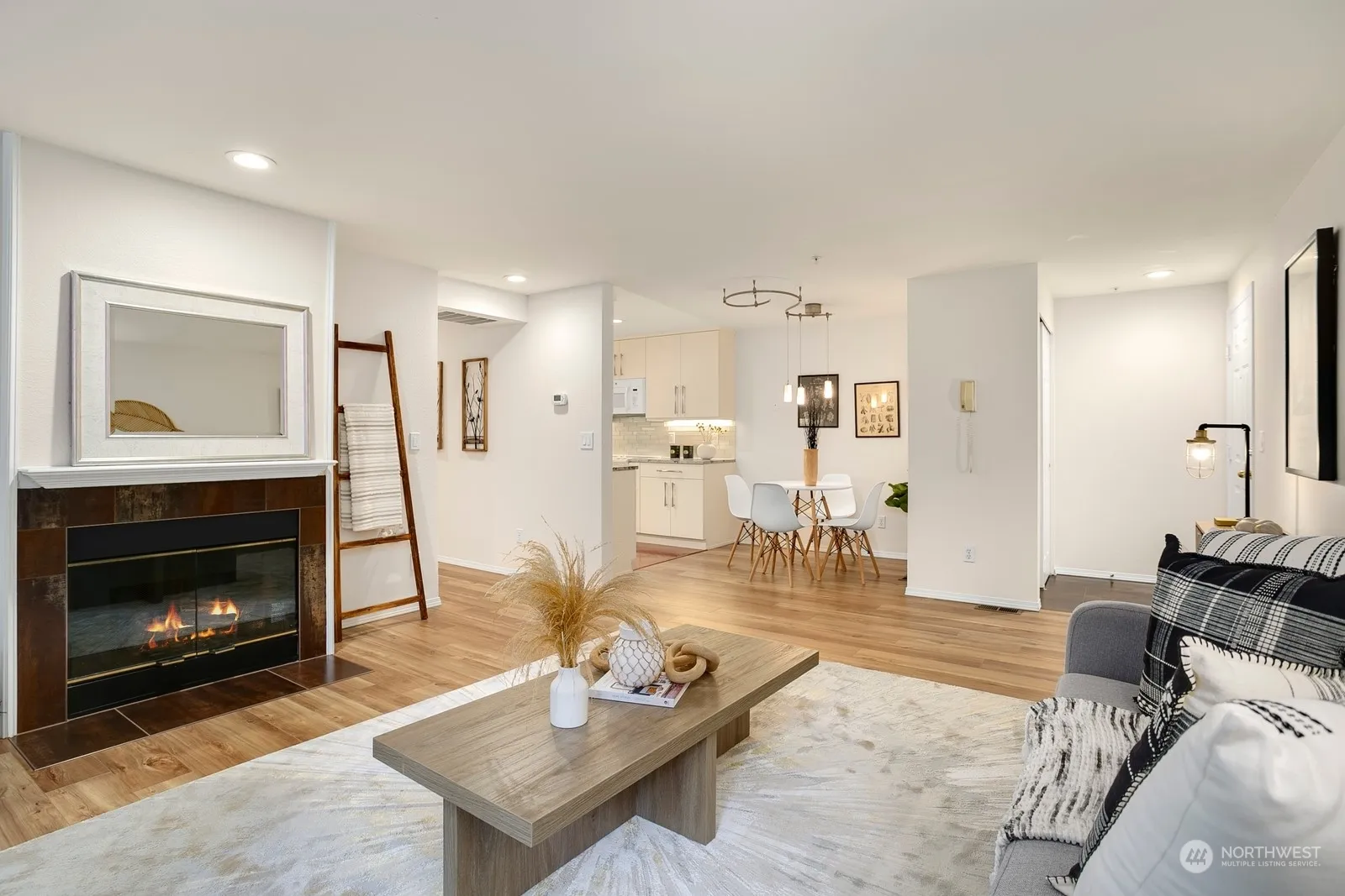Immaculate condo with strong HOA in highly walkable Kenmore location. Secure entry leads to a beautifully updated interior with fresh paint throughout. The remodeled kitchen features quartz countertops, modern cabinets, & lighting. Cozy gas fireplace, large double-pane windows with a private, treed view, LVP plank flooring, and newer carpet in bedrooms. Spacious primary bedroom has 2 closets & ensuite bath w/ walk-in shower. Bathtub/Shower in hall bath. Stackable in-unit Washer/Dryer. This modern 9-unit building offers a secure garage and free street parking. Big dogs OK – no weight limit on pets. 1 pet allowed. 3 blocks from Library, Post Office, Park, Restaurants, The Hangar, Safeway, Burke-Gilman Trail. 1-Yr Buyers Warranty included.