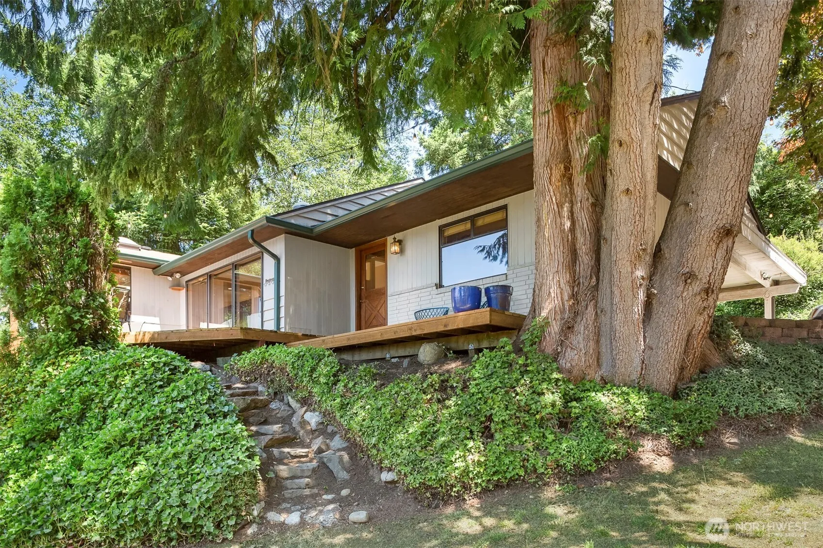 Stunning three-bedroom rambler perched above large private yard in the heart of Kenmore & stellar Northshore School District. Home has been updated and has an abundance of space & natural light flowing inside through massive windows. Live large in the open-concept kitchen with island & eating bar. Two spacious living rooms, one on each end of the home, allow plenty of space to unwind. Gorgeous hardwoods. Primary suite & ensuite bathroom. Separate work-from-home office with tranquil garden views. Massive two-tiered deck for sunbathing and summer gatherings. Two fireplaces for cold winter nights & AC when warm. Yard has space for gardening, pets & play. Tons of driveway parking for your boat, RV or car collection. EV Charger. Fully inspected.