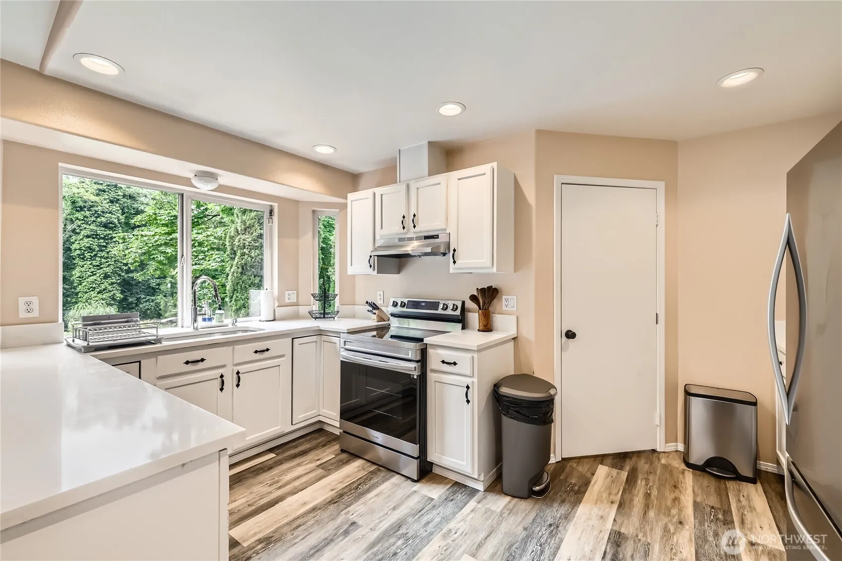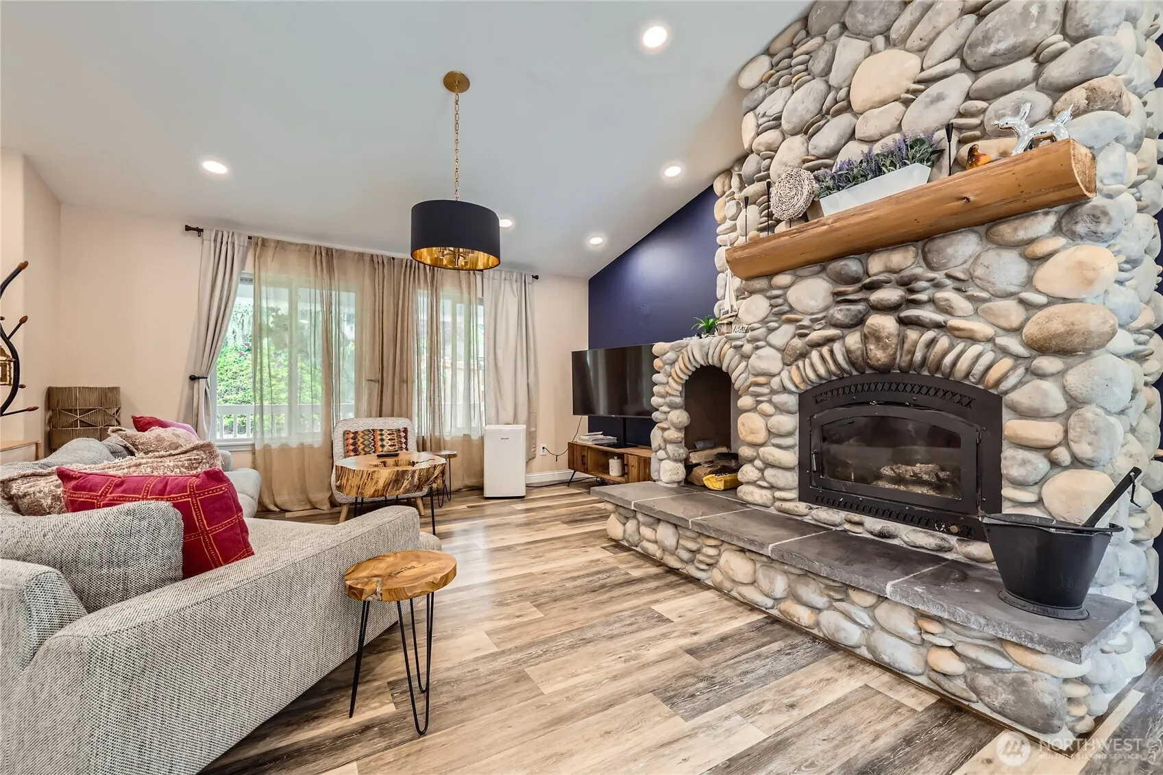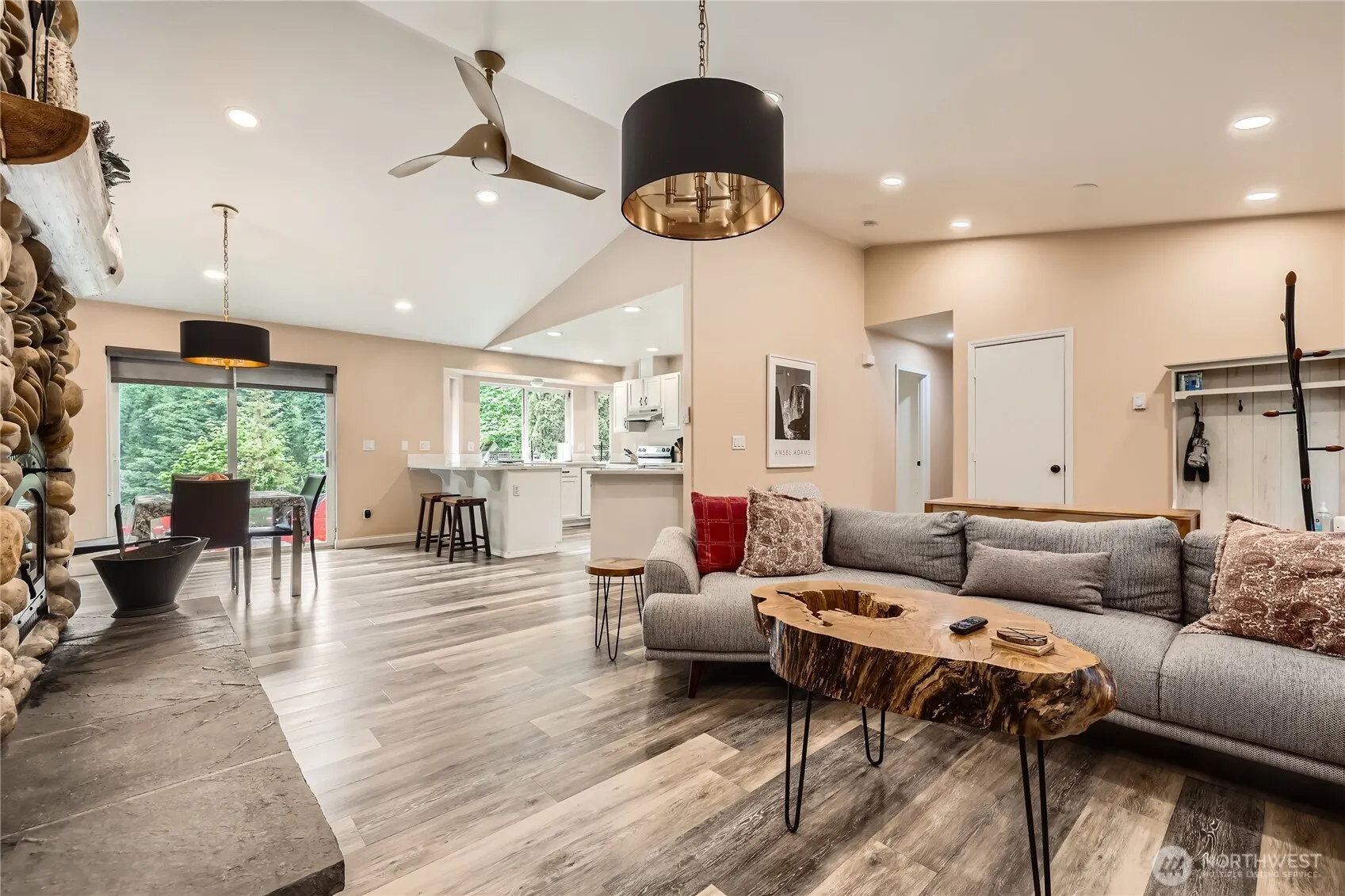 Builder Opportunity! This rare .77-acre corner lot in Kenmore offers development potential for 3 single-family homes or 5 townhomes (see photos for concept). Build now or hold for future investment. The well-maintained 1-story home features vaulted ceilings, a stone-surround wood-burning fireplace, new quartz countertops and shower walls, luxury plank flooring, and a spacious open-concept great room. Enjoy the large patio and covered front porch—perfect for outdoor living. A completed wetland study with setback delineation is available. There is separate outbuilding/office with surrounding deck. New Appliances. Currently operating as a successful Airbnb