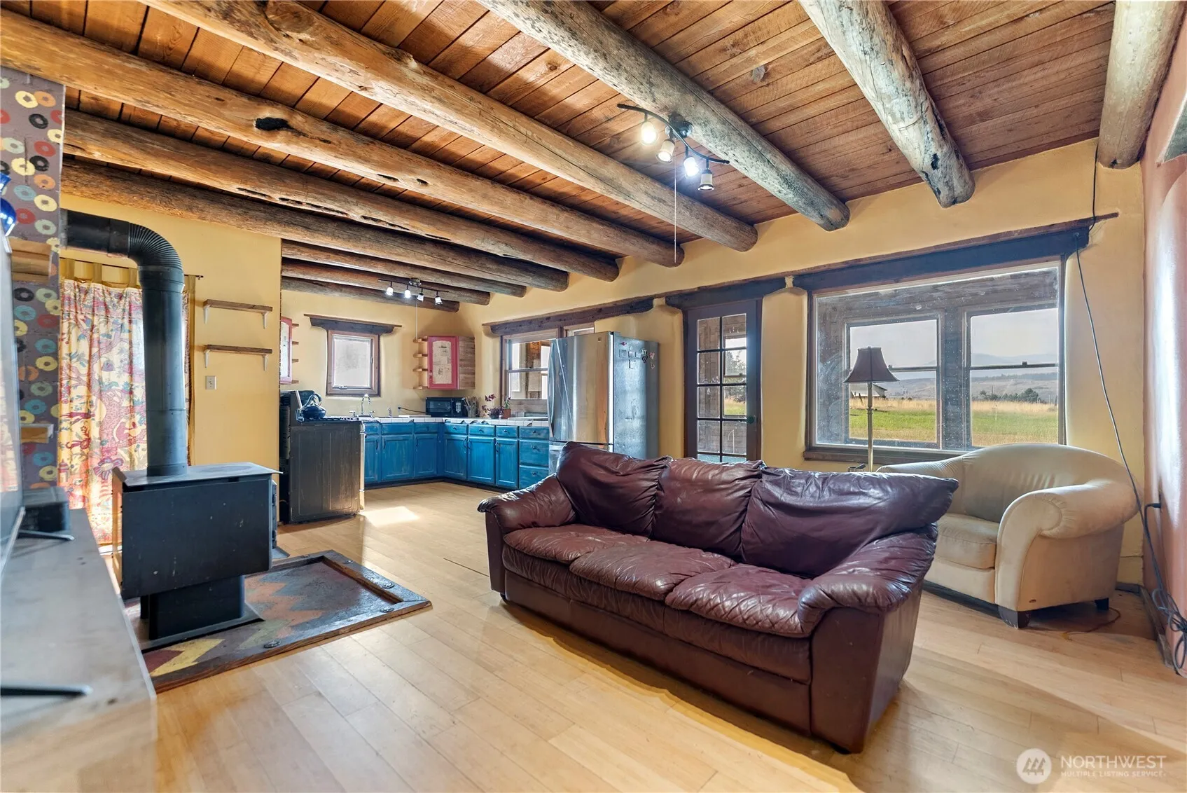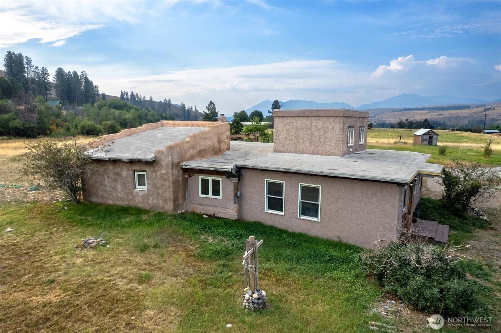 Bring your vision and build equity! This distinctive 1989 Winthrop home, crafted by local builder Doug Potter, showcases lasting quality with open beam ceilings, thick stucco walls, and artistic stacked log accents. Offering 3 bedrooms, 2 baths, a spacious laundry room, partial basement, and a light-filled second-floor study overlooking pastoral views, the home provides ample space for full-time living. This 3.7-acre flat parcel, irrigated by the Chewuch Canal, has the potential to become entirely green and could easily support a hobby farm or garden. A 875 sq ft outbuilding with power is ready to transform into an office, studio, or gym. Thoughtful improvements here will reward you well in this beloved corner of the Methow Valley.