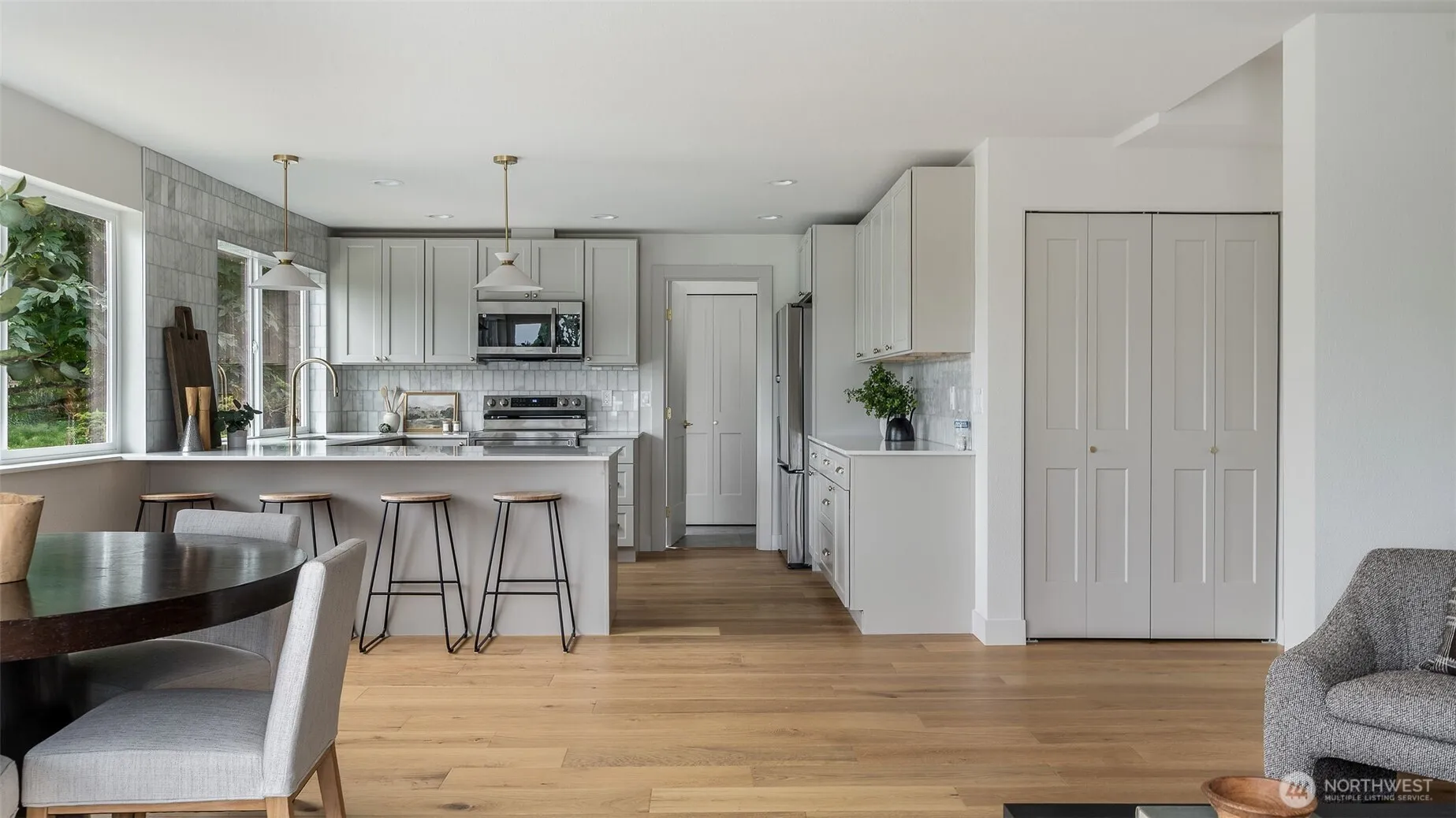Completely renovated from top to bottom, this spacious and versatile 5-bedroom home is nestled on a generous .26-acre lot in a peaceful Kenmore neighborhood. Boasting beautiful territorial views, this 3,080 sq ft property features newly refinished engineered floors and quartz counter tops upstairs, luxury vinyl plank floors downstairs, new carpet in bedrooms, new windows, appliances, light fixtures and more. Each area offers room to grow, including 2 full baths, a large living area, and flexible spaces for work, play, or multigenerational living. Enjoy outdoor living with 2 patios and a private backyard. Attached garage plus ample driveway and street parking. Conveniently located near parks, top-rated Northshore schools & commuter routes.
