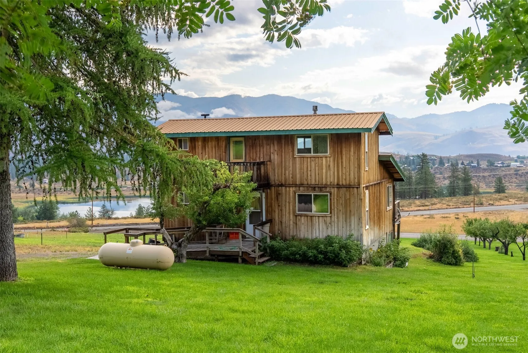 Twin Lakes View Home on 5+ Acres – just south of Winthrop, this 2 bedroom home overlooks Twin Lakes with sweeping views from front deck. The property features a spacious yard with fruit trees, garden area and direct western border with State Land. Practical amenities include an attached one car garage on the lower level and large equipment storage shed uphill from house. Handicap ramp on 2nd level. Enjoy close access to Patterson Lake, Sun Mountain Lodge and all the outdoor recreation the Methow Valley has to offer. Can receive internet connection.