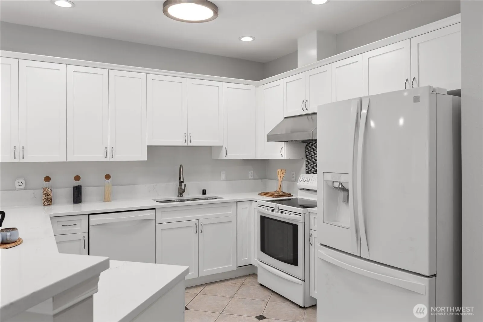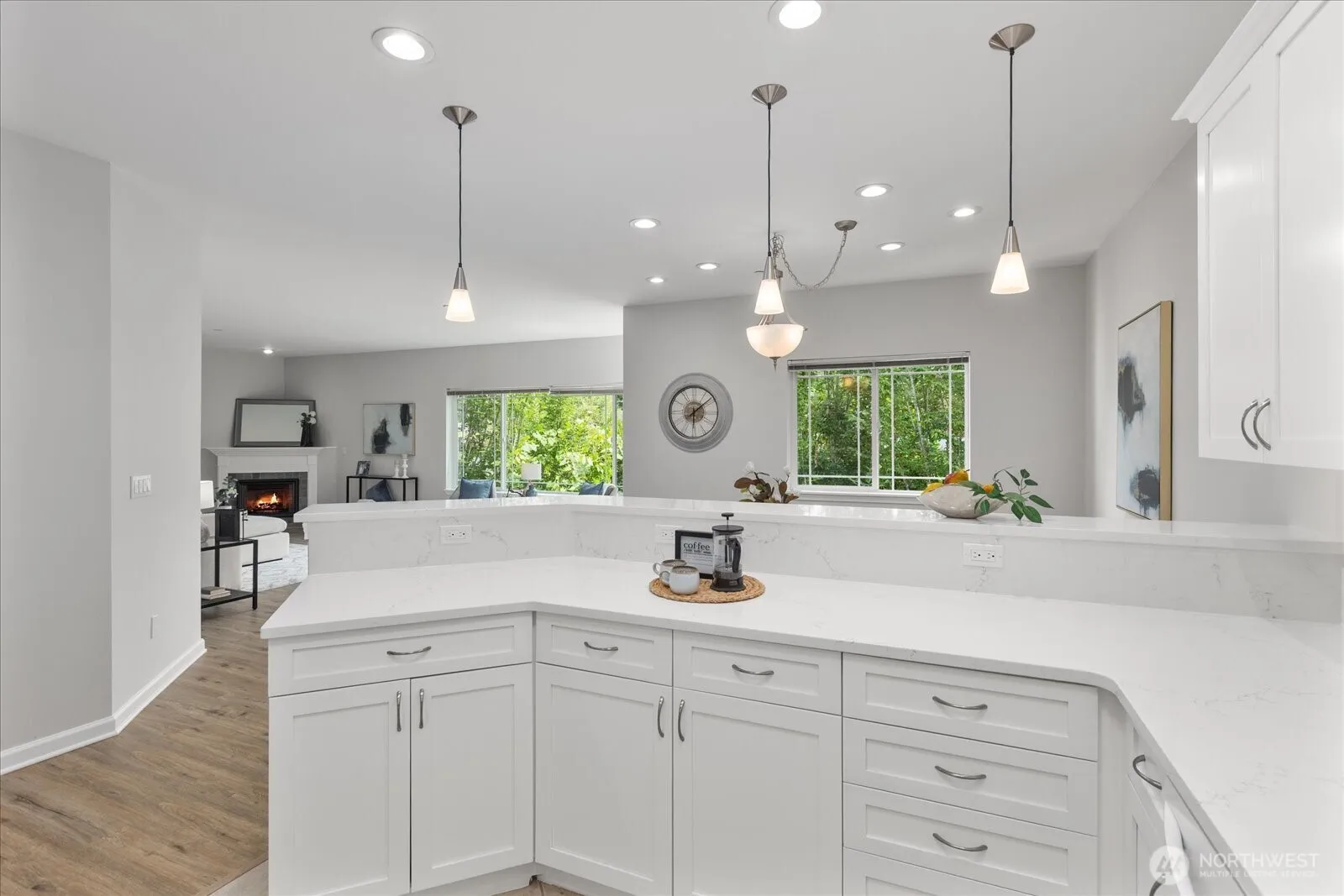 MAGNIFICENT 1372 sqft, 2-bdrm, 2-bath, REMODELED, TOP-FLOOR Kenmore END-UNIT! Sunlight fills the 9-FT CEILINGS & sweeping OPEN FLOOR PLAN! Enjoy lush verdant views from private BALCONY or any window! Brand NEW QUARTZ COUNTERTOPS plus crisp white trim & appliances compliment the FRESHLY PAINTED designer color interior. Electric FIREPLACE in living room & NEW LUXURY VINYL PLANK FLOORING! Handy WINE FRIDGE by dining room! WALK-IN KITCHEN PANTRY & storage space! Private Primary suite has DUAL VANITY, SOAKING TUB & a WALK-IN CLOSET w/ BUILT-INS. FULL SIZED W/D. Detached 1-CAR GARAGE, plus 2 PARKING SPACES in the GATED COMMON GAR w/ ELEVATOR! Easy access to transit, parks & amenities. NO rental cap, NO special assessments! Incl a 1-yr HOME WARR!