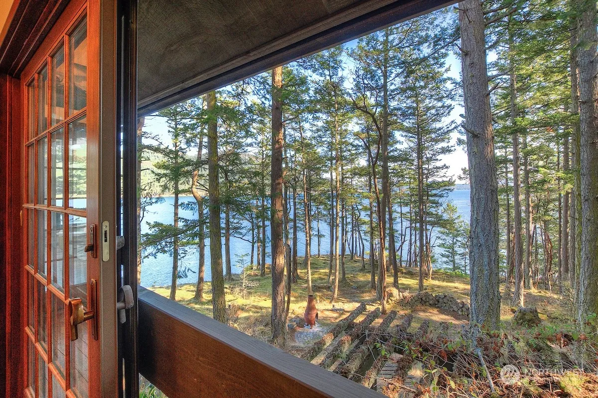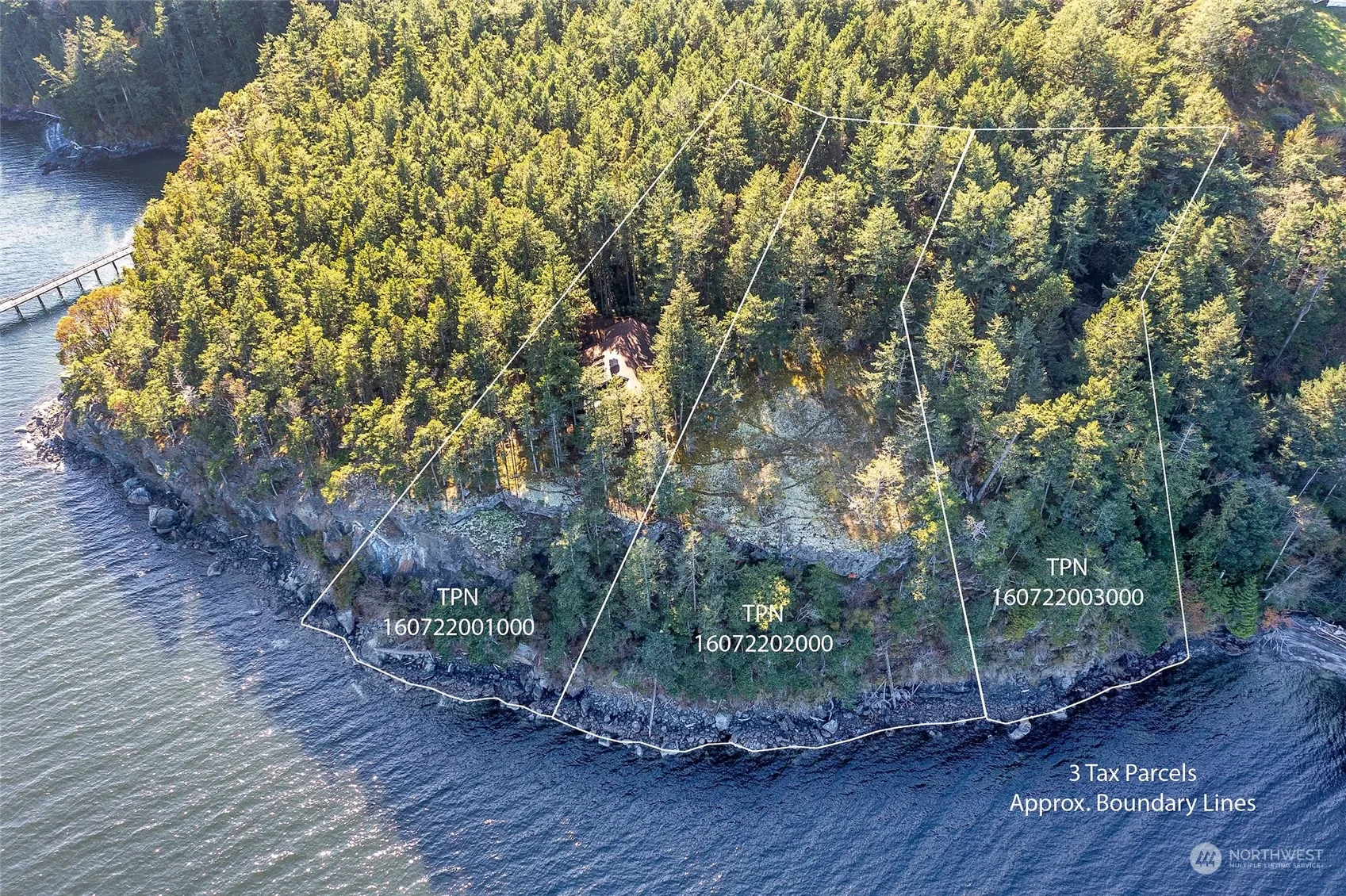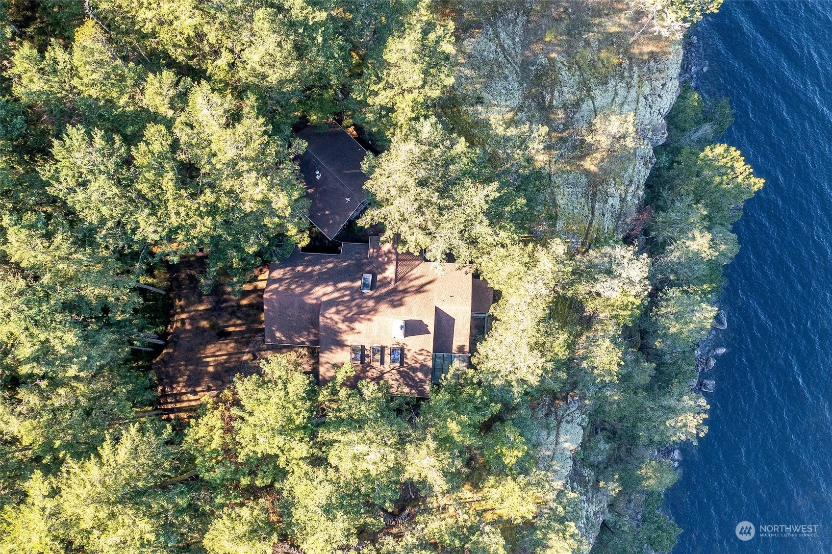Sweeping East Sound views north to south from a Roy Lundgren designed custom home on a private high bank waterfront site off Dolphin Bay Rd. End of the road privacy on a mossy bluff with paths to seating areas and captivating views. The main home has marine views from all rooms and lots of windows opening to allow the sea breeze to waft through. The primary bedrm w/ window seat is on the main level. Brick paths meander between buildings and to the shoreline with sunrise views over Mt. Constitution.The detached guest house has a full kitchen, 3/4 bath, Murphy bed plus sleeping loft. Private well, attached 2 car garage.Two additional waterfront tax parcels are available separately from the same Seller (MLS#2241446).