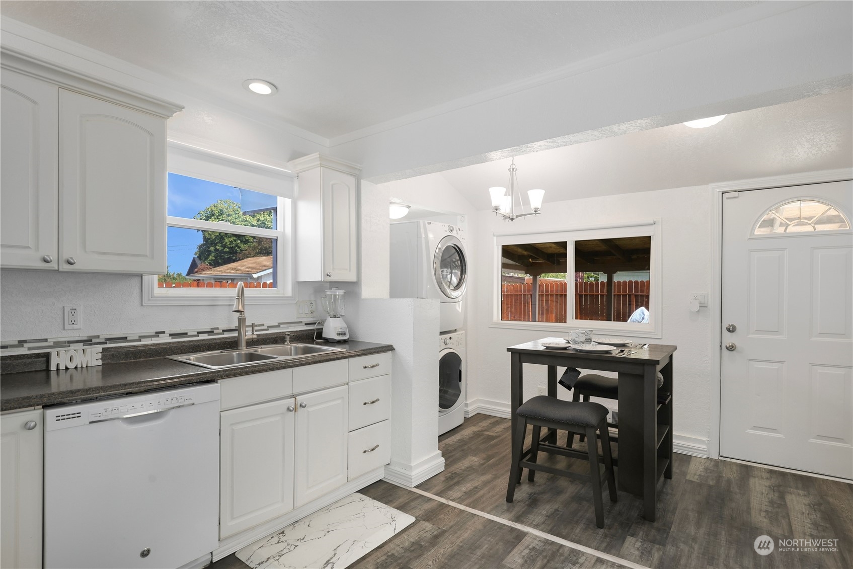 This bungalow is move-in ready and freshly painted. Cozy living room has new laminate flooring. All furniture, including the portable electric fireplace included. Mill work around doors and crown molding adds character. Kitchen has Corian counters, ample cabinet space and plenty of room for your dining table. Refrigerator is 2 yrs old. Bathroom was taken down to the studs and completely remodeled. Bedroom 1 has portable clothes rack that stays or add your own clothing rod. Newer (2 yrs) laminate flooring in both bedrooms. Fully fenced yard and covered patio for outdoor enjoyment. Shed has electricity and finished drywall inside. 1 car garage accessed from the alley includes a parking pad outside. Easy access to freeway, shopping, etc.