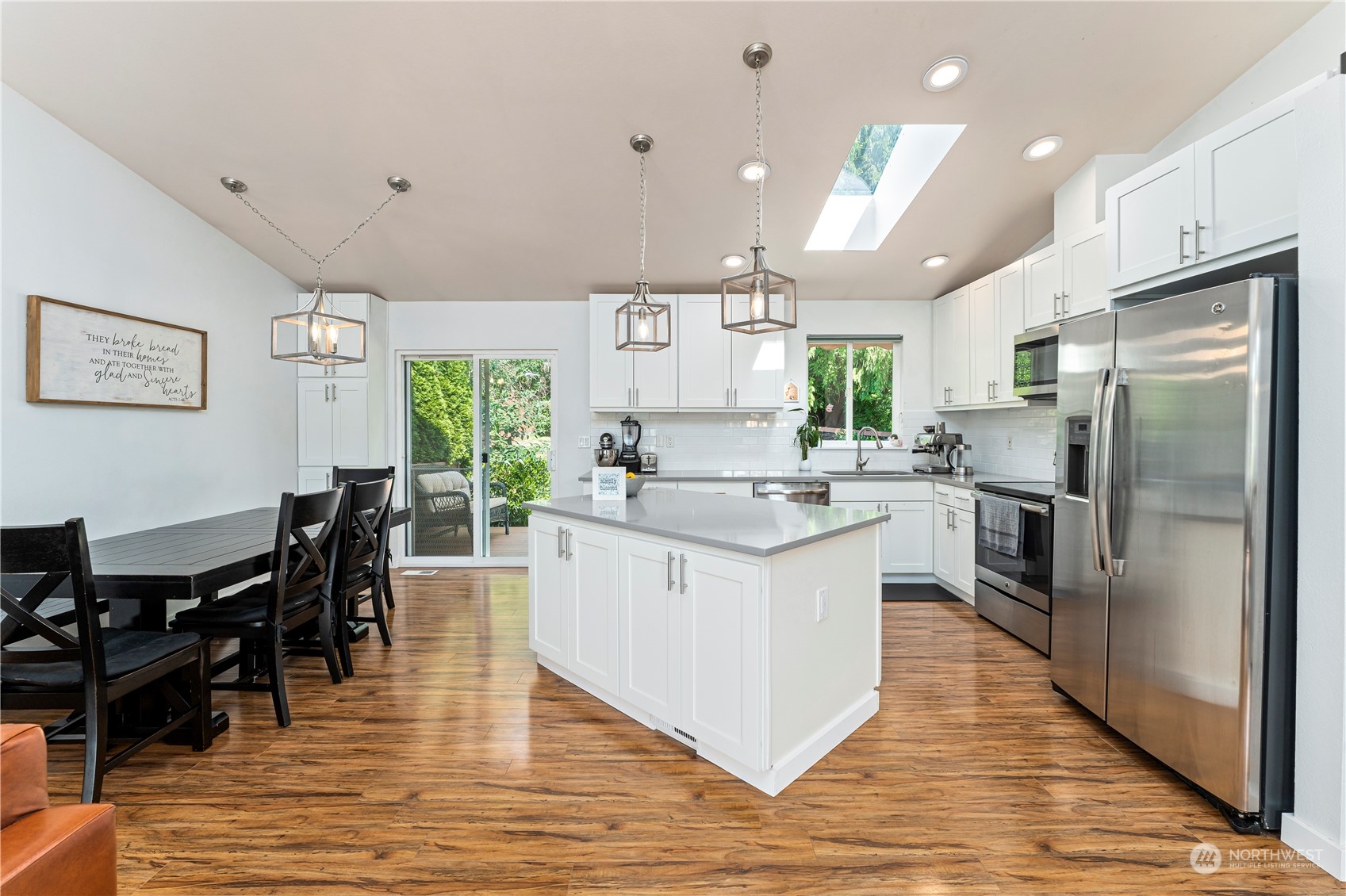 Welcome to your newly upgraded oasis! You’ll be greeted by vaulted ceilings that enhance the allure of the open-concept layout. The kitchen is a vision in white, featuring exquisite cabinets, stylish tile backsplash, all bathed in natural light. Primary bedroom suite is a sanctuary of luxury, with French doors that lead to the serene backyard retreat. Upstairs, you’ll find 2 additional bedrooms and a full bathroom. Lower level features a generous fourth bedroom, a cozy family room, and a convenient ¾ bath. This home has been thoughtfully updated with new flooring throughout, a new roof & heating/AC system for your peace of mind. Your outdoor oasis awaits with a delightful yard, spacious deck, and a picturesque greenbelt as your backdrop.
