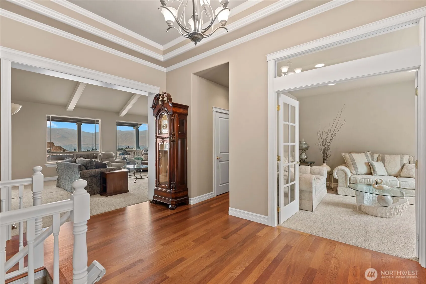 Stunning daylight rambler located in desirable Briarwood. Elegant entry with high ceilings, hardwood floors, exquisite crown molding and millwork. Great room features vaulted ceilings with many beautiful windows overlooking the gorgeous mountain views. Spacious kitchen features stainless steel appliances, large center island and custom cabinets. Main floor primary suite with double vanities, shower, tub and access to the view deck. Lovely Main floor den with French doors. Downstairs features 3 more bedrooms and two baths plus large family room with stone fireplace. 3 car garage plus covered RV parking. Many different outdoor spaces to enjoy the views and peaceful setting. This home will not disappoint!