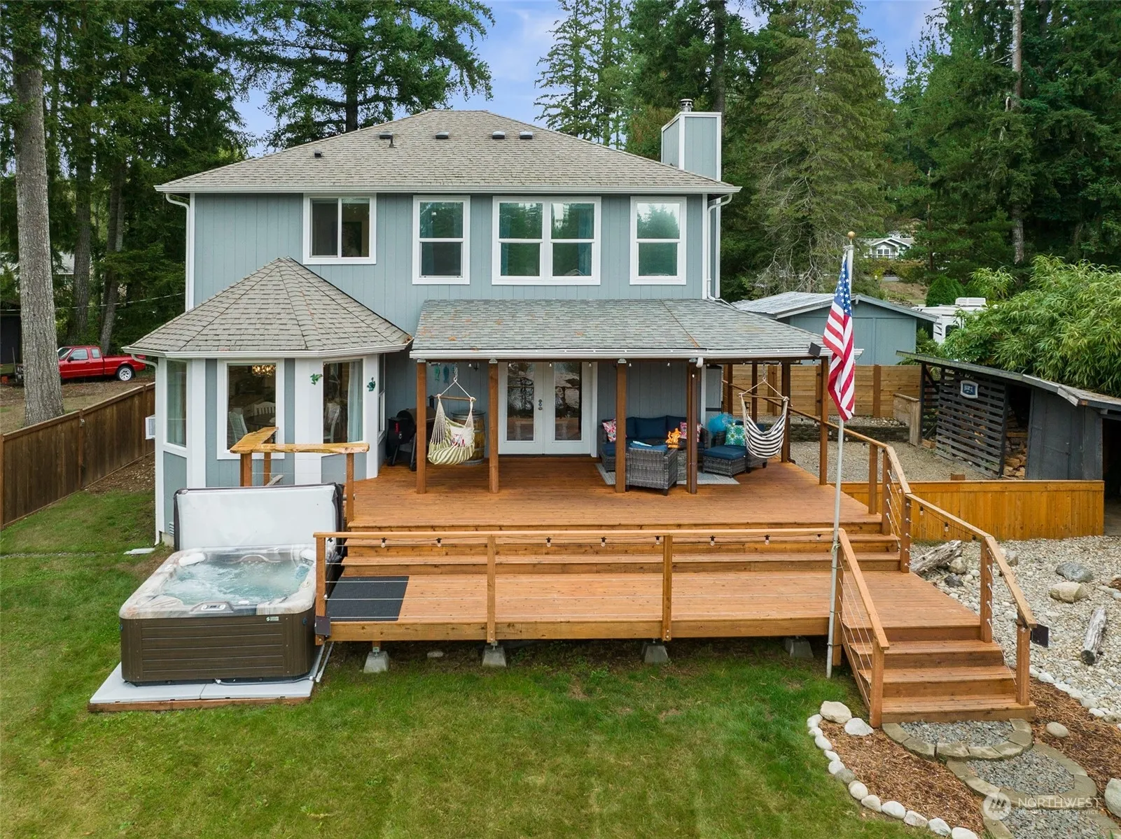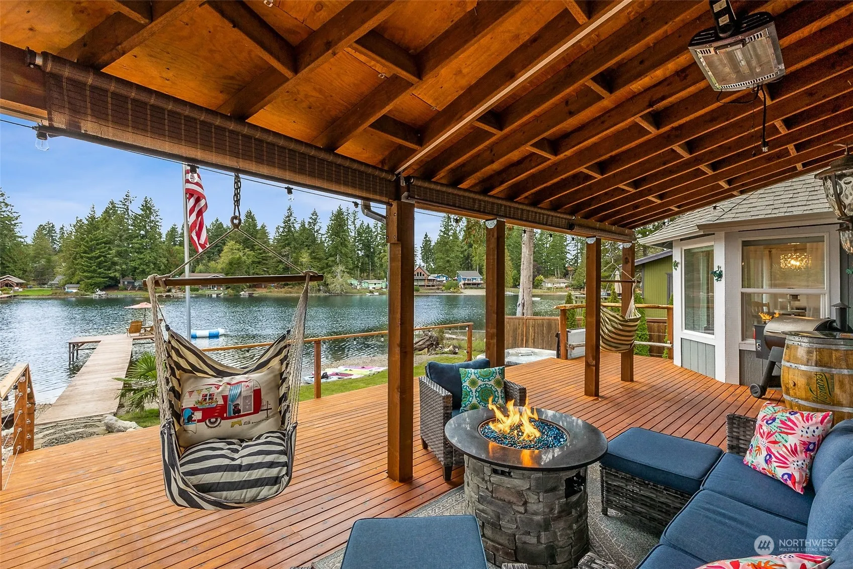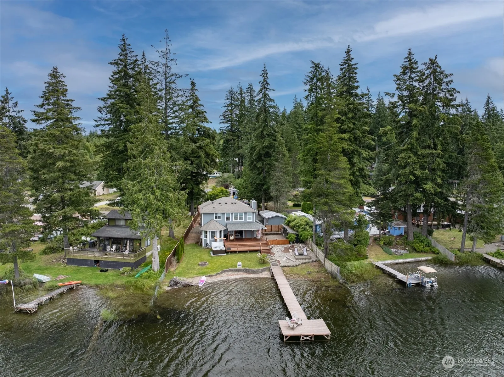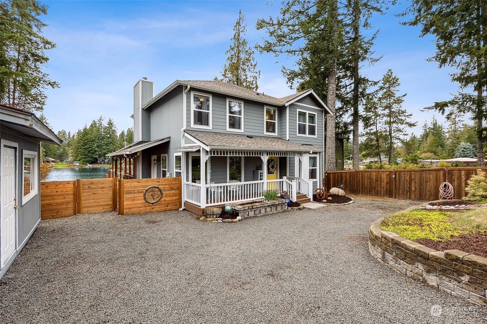 Experience lakeside living with the water just steps from your door! Sleek finishes & abundant natural light, modern kitchen w/ granite countertops, luxurious bedroom suite w/ ensuite bathroom & California closet, plus a cozy living room with wood stove—all overlooking breathtaking lake vistas. Step outside to a pristine lake, your own private dock, & a spacious deck w/ top of the line hot tub, ideal for summer fun, relaxation, & entertainment. The lake, known for its exceptional cleanliness, offers the ultimate backyard pool experience, perfect for swimming, kayaking, & fishing enthusiasts—stocked 3x yearly. Also includes carport, 2 storage buildings.