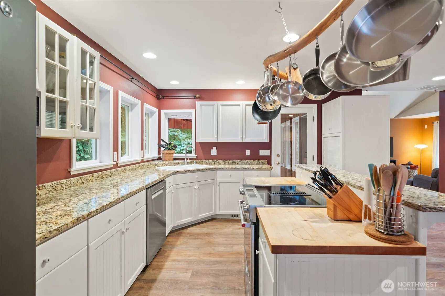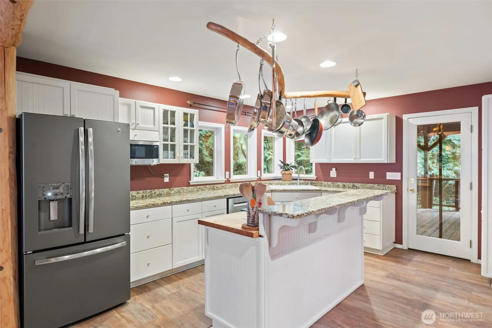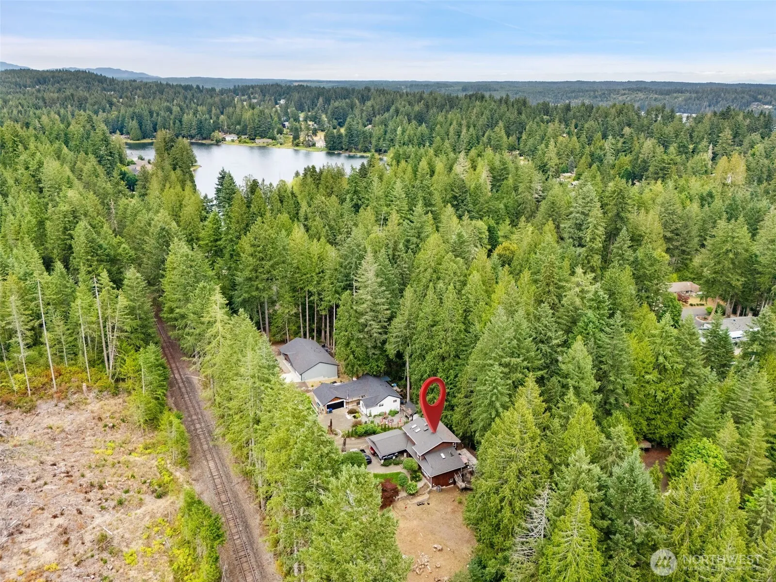 Custom Lakeland Village home on a rare double lot, showcasing true Northwest style with cedar siding milled from trees on-site and a handpicked river rock hearth. The main floor features an open kitchen flowing into the dining and family room, a vaulted living room filled with natural light, half bath, and utility room. Upstairs offers two guest bedrooms, a full bath, and a primary suite. The finished daylight basement with separate entrance offers a large room for versatile use and an additional office space. On a quiet street with a creek in back, near the Lake and 27-hole golf course.
