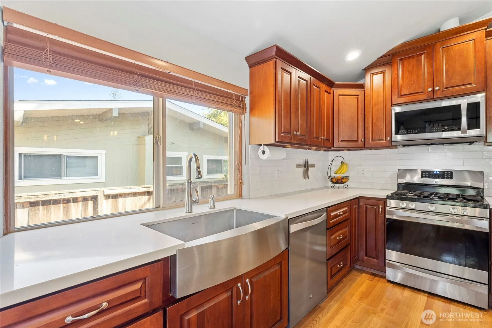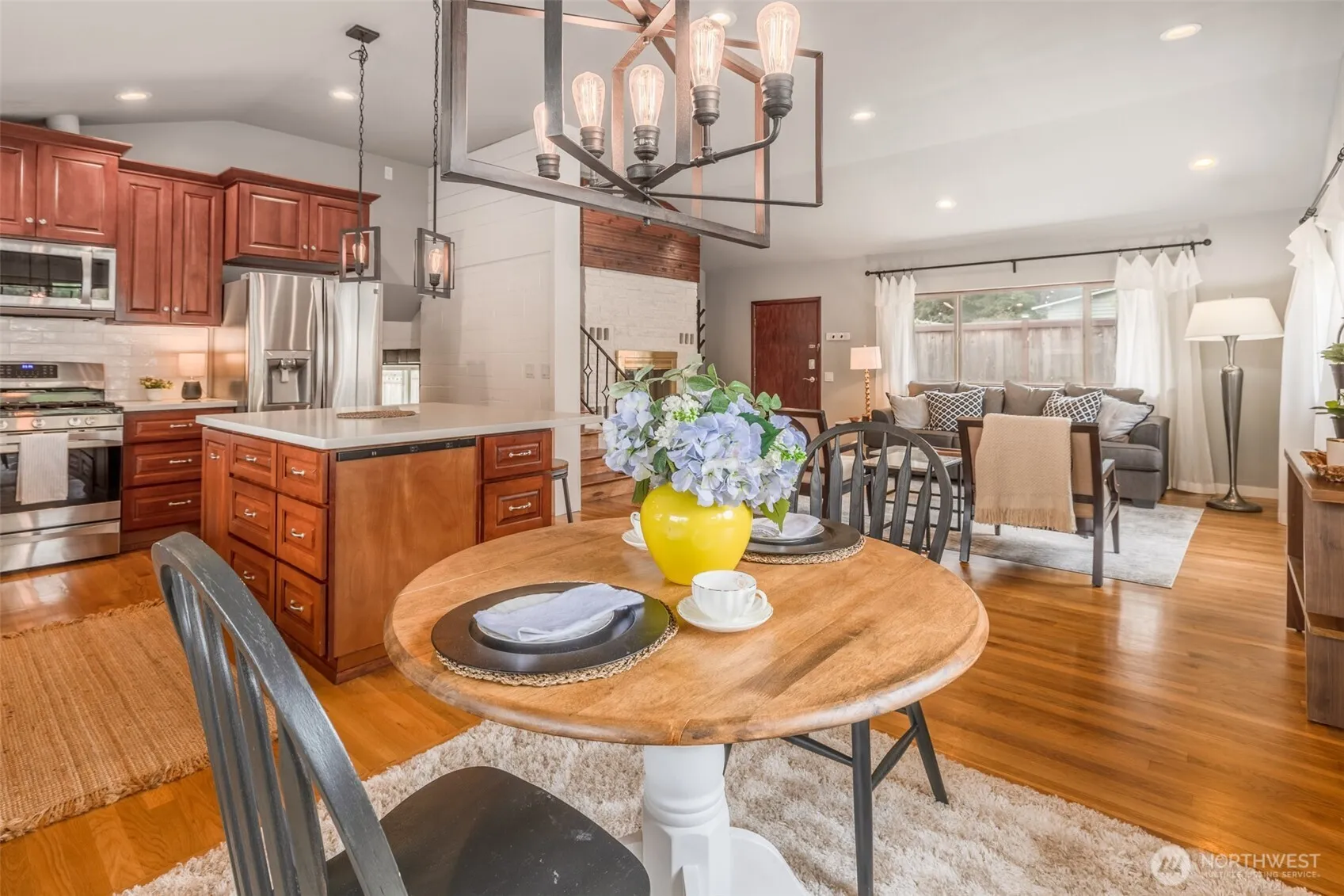 Located on Burien’s alluring Gregory Heights hill, this updated mid-century tri-level blends rustic charm with modern comfort just minutes from Seattle. The open main level features vaulted ceilings, premium white oak hardwood floors with Japanese Maple stair treads, quartz counters, stainless appliances, and a stylish island. The lower level offers flexible space ideal for potential multi-generational living. Enjoy year-round comfort with a tankless water heater, gas heat, and mini-split A/C. Entertain guests on the beautiful large patio with terraced lawns. Ample parking includes RV/boat space, and a 10’x20’ outbuilding with 16’ ceiling. A must-see gem!