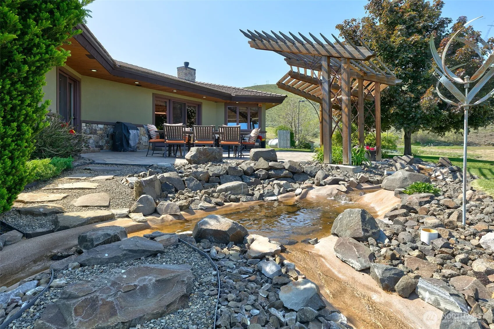 Luxury meets mountain charm in this hillside Yakima estate. Copper-clad garage doors, arched stone entry, and a backyard waterfall set the tone. Inside, enjoy solid Hickory floors, knotty alder trim, and copper accents throughout. The main level features a sunlit living room with sweeping valley views, a gourmet kitchen with Vulcan Gold granite, and a spacious primary suite with patio access. The daylight basement includes a media room, second kitchen, and two bedrooms—ideal for guests or multi-gen living. Outside: multiple patios and a deck at the bottom of a cascading waterfall, firepit, pickleball court, and 40×30 heated shop.