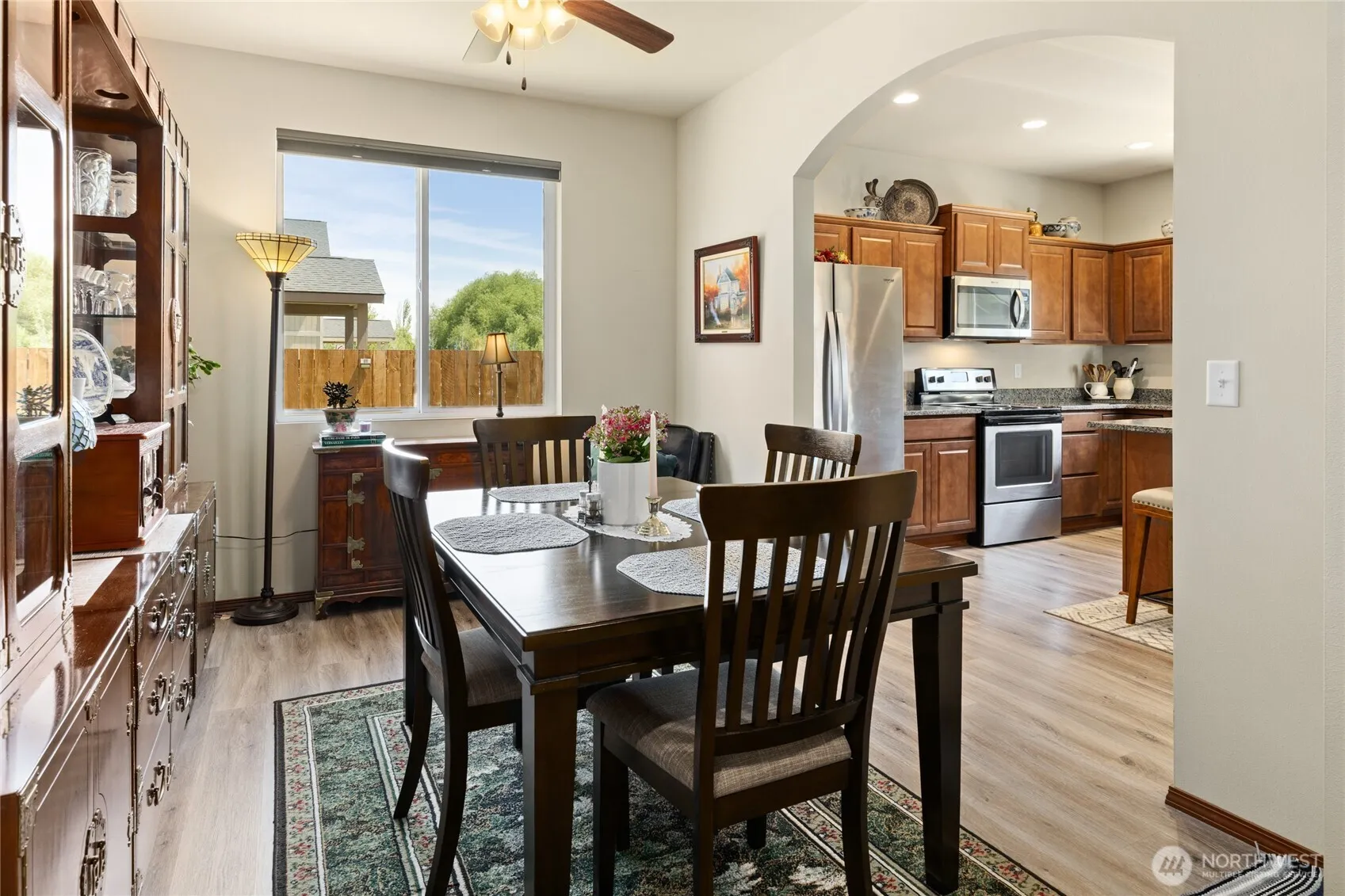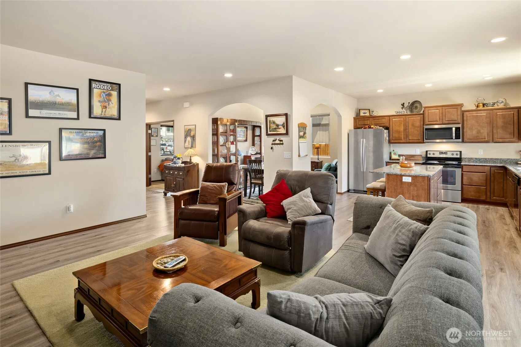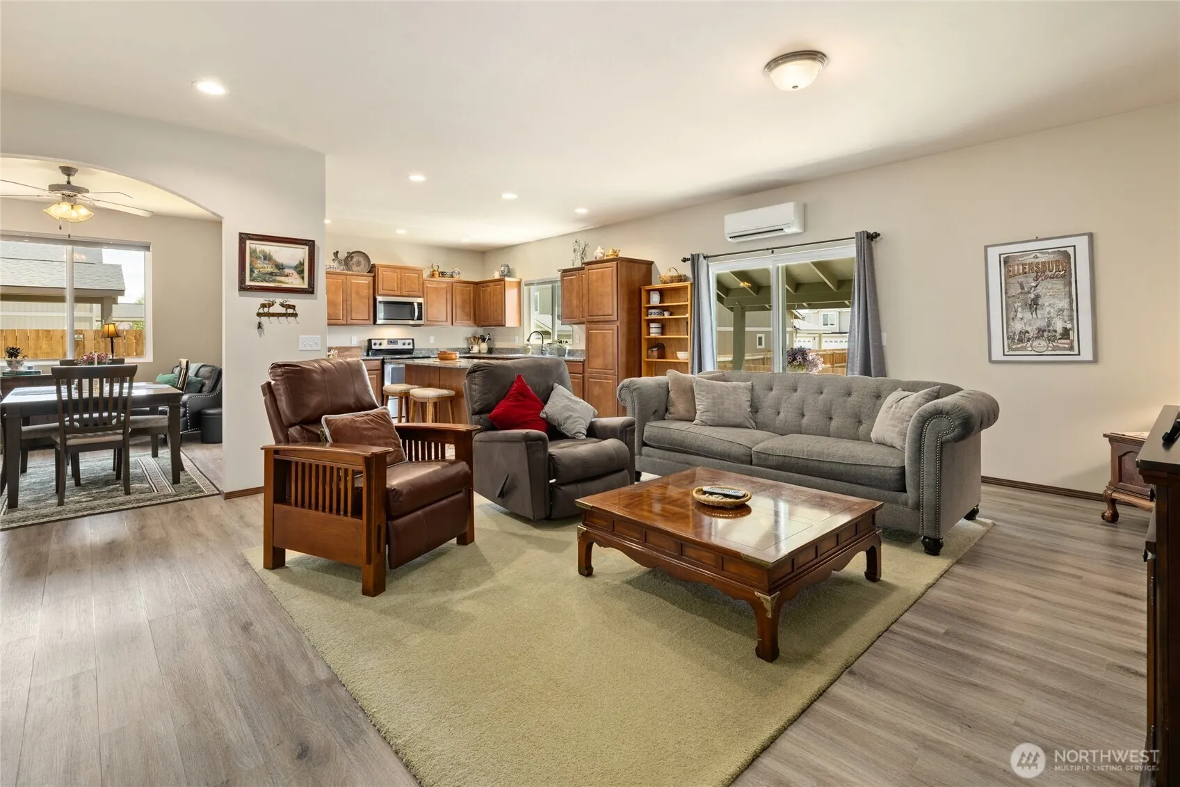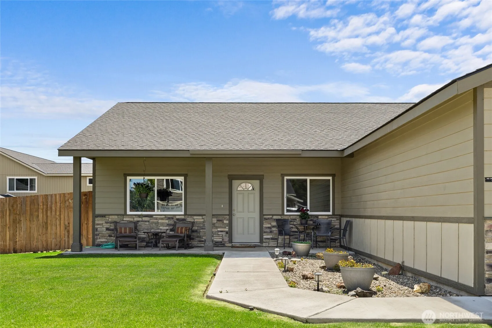 Welcome home to this beautifully maintained–low maintenance 1,942 sq ft single-story gem that blends comfort, convenience & style. Step inside to a light-filled great room that flows seamlessly into a well-appointed kitchen w/granite countertop, abundant cabinetry & ample prep space—perfect for entertaining or everyday living. Wide hallways & well proportioned rooms throughout! Dining rm offers cozy space for meals or formal gatherings. 3 generously sized bedrms incl. a large primary bdrm & ensuite bath, versatile home office, & spacious garage w/extra room for storage or hobbies! 2 covered patios-the back is a peaceful retreat near the grassy side yard & front patio overlooks front yard. Nestled in a highly desirable neighborhood.