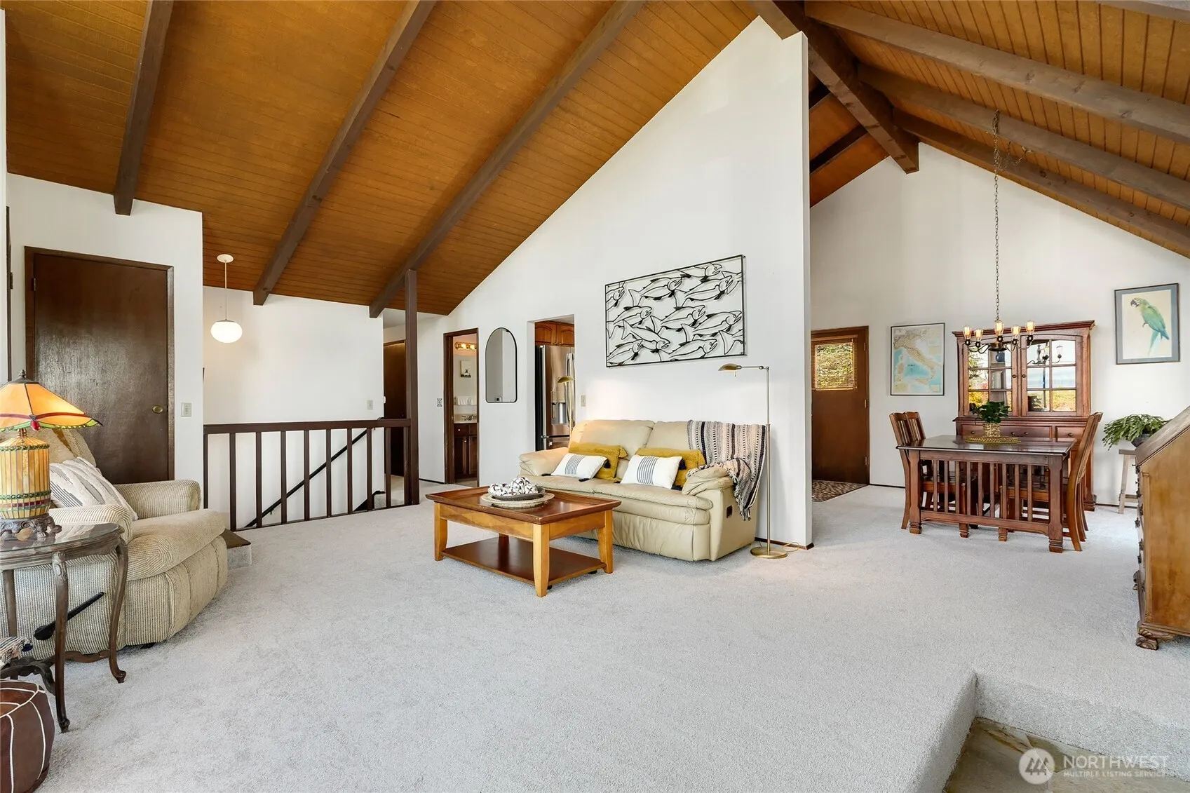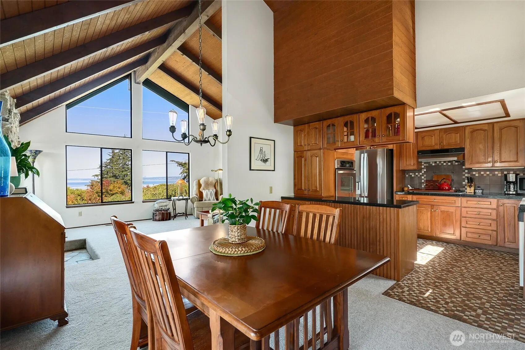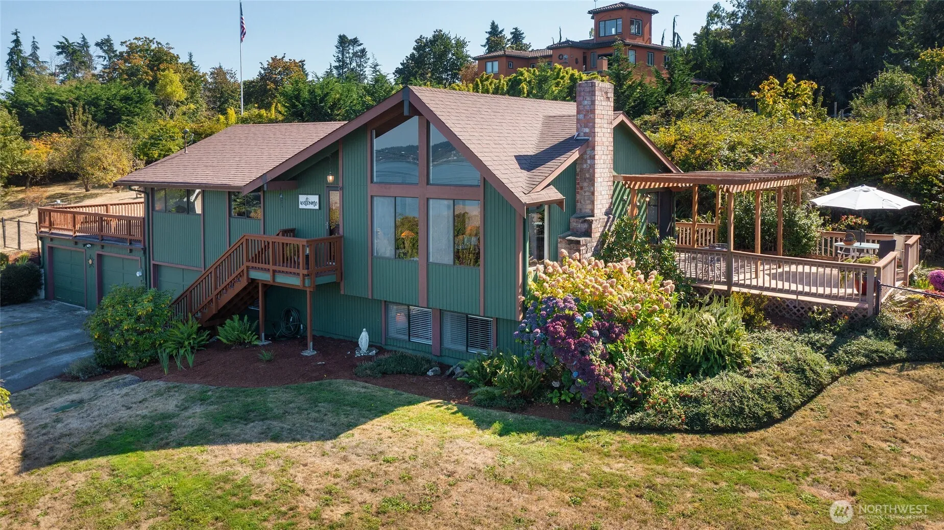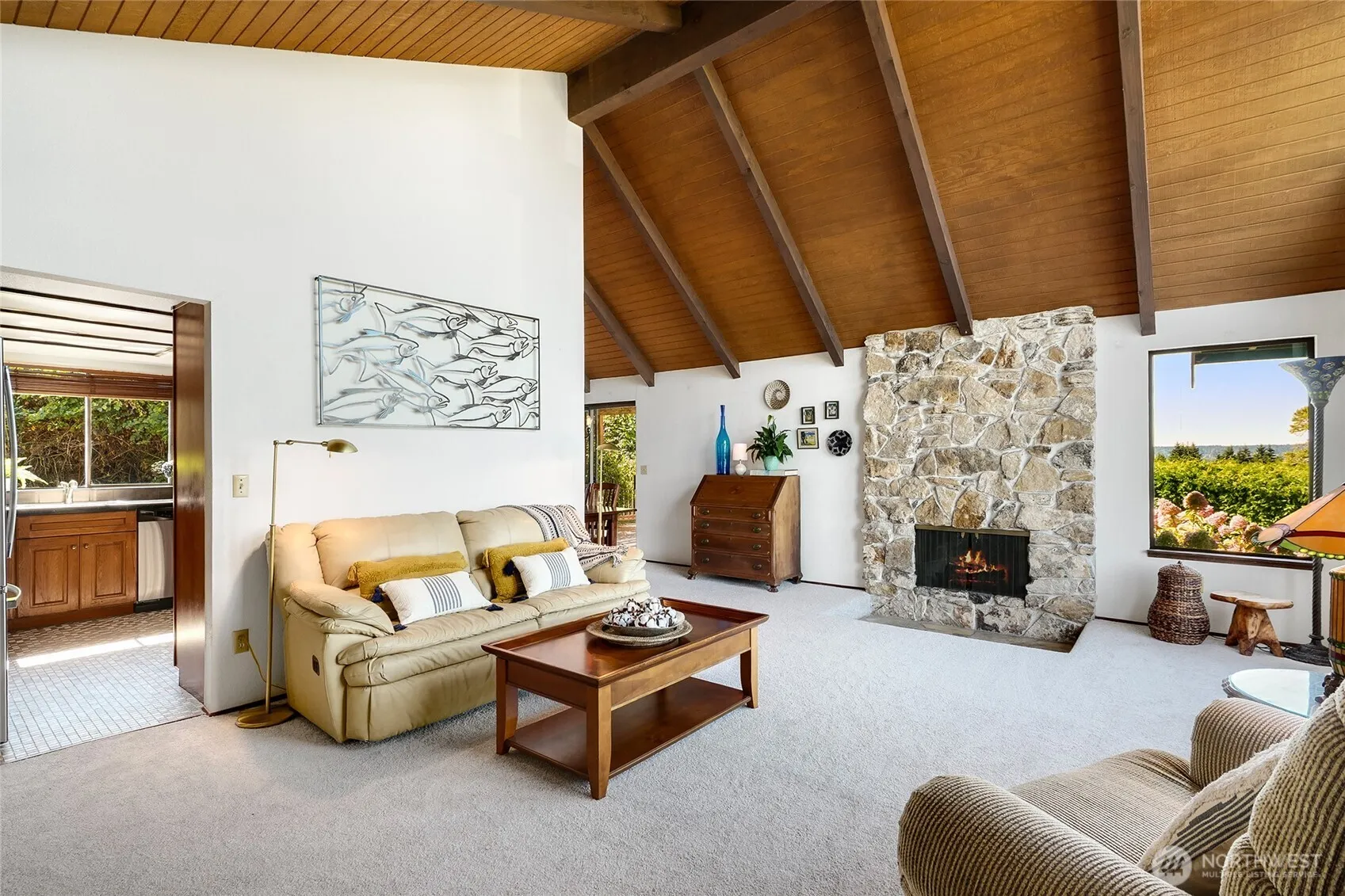 Perched above Puget Sound on coveted Maury Park Road, this Pacific Northwest contemporary home combines Mid-Century aesthetics with dramatic windows framing sweeping views of Seattle skyline, mountains and the Sound. Exposed beams accent the main room’s vaulted wood ceilings highlighting the impressive stone fireplace. An inviting floor plan of 2560 sq. ft. features 2 bedrooms & full bath plus primary ensuite up & a versatile lower level with family room, office & tiled shower. Two expansive view decks extend living and entertaining outdoors surrounded by a fully fenced yard complete with a fruit orchard & lush landscape capturing the essence of island living. The attached 3-bay garage provides ample storage and expansion possibilities.