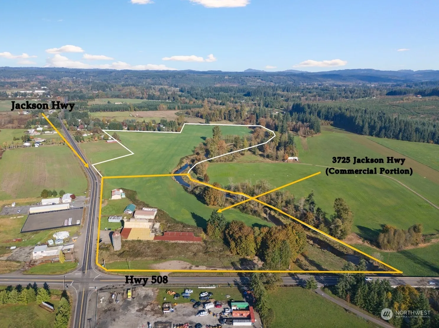 Introducing a rare opportunity on the market! Prime high traffic corner location with frontage on both Jackson Hwy (982 ft), Hwy 508 (812 ft) and also 1,170 ft frontage on the picturesque Newaukum River making it a truly unique offering. Peekaboo Mt. Rainier view. Multiple outbuildings and a 2 bedroom manufactured home/office included. This property’s zoning combines the versatile appeal of Crossroads Commercial and Agricultural Resource, providing countless and diverse potential uses.