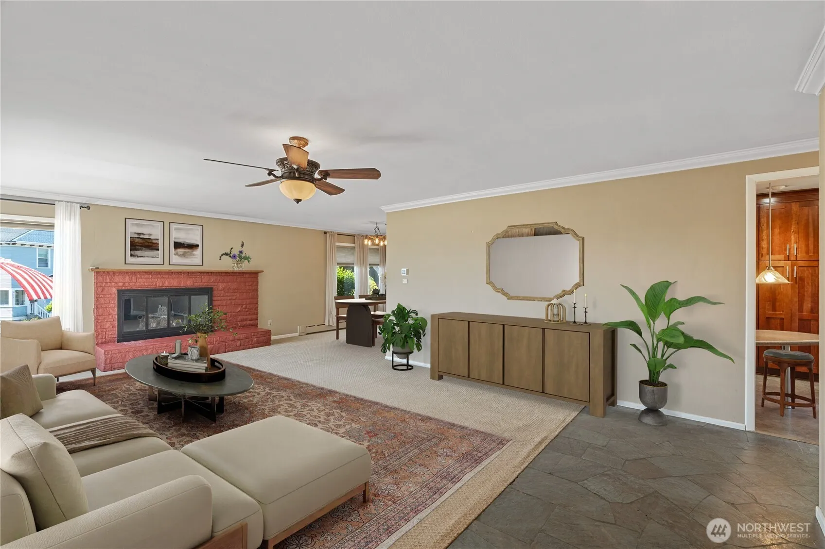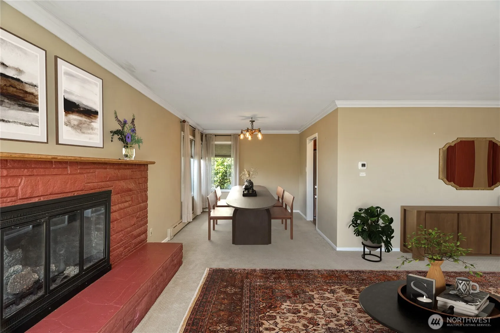 This Charming Mid-Century spacious home features 4~bed, 2.5~bath, and 2563~sq ft a standout fireplace as the centerpiece of an oversized living room, flowing seamlessly into a bright formal dining area. The custom galley kitchen is complete with mosaic tile accents, double ovens, and a built-in workstation. The lower level adds even more versatility with additional living space—perfect for a guest area, rec room, or home office. Step outside to enjoy mature landscaping, fruit trees, raised garden beds, and a two-car garage with an attached workshop. A perfect blend of charm and potential—come make this home your own!