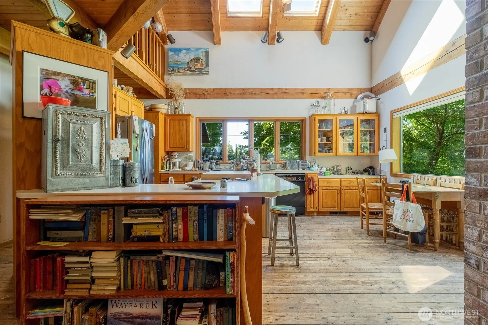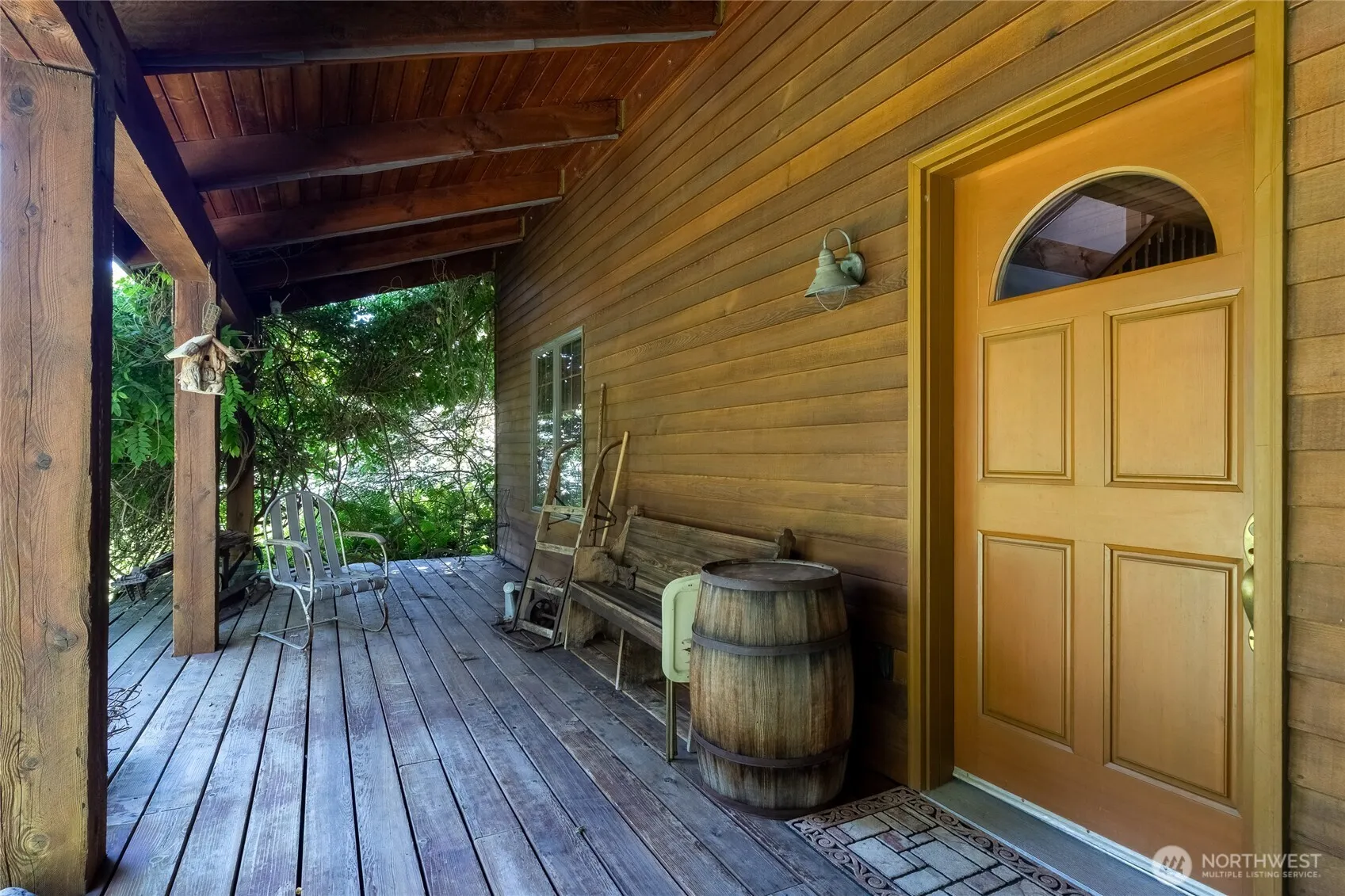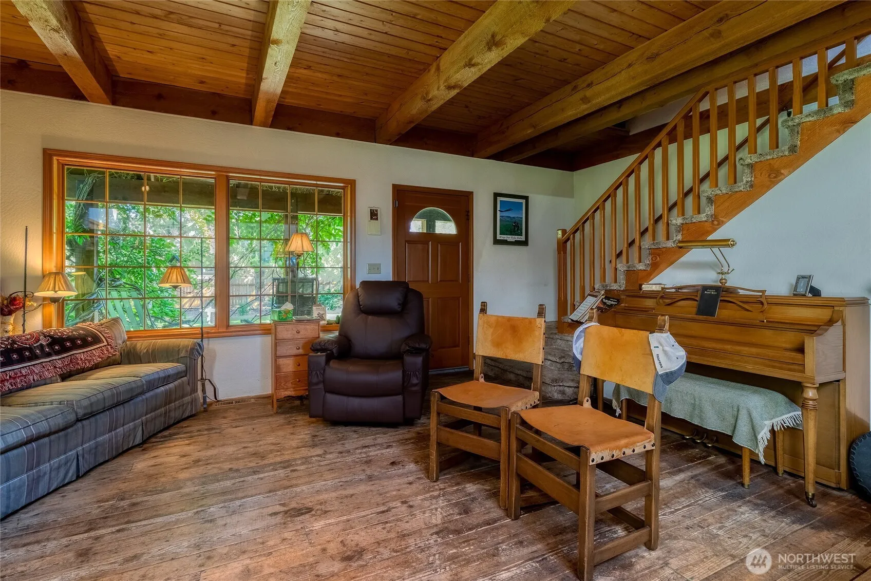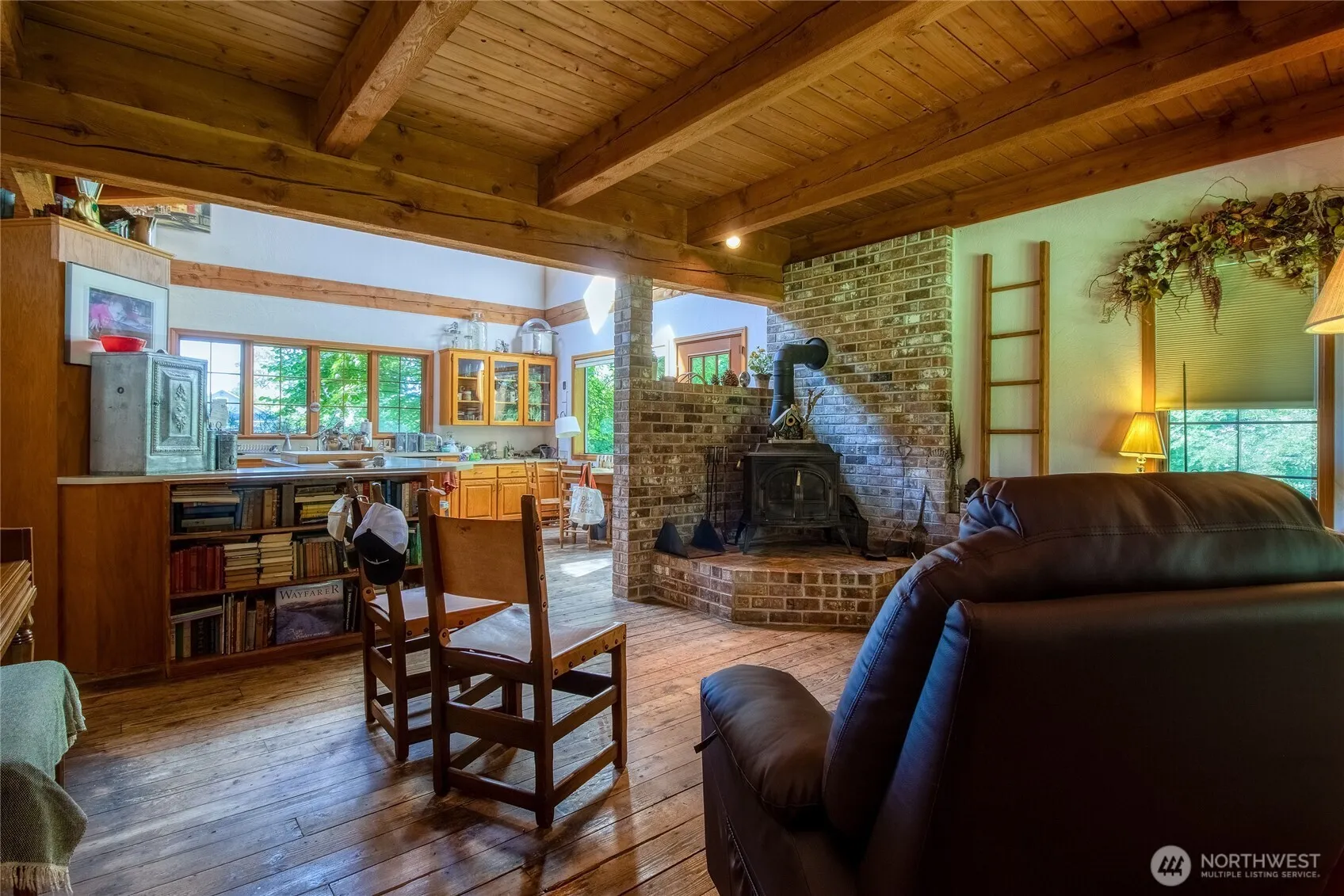 Beautiful home nestled on approximately 1 acre of lush, manicured grounds. This inviting property features an open floor plan with soaring ceilings & warm, raw wood accents throughout. The main living space is anchored by a cozy wood-burning stove and highlights tongue-and-groove ceilings w/ exposed beams for added charm. Enjoy the shaded front porch surrounded by mature landscaping. Inside, the main-floor primary suite includes an ensuite bathroom for convenience. Upstairs offers two additional bedrooms, a full bath & a flexible loft space. The full basement offers abundant storage or potential for future finished living space. This one-of-a-kind home combines rustic appeal w/ thoughtful design on a spacious, private lot.