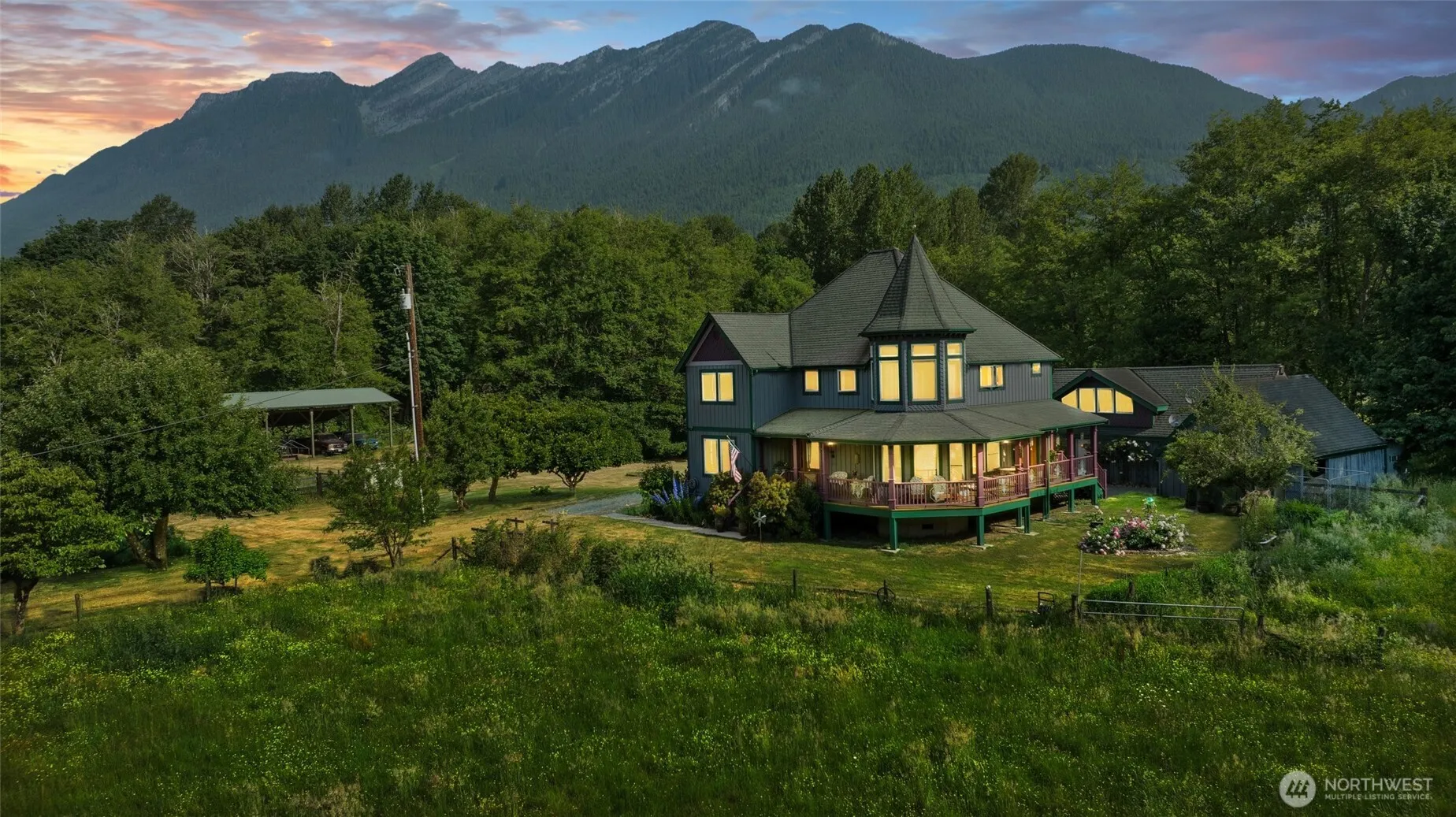Genuine Victorian Home, custom built, on 12 acres. Stilly river frontage & surrounded by mountains. Built in 2003 and lives beautifully like an old Victorian farmhouse. Highend touches throughout. Ask for FEATURES LIST. Pastures, fruit trees, RV hookups, etc. Kitchen, dining/living rooms feature moabi woodfloors. 3/4 bath + mudrm on main. Milgard windows. Stay cool w/ AC. Generac generator. Wrought iron staircase takes you to a transcendent primary suite w/ turret, an enchanting bathroom & walkin closet. 2 more large beds + full bath. Wraparound porch w/ Alaskan yellow cedar. Bonus room above garage. 4bed septic, convert to ADU? Buildable 2nd parcel! Neighboring lots will never be developed, in conservancy. Once in a generation opportunity!