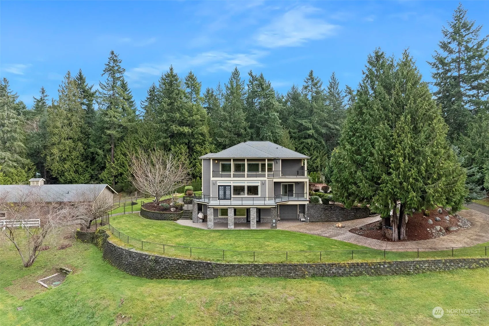 OLYMPIC MOUNTAIN & SUNSET VIEWS! 4707 sq. ft., 2.59 Acres. Main: Stunning staircase, great room style w/custom kitchen, built-in desk & breakfast nook, 3/4 bath, large bdrm w/balcony access, laundry, ELEVATOR to all floors,viewing deck. UPPER: Oversized master suite w/impressive Mstr bath, walk in shower, CA closet system, adjoining bonus room w/wall of windows, Lg guest bedrm & bath, covered viewing balcony. LOWER: Entertaining family rm, surround sound, cork floors, kitchenette, bonus rm, 3/4 bath. 2/newer forced air/a/c units, on demand generator, expansive waterfall feature. 1700 sq ft barn/2 stalls, RV door & storage, fenced pasture, add’l parking. Custom landscaping & sprinkler system. Numerious improvements! 8 MIN TO FERRY/HWY 16.