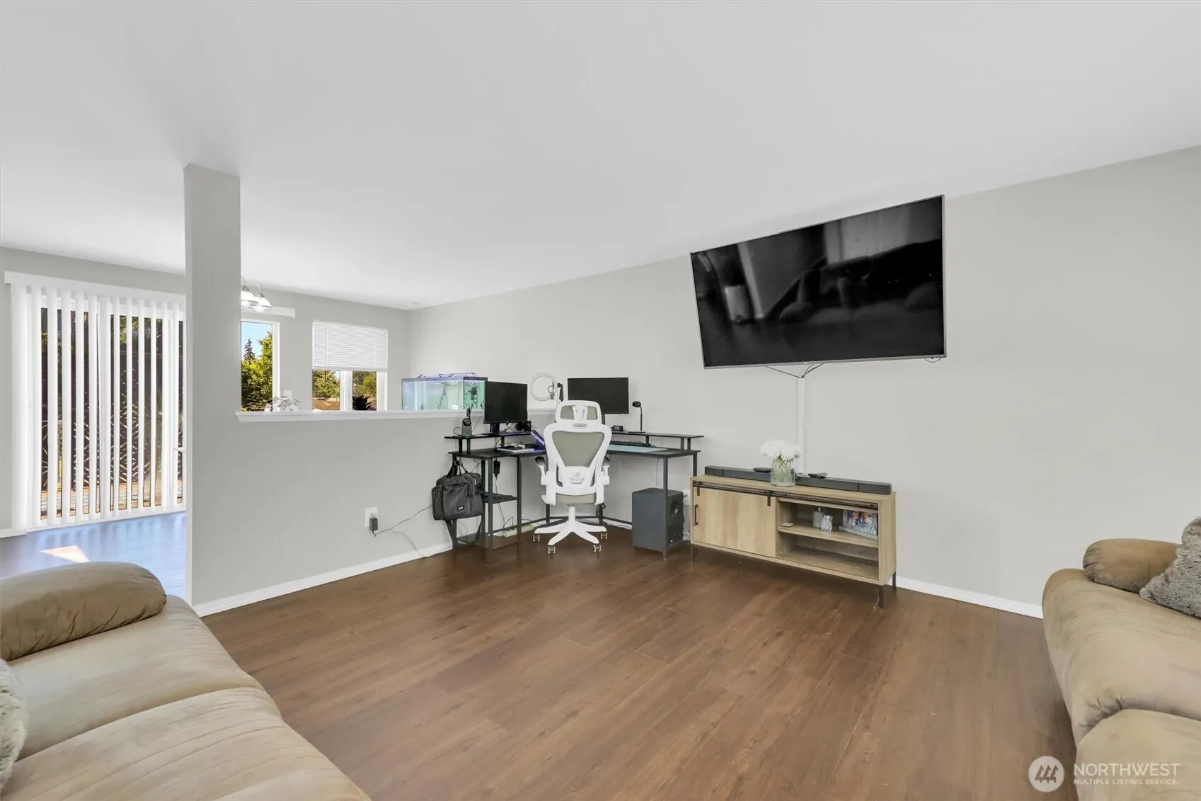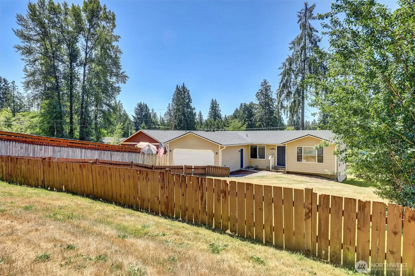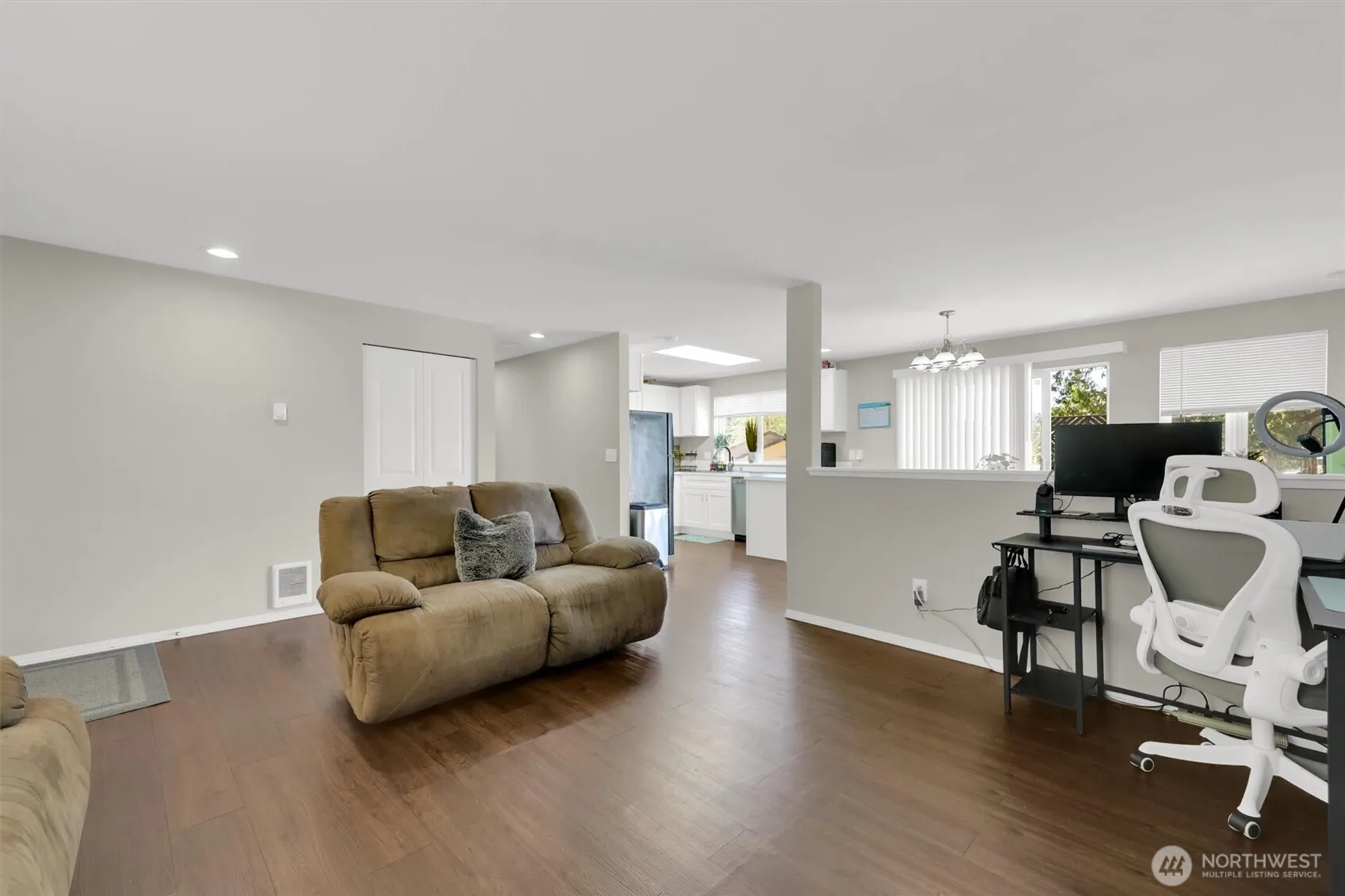 Welcome to this darling one story rambler! Enjoy the community pool and cabana in this tucked away neighborhood. This lovely home offers a spacious living room, a dining room off the kitchen with outdoor access to a low maintenance deck that steps down to the backyard. You’ll enjoy the modern kitchen with a skylight, white cabinets with contrasting black counter tops and appliances. There is canned lighting in the kitchen, hall, and bedrooms and blinds on the windows throughout. The bedrooms are newly carpeted. There are plenty of double closets and additional storage. The primary bedroom has a walk in closet, and full bathroom. The roof is new and plumbing well maintained. RV Parking. Seller will provide $1500 for backyard privacy trees.