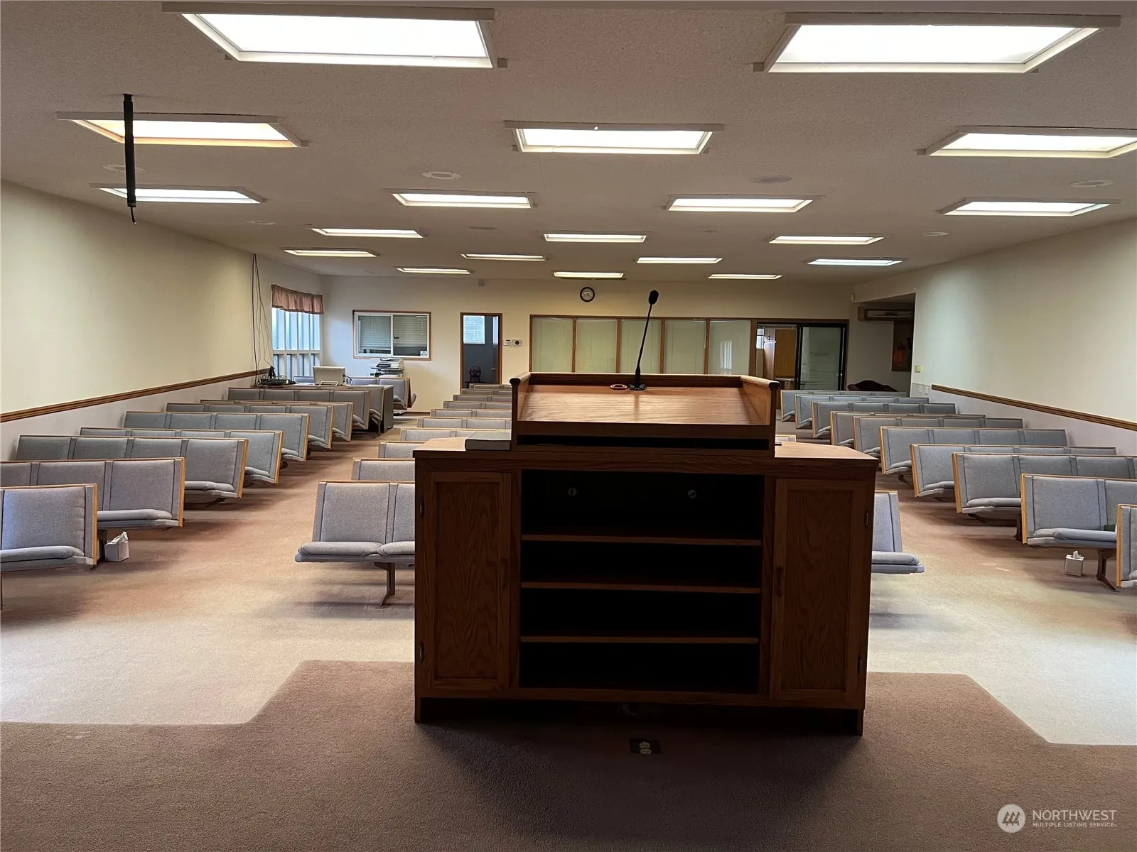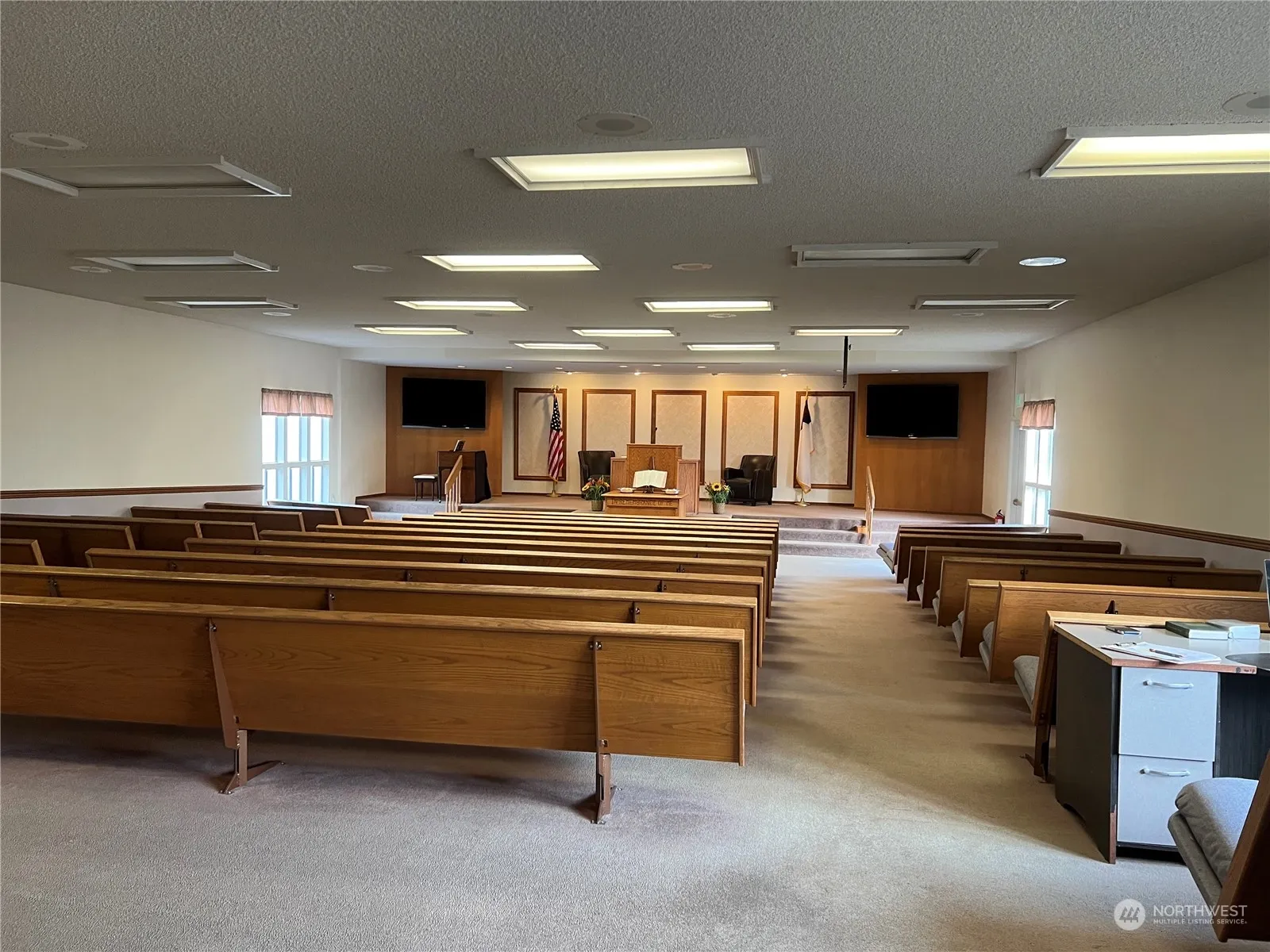 This is a Church building. Residential zoning with a conditional use permit. Good seating and pews, paved parking, 2 bathrooms. Metal roof. .56 acres of land approximately. Title Group info shows building to be 3,744 sq ft. Purchaser to verify.