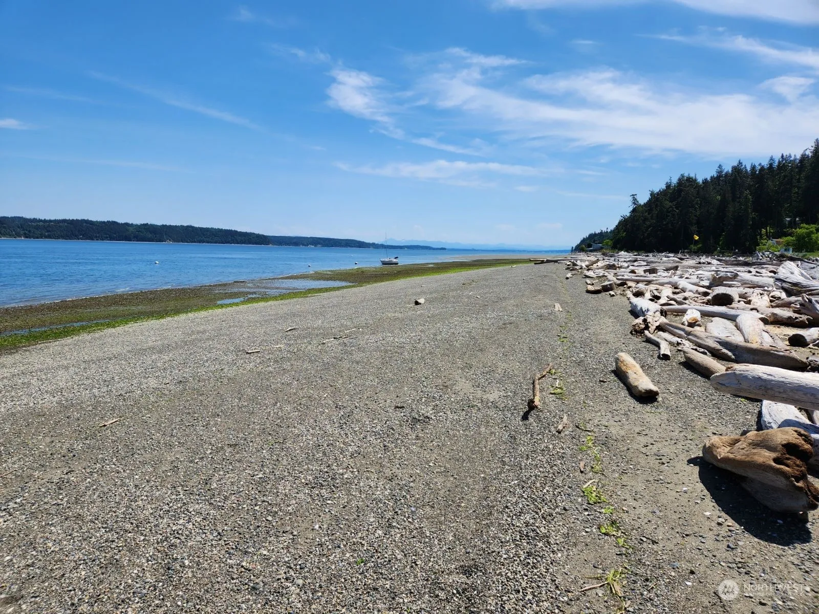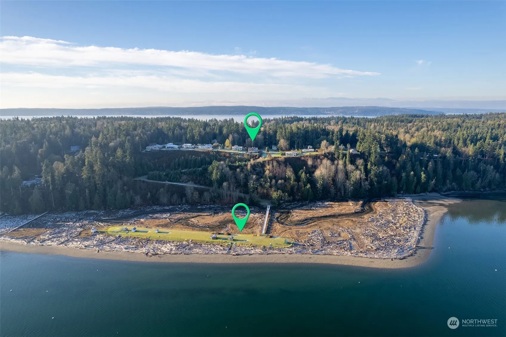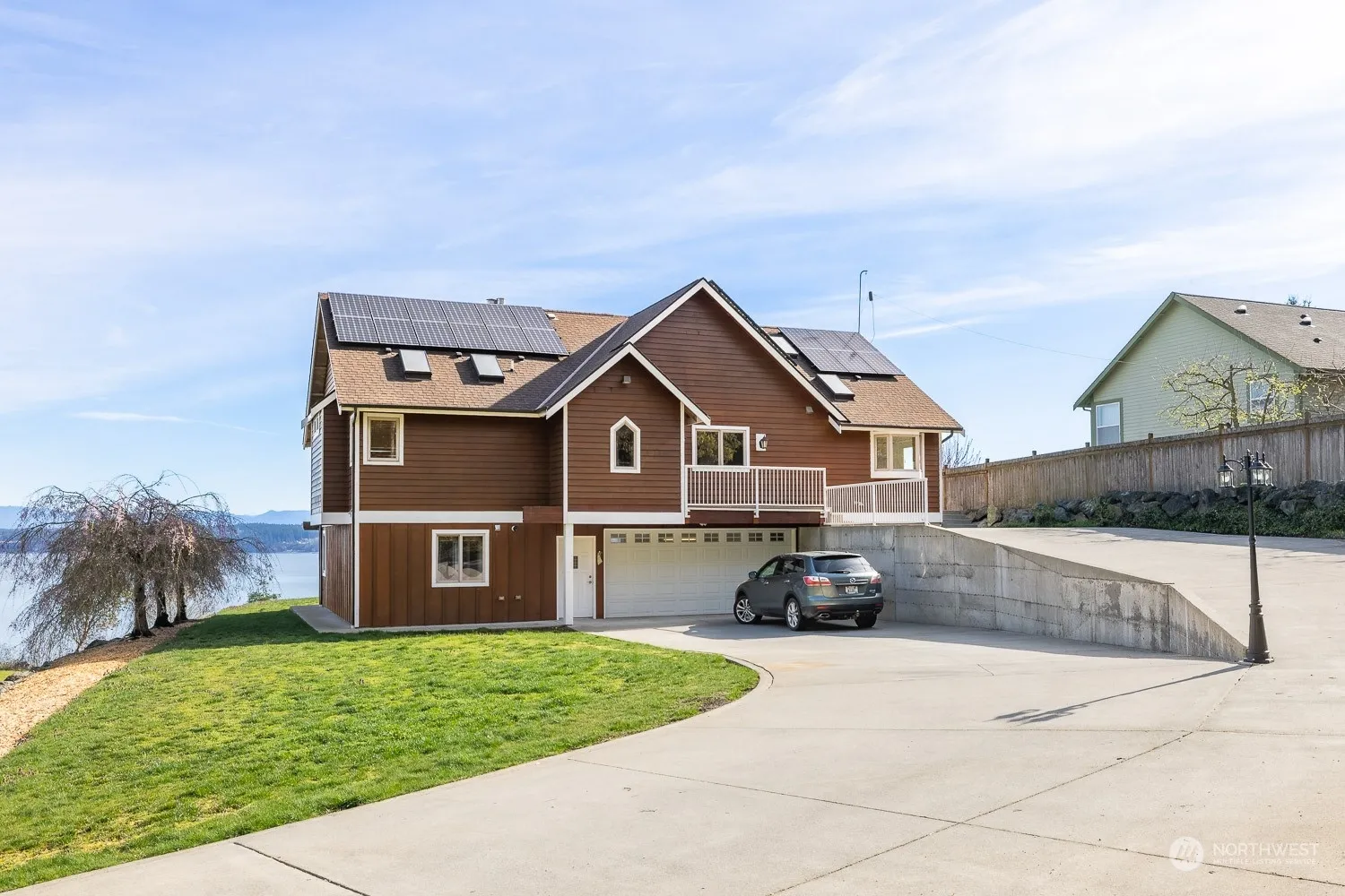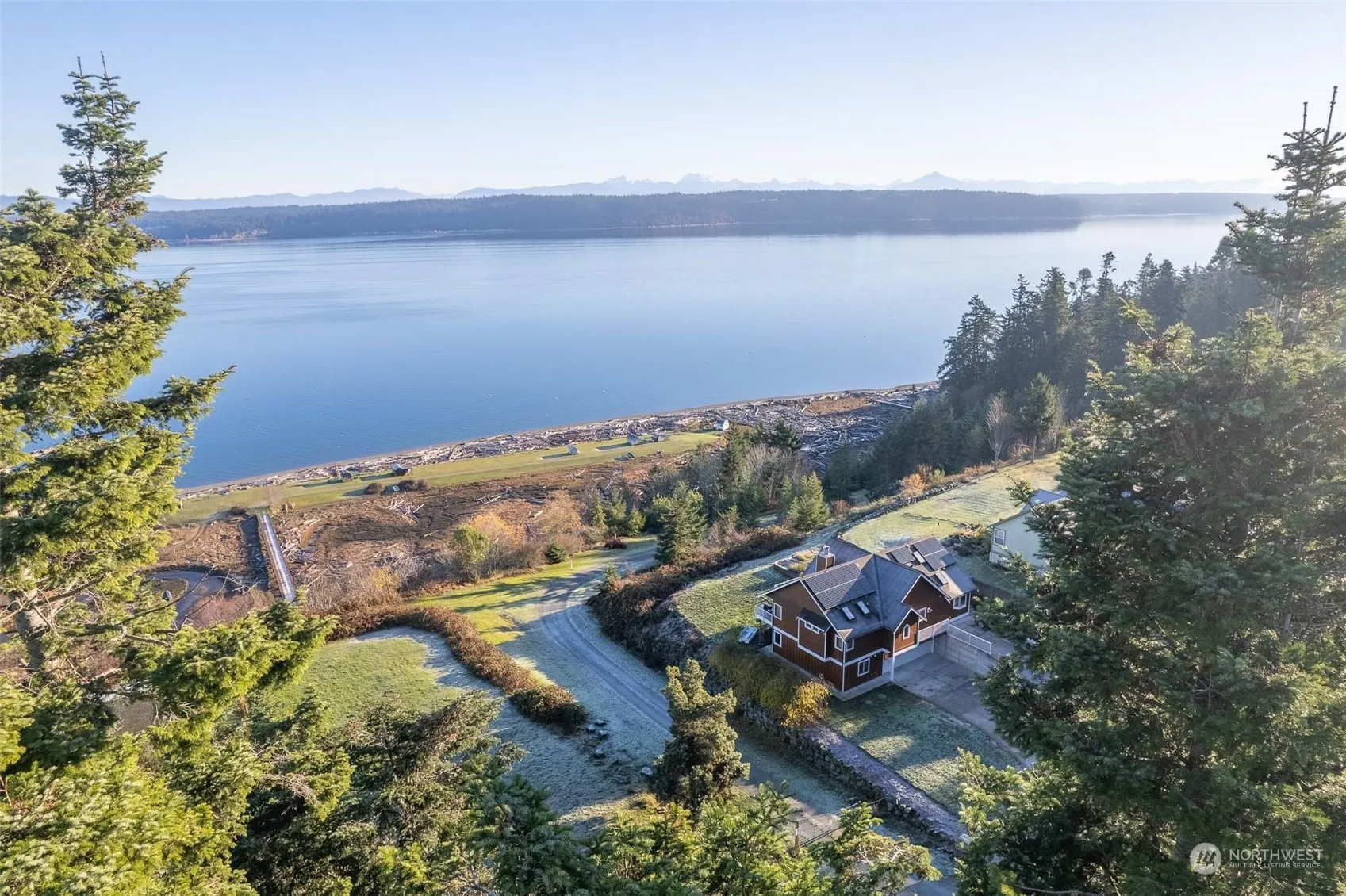 One of a kind Waterfront View Home on 2.7 acres. Unobstructed expansive sound, mountain views. Privately owned deeded level beach, tidelands! Drive/walk to private beach/tidelands w/clams, oysters & boat anchorage. Beautifully designed custom built home w/great features; Vertical gr. fir trim, Clear Cedar old grw. siding, Custom doors, Baltic Birch just refinished solid wood floors. Solar panels, forced air heat pump, on demand hot wtr. Large View Master w/5 pc. bath, fireplace. Fantastic views of bay, Cascades/Mount Baker, from living, master, kitchen, dining, bonus room, office. Lower view apartment w/kitchen, living, bedroom, bath. Lg. Shop/Garage w/view, door to Gardens! Community Gate to Bridge over estuatuary to beach, Pt. Susan Bay.