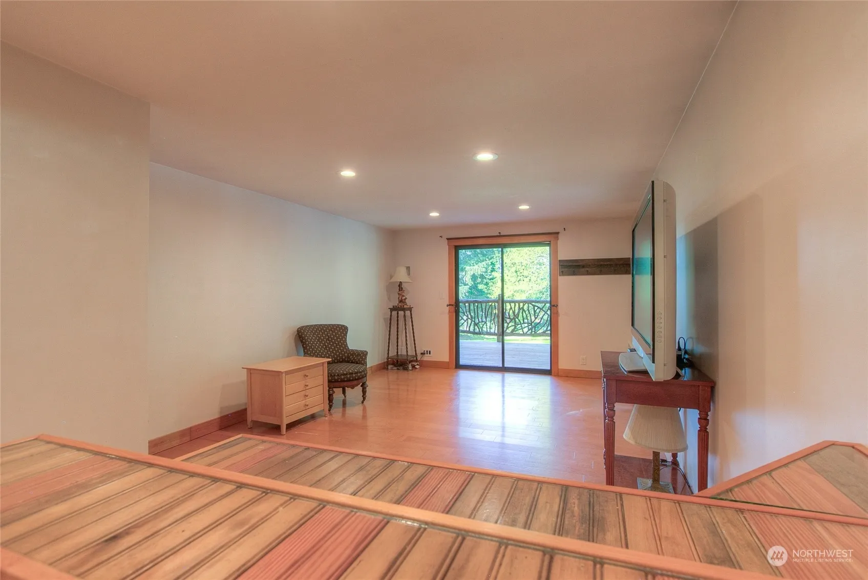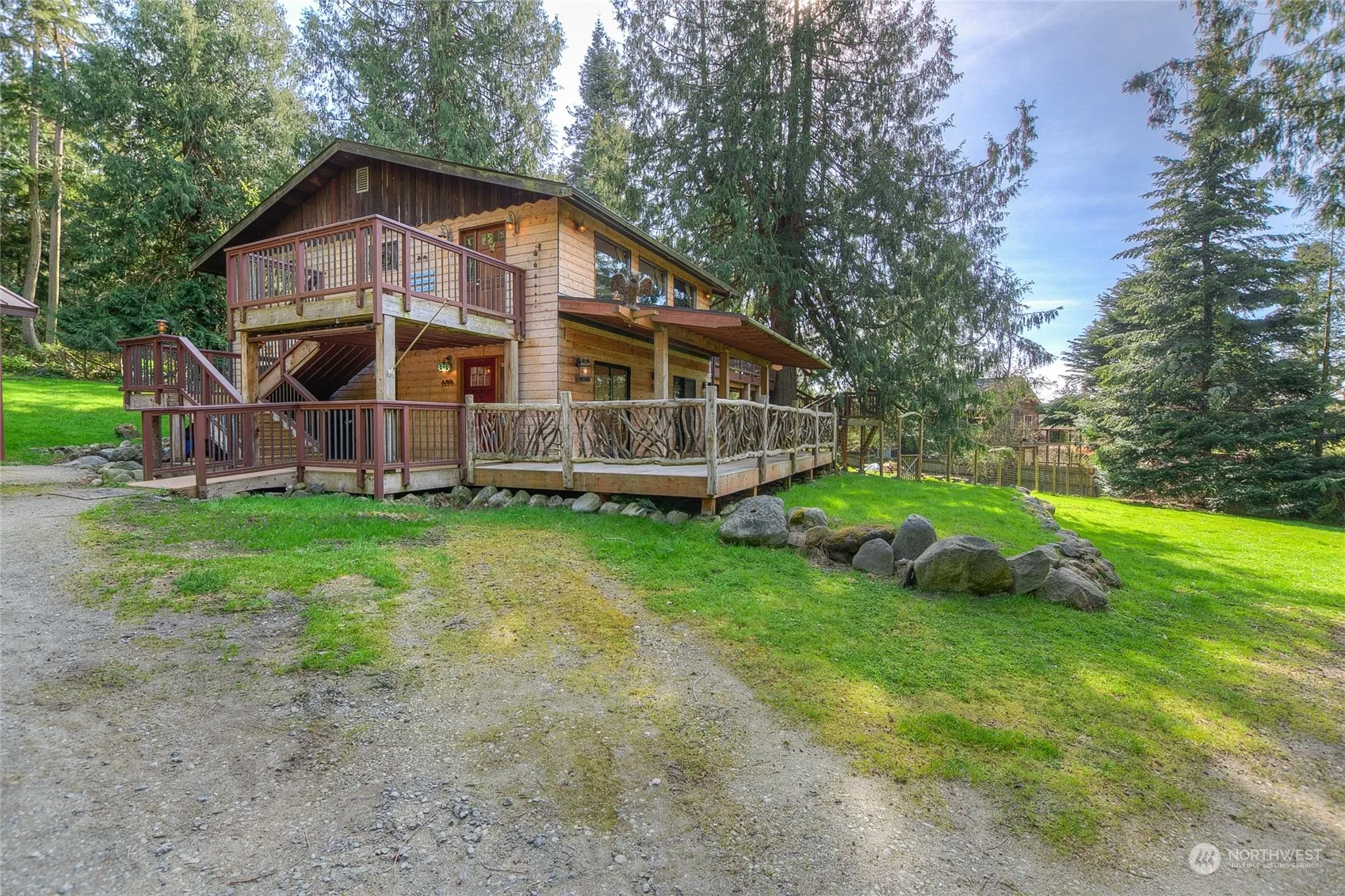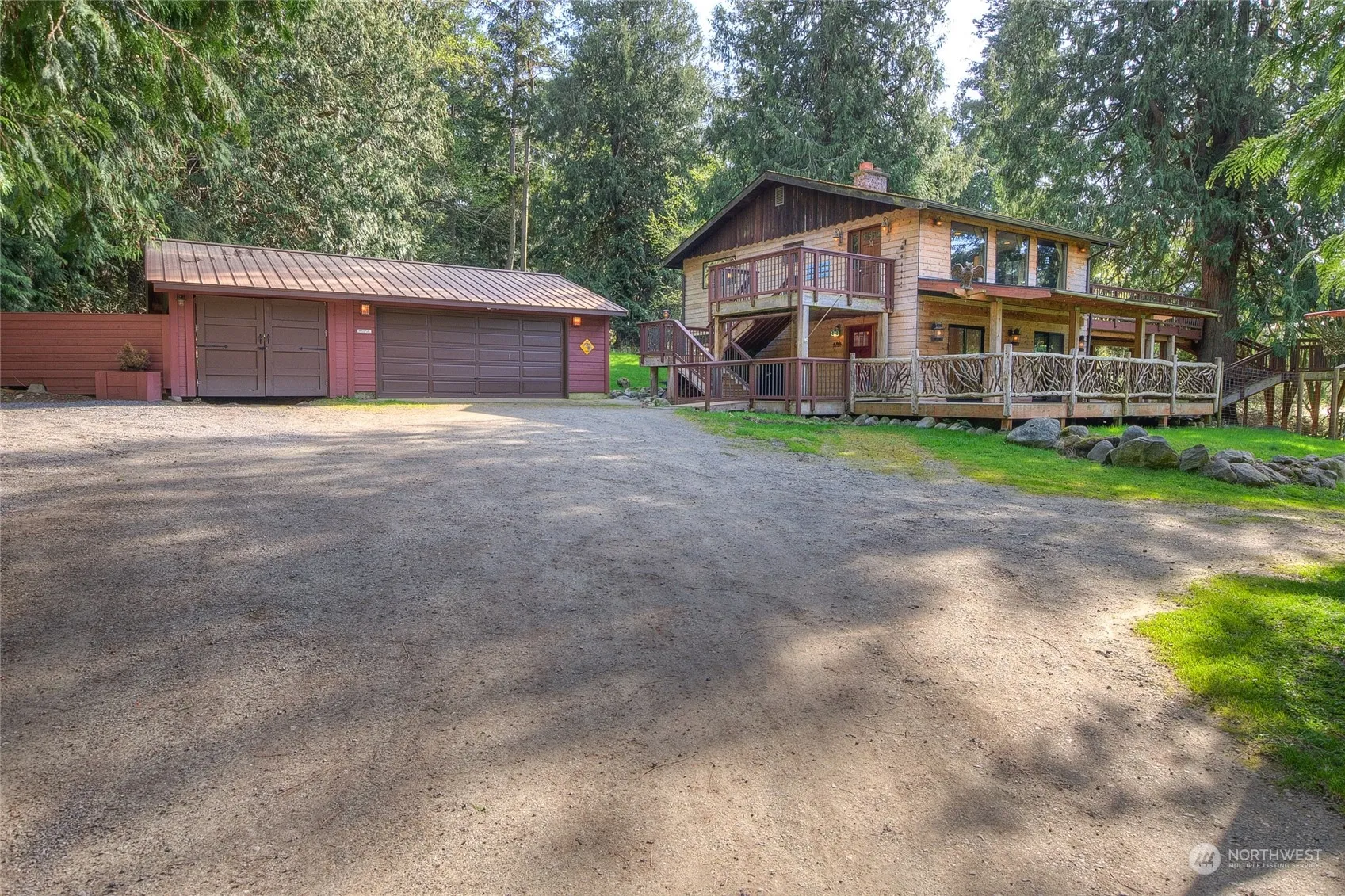 Water view, wooded one acre lot with 3 car garage and 3 bedroom, 2 bathroom house with flat useable land. Located in the Eastsound area with easy access to shops, schools , library, and ocean access. Quiet dead end road. House has extensive wrap around cedar decks, and unique features such as custom glass doors and special antique mirror in upper bedroom from the estate of John Colgate. Custom copper railings special wood railings. Partially fenced area used for dog run.
