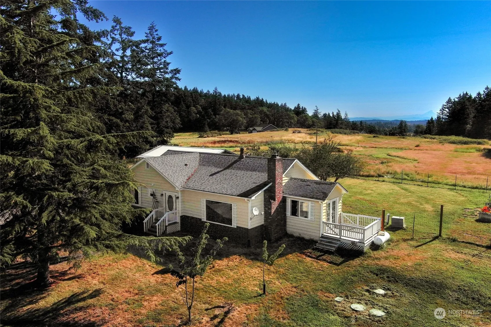 Island History! 1488 sq ft 1920 Farmhouse. 5 sunny acres. 1 level-3 bedrooms & 2 full baths. Primary bath remodeled 2024. Laminate floors. 3 car garage/shop/shed. Mid-Island only 6 miles to ferry.. Distant views of Mount Baker from kitchen, breakfast room & side deck off breakfast room. Fenced area w/fruit trees in backyard w/raised garden beds. Open areas & wooded areas with pasture areas on mostly level 5 acres. Shared 50 GPM Well with neighbor that once owned this property and built new house. Island charm, much to offer. Ready for you to add your own touches & island memories. No HOA. Currently in a Lease-Purchase. Seller will review Back Up Offers. Call broker for details.