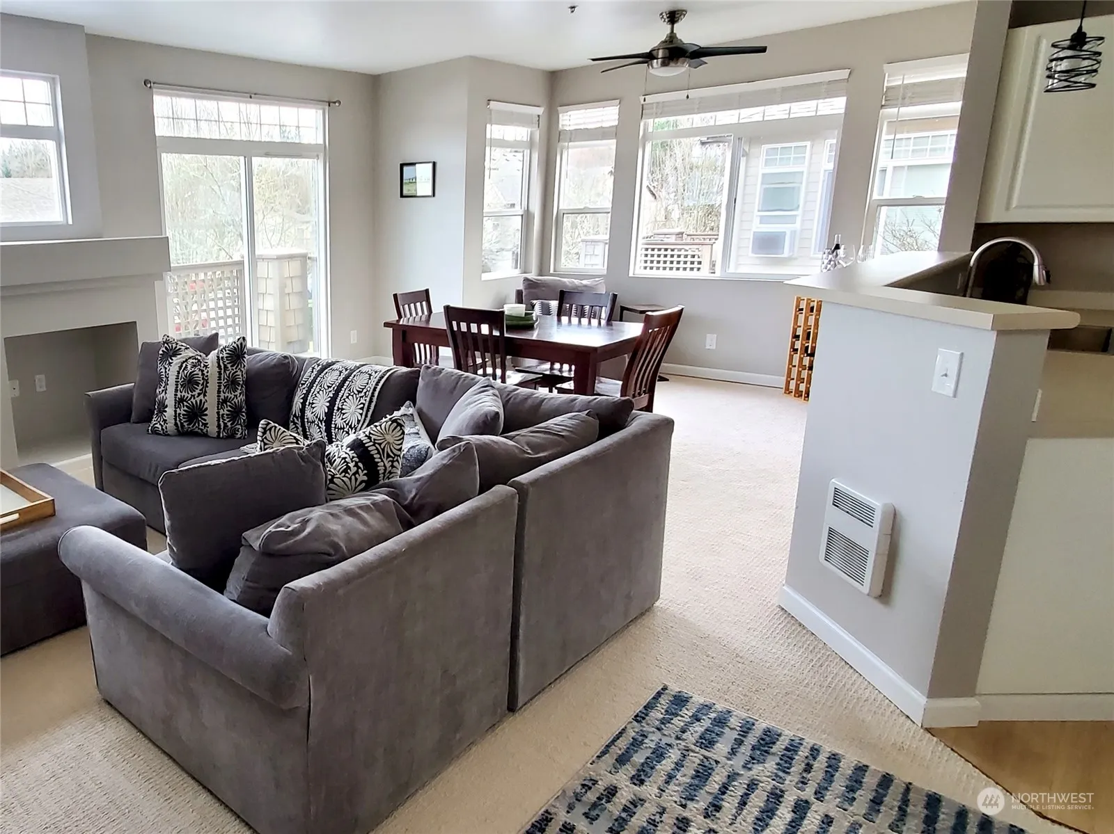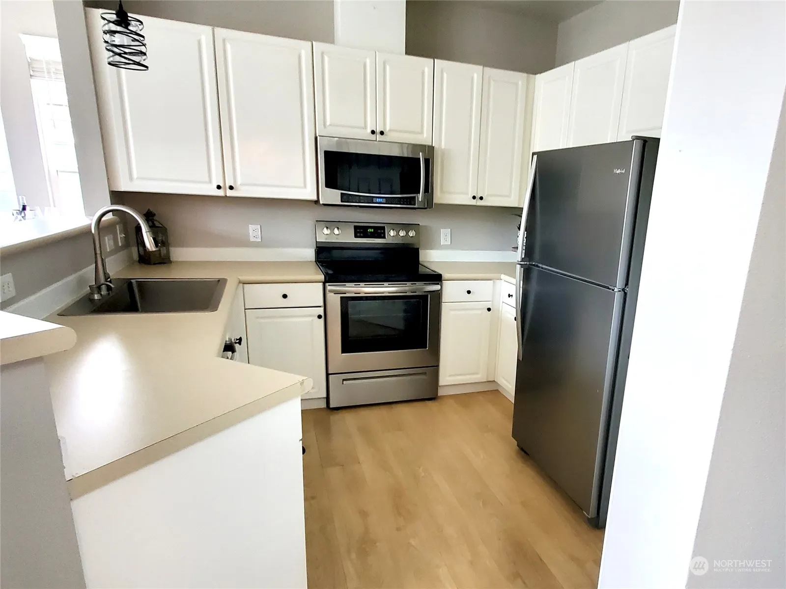 Top floor, renovated unit in the peaceful Red Mill Condominium Community in Fairwood. Freshly painted with new carpets, new appliances in kitchen and laundry room, new fixtures, and bathroom has been renovated floor to ceiling! Private garage and entry lead you up to the perfect open-concept layout. Kitchen opens to spacious dining and living room with cozy gas fireplace. Patio opens from living/dining. Plenty of guest parking directly across from unit, along with driveway parking in addition to private 1-car garage. Convenient access to freeways, groceries, restaurants, Boeing, Valley Medical Hospital and much more. HOA has no rental cap. The Red Mill Condominium Community features an outdoor pool, indoor hot tub, gym & clubhouse.