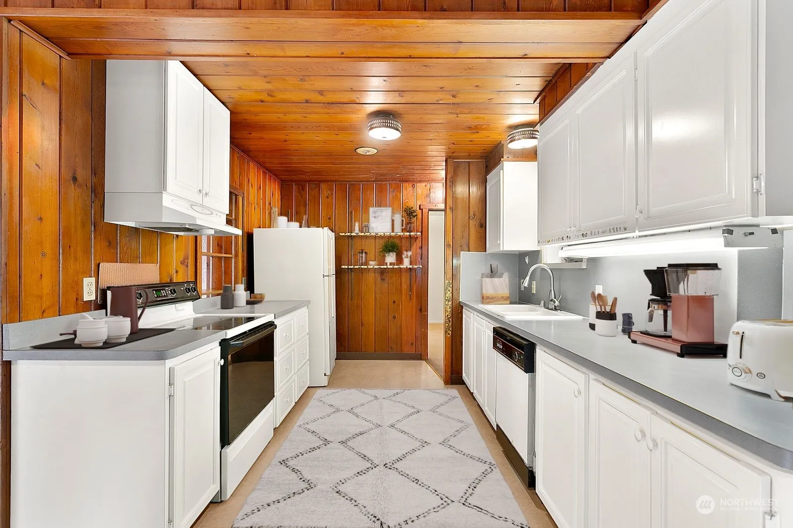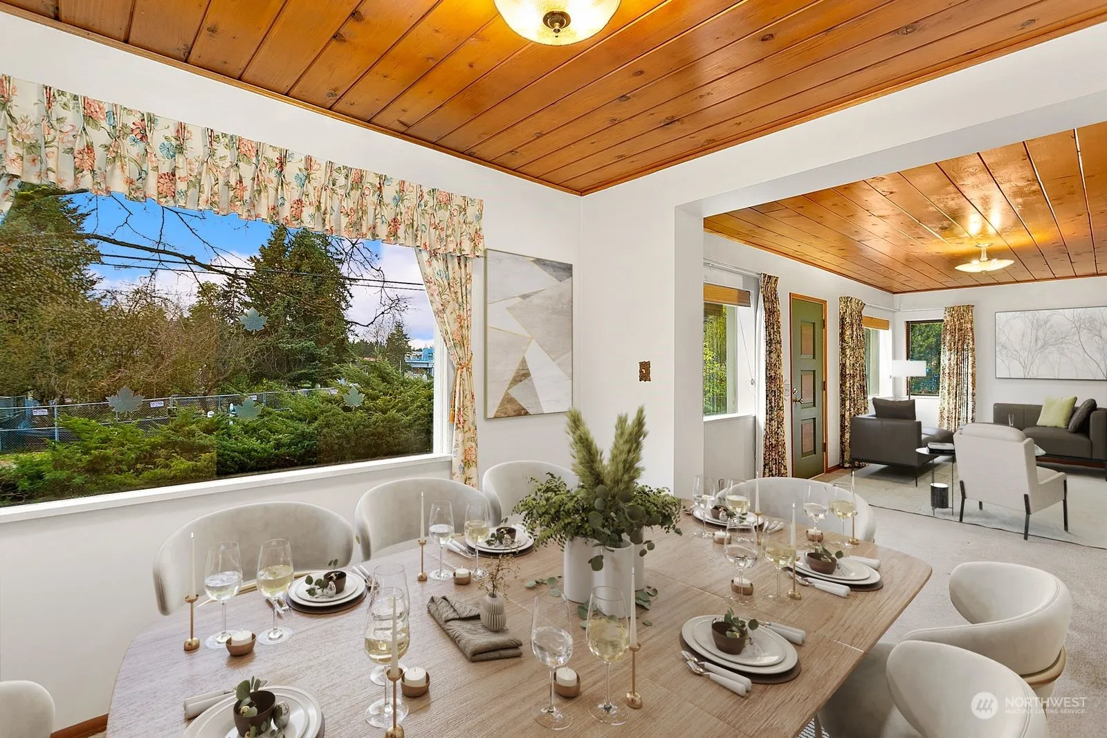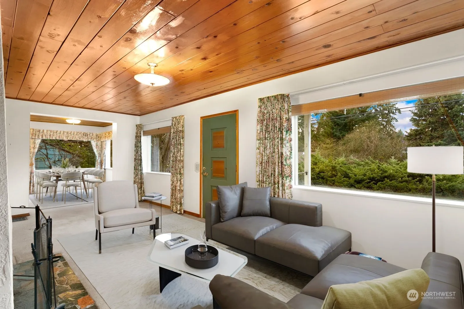 An exceptional opportunity to become the owner of a single-level home in Shoreline, adorned w/stunning knotty pine paneling throughout. A well thought out 2 br/1bath floorplan. The cozy living room is enveloped in knotty pine and features a wood-burning fireplace.The spacious kitchen includes an eating area, complemented by a bright dining room featuring picturesque west-facing windows. Situated on a beautifully landscaped lot, fully enclosed fence w/ a backyard patio at the base of towering evergreen trees. A detached garage plus off-street parking. This charming rambler, built in 1939, offers an ideal location for commuters, just blocks away from I-5 onramps & the newly constructed light rail station. Possible development w/ MUR70 Zoning!