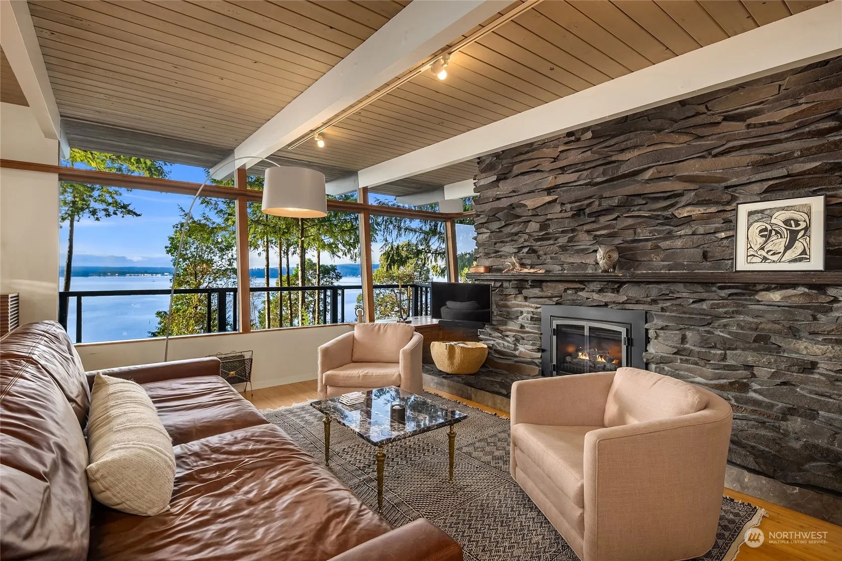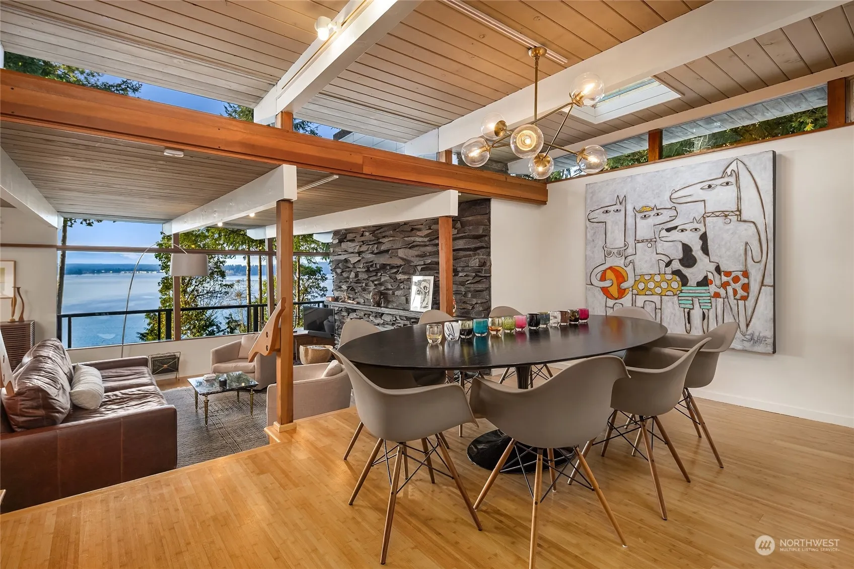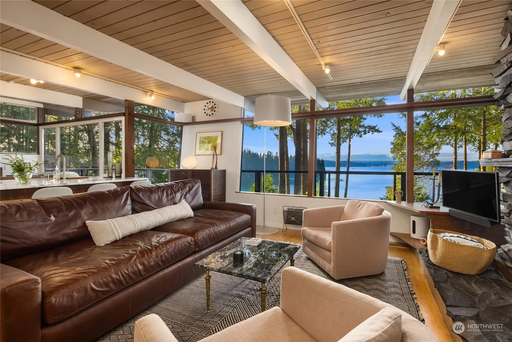 A very cool Mid-Century Modern waterfront home on a shy acre with beautiful western views from almost every room. An easy trail leads to your private bulkheaded beach with 202 ft of shoreline. Custom walnut cabinetry, marble island, Thermador Range, Sub-Zero Fridge, a La Marzocco espresso machine and connecting view deck are just some of the amazing kitchen features. This efficient multi-level floor plan has amazing flex spaces and abundant natural light with a main floor den/office and primary bedroom with a high-end modern bath. Lower level has a flex-room, media room plus two more bedrooms. Professionally installed mooring buoy, two levels of decks for entertaining. View garage could be perfect 2nd home office. Island living at its best!