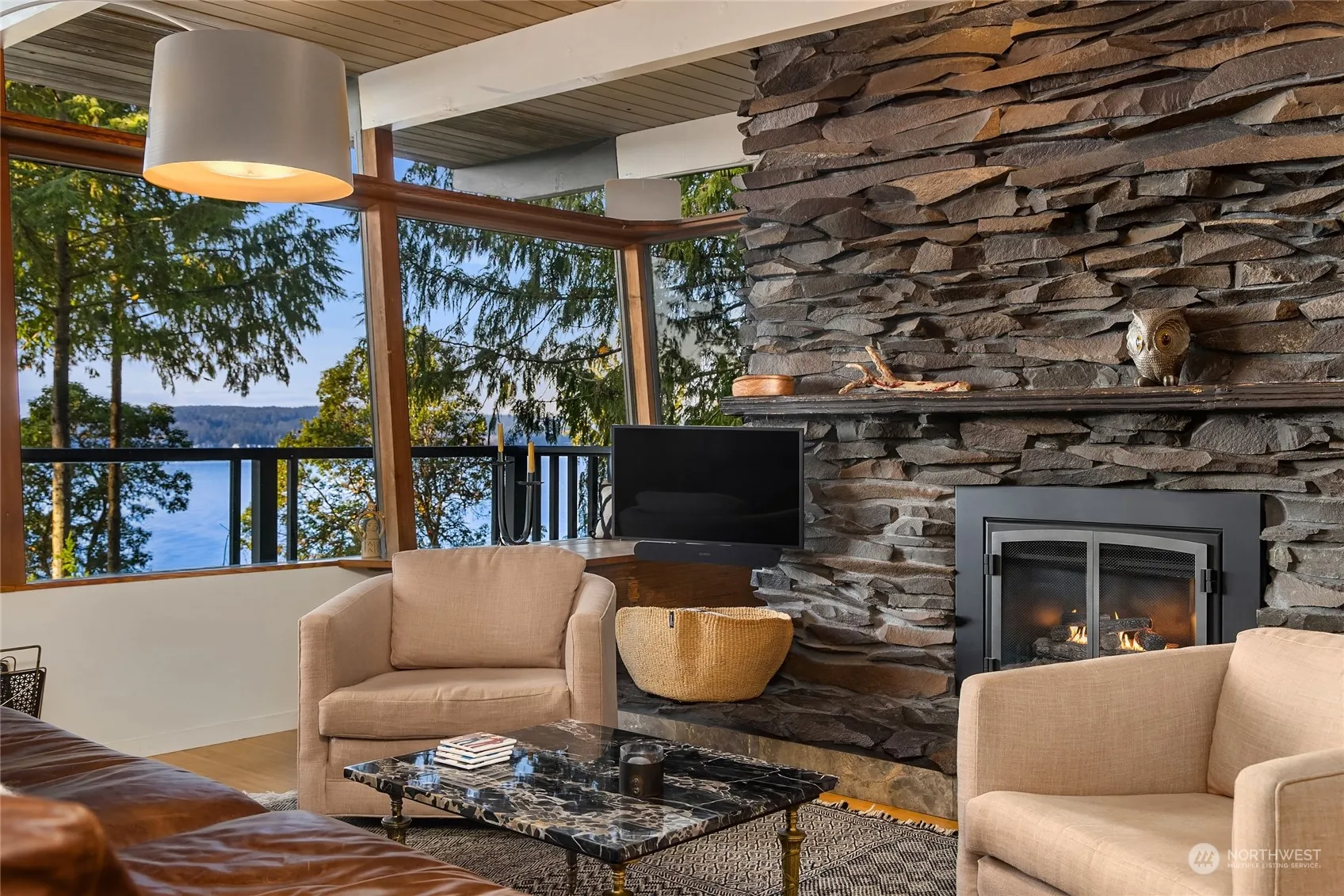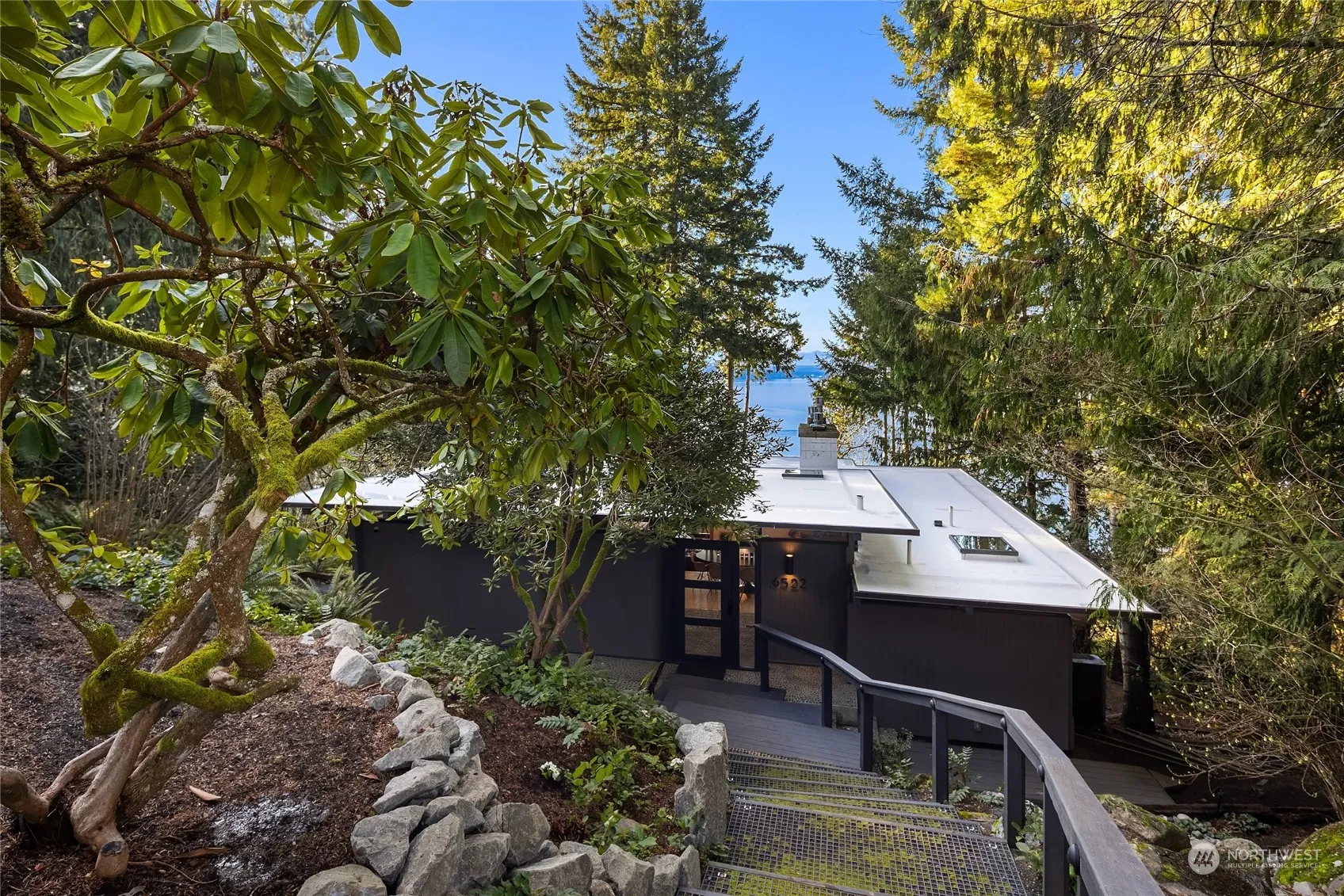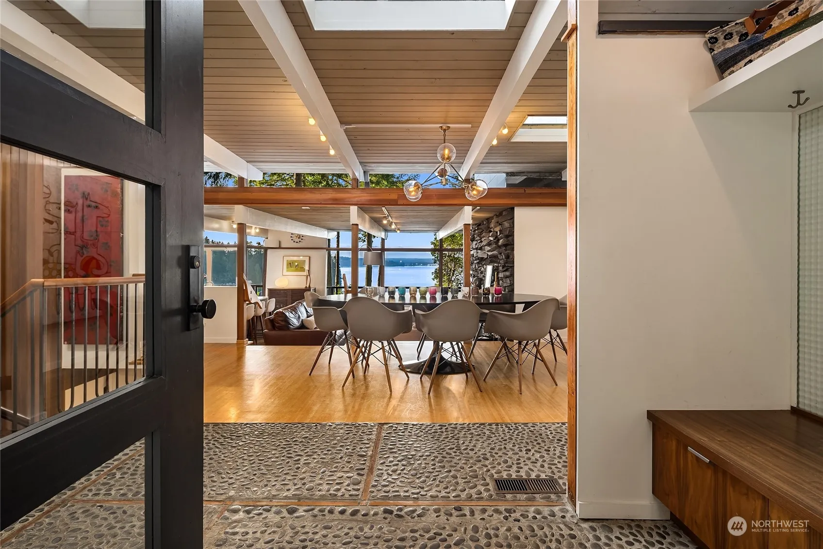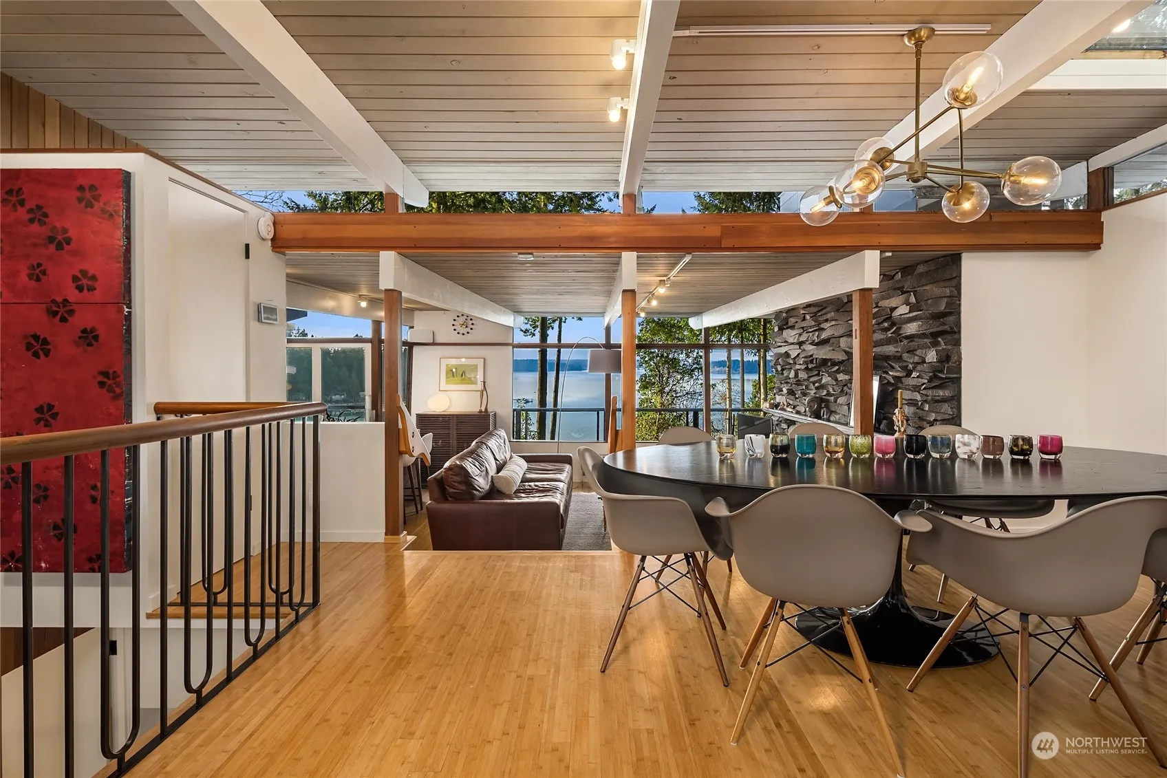A very cool Mid-Century Modern waterfront home on a shy acre with beautiful western views from almost every room. An easy trail leads to your private bulkheaded beach with 202 ft of shoreline. Custom walnut cabinetry, marble island, Thermador Range, Sub-Zero Fridge, a La Marzocco espresso machine and connecting view deck are just some of the amazing kitchen features. This efficient multi-level floor plan has amazing flex spaces and abundant natural light with a main floor den/office and primary bedroom with a high-end modern bath. Lower level has a flex-room, media room plus two more bedrooms. Professionally installed mooring buoy, two levels of decks for entertaining. View garage could be perfect 2nd home office. Island living at its best!