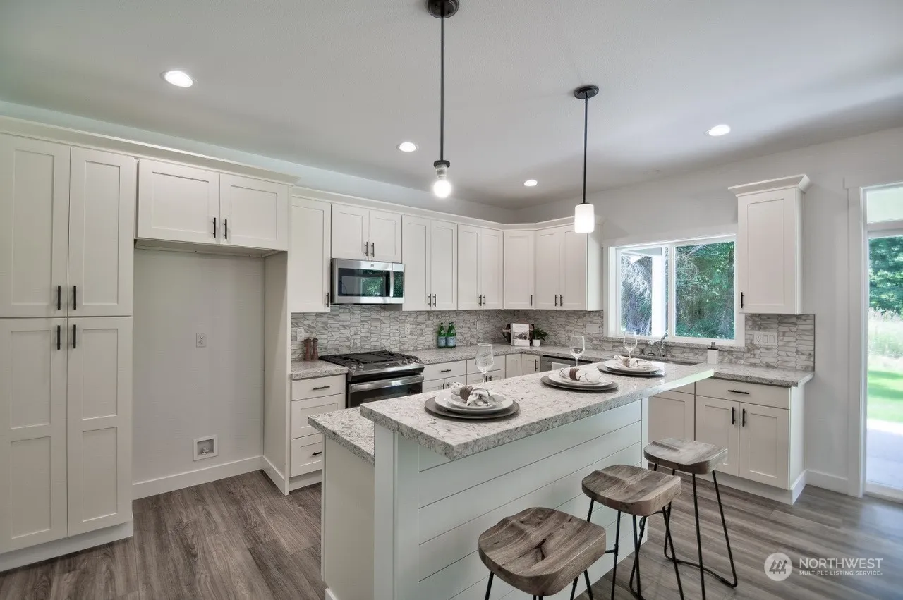 Just completed and move in ready. Looking for privacy? Welcome to Elks Landing, Hansen Constructions newest 5 acre+ neighborhood. The Snoqualmie is a 2424sqft rambler w/bonus room over the garage, 3 bedrooms, home office, 3.5 bath and 3 car garage. Standard features include solid wood cabinets, quartz counter tops with under mount sinks throughout, solid core interior doors, painted 5″ craftsman millwork, luxury plank floors in the all main floor common areas, tile floors and tub/shower surrounds in each bath. Enjoy entertaining from your large covered back patio plus plenty of storage with your fully insulated and sheetrocked 28×32 detached shop. Front and back yard landscaping with irrigation is also included.