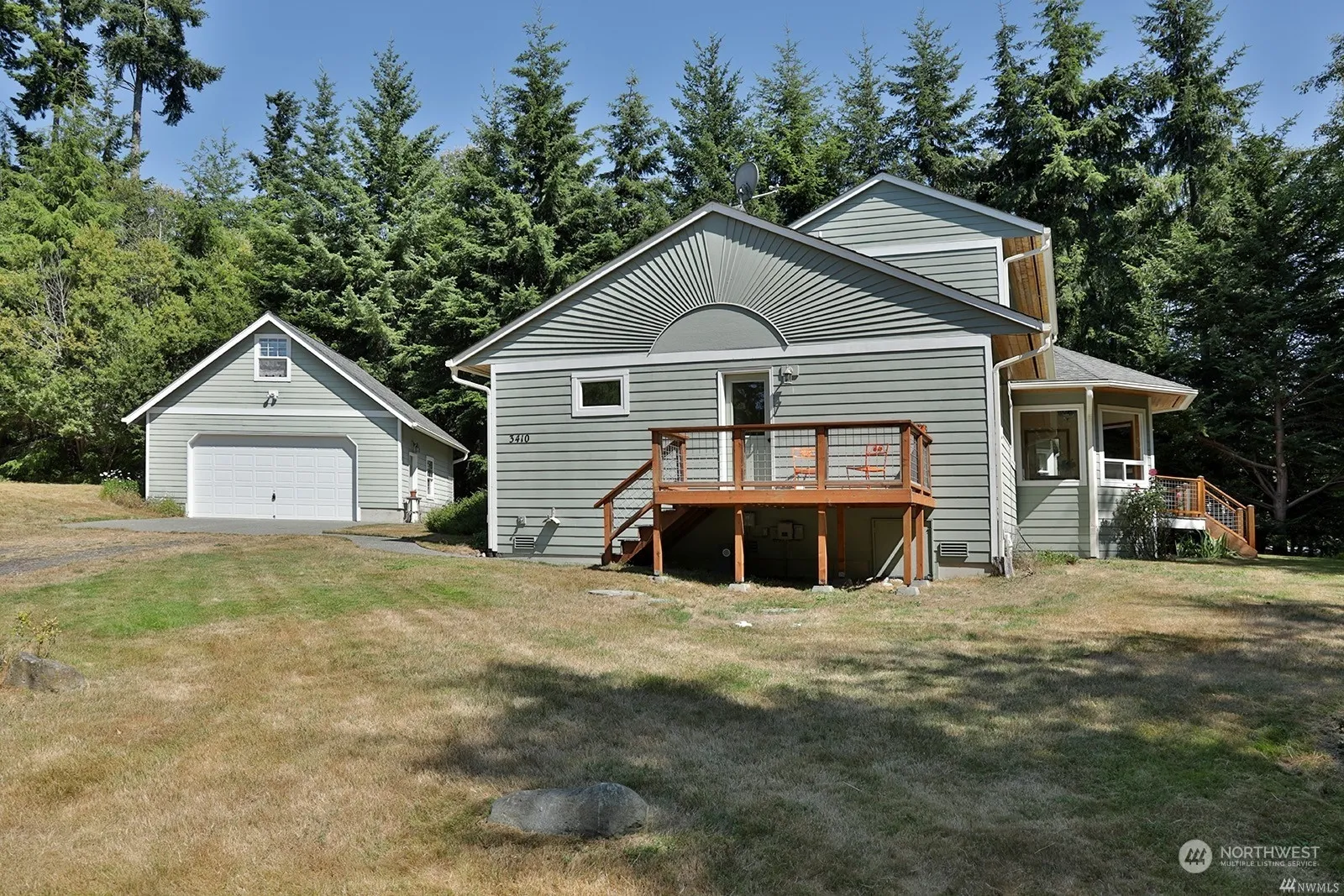This could be just what you’re looking for: Primary Bedroom, Kitchen, Great Room, Laundry all on Main floor. Two more bedrooms upstairs. The home features real hardwood floors, charming covered porch with Pine soffets. Detached 2-car garage with unfinished area above garage includes outside stairs, (nice bonus). The privacy that you get being on over 2.2 acres is truly remarkable. The nearby private community beach access, excellent boat ramp and picnic area is a huge bonus. Where else can you get a home on acreage with very close access to pristine and peaceful Holmes Harbor for boating, beach strolls etc.. Why wait! Call for a showing now!