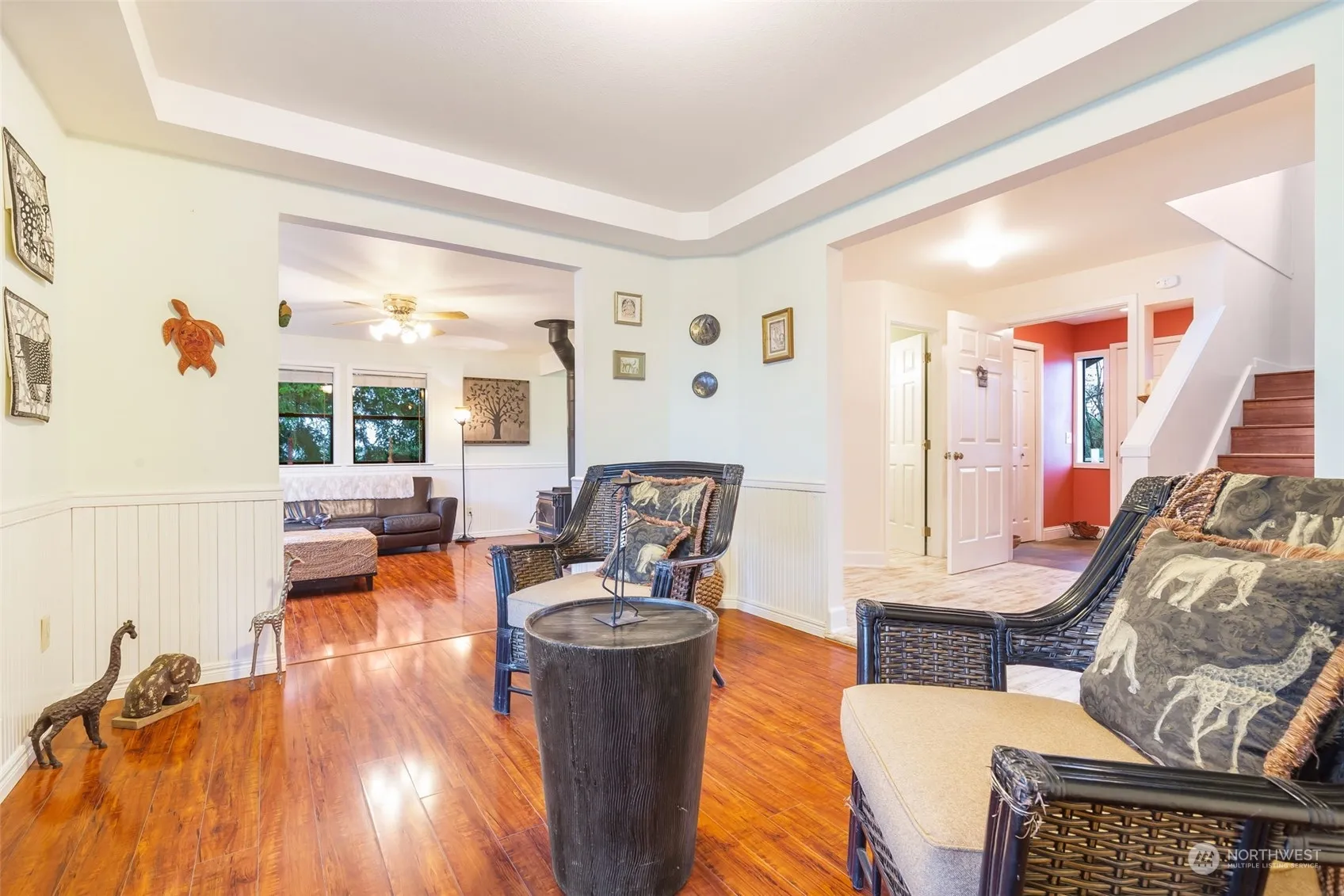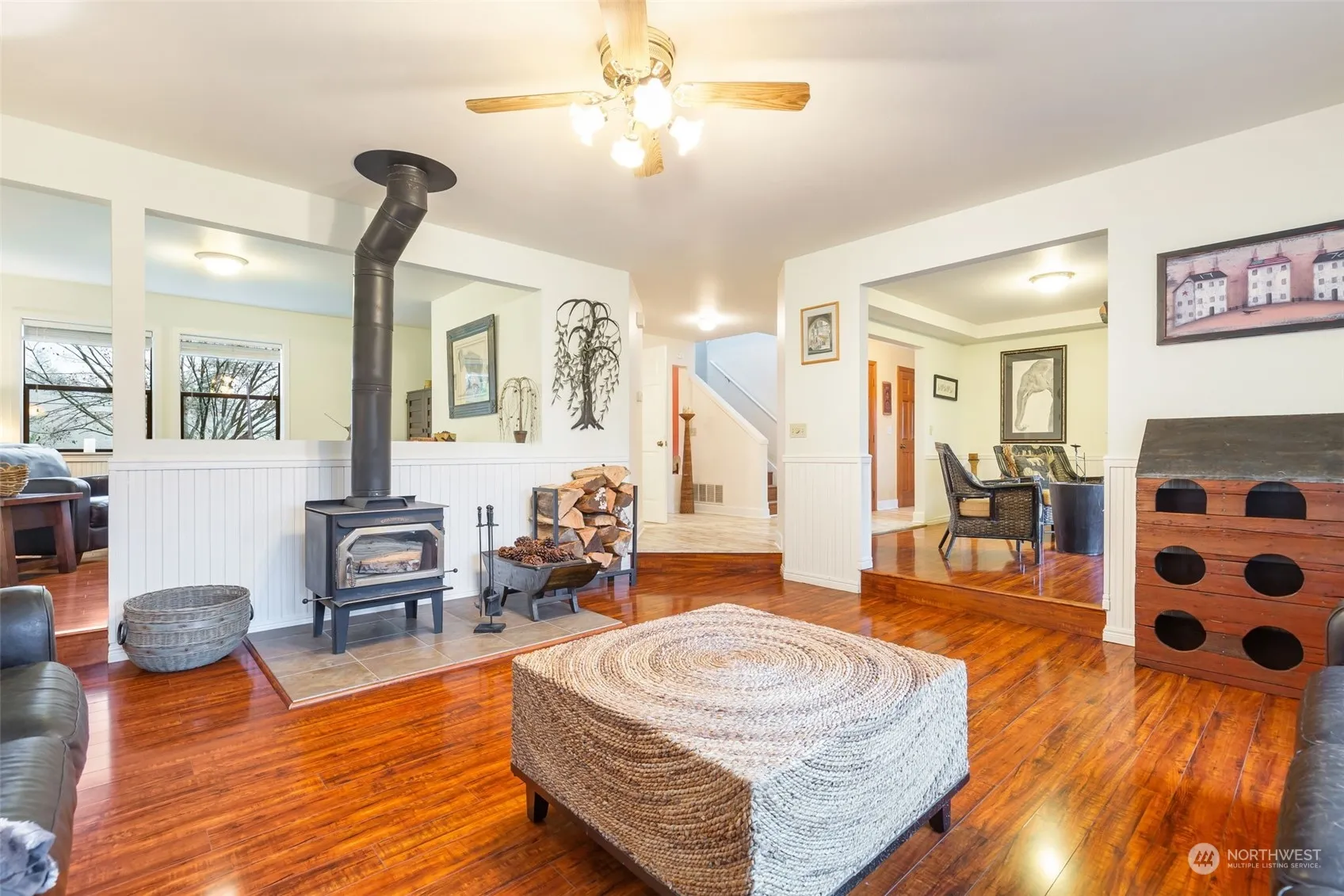 Close yet secluded two story home on 3.31 acres with room for pets, gardens and pasture. Large open kitchen with slab granite island & gas cooktop, SS appliances and range hood, kitchen pantry, dining area in kitchen plus formal dining room. Expansive deck off kitchen with hot tub and views of private backyard and Cascade mountains. Gleaming hardwoods, wood wrapped windows, wood burning stove in living room with attached den/office. Stained glass door to master bedroom w/huge shower, window seating, and large walk-in closet. Bonus room could be converted back to second master or used as private office, also with bay window and cedar closet. 2 additional bedrooms on second floor with 3/4 bath off hallway.