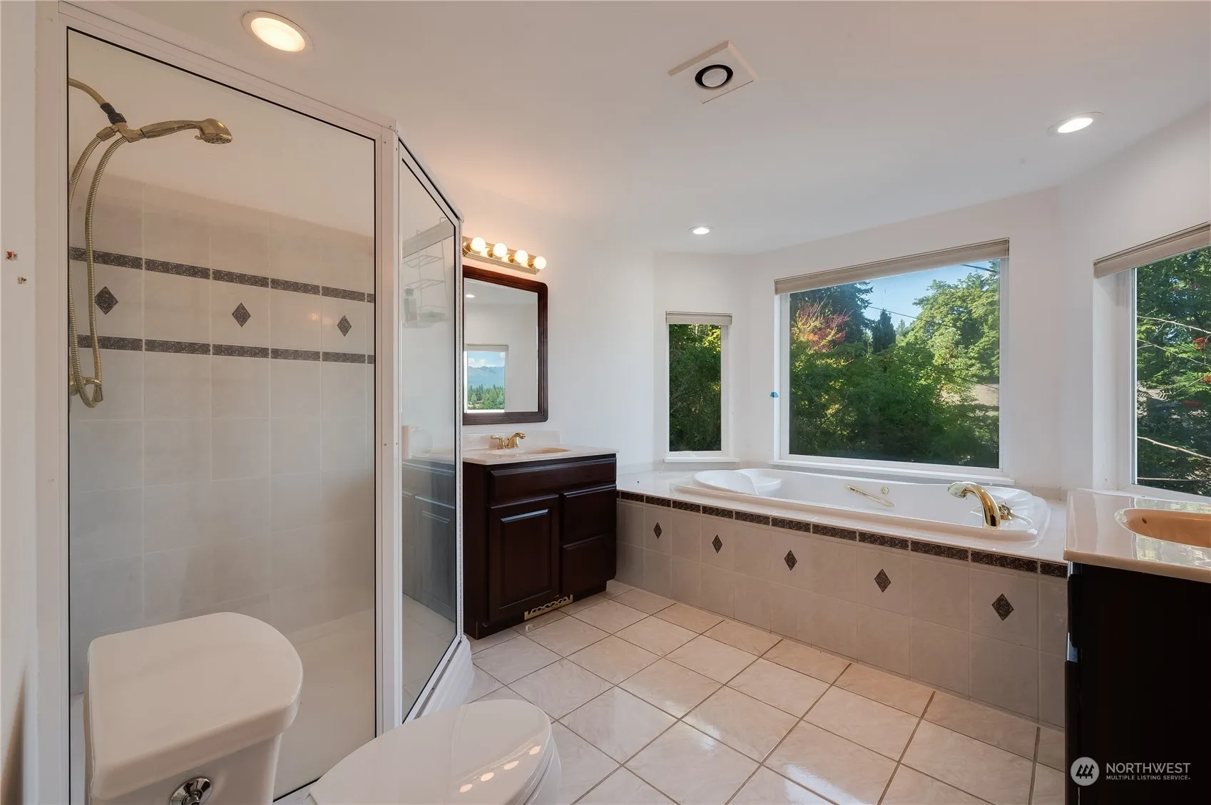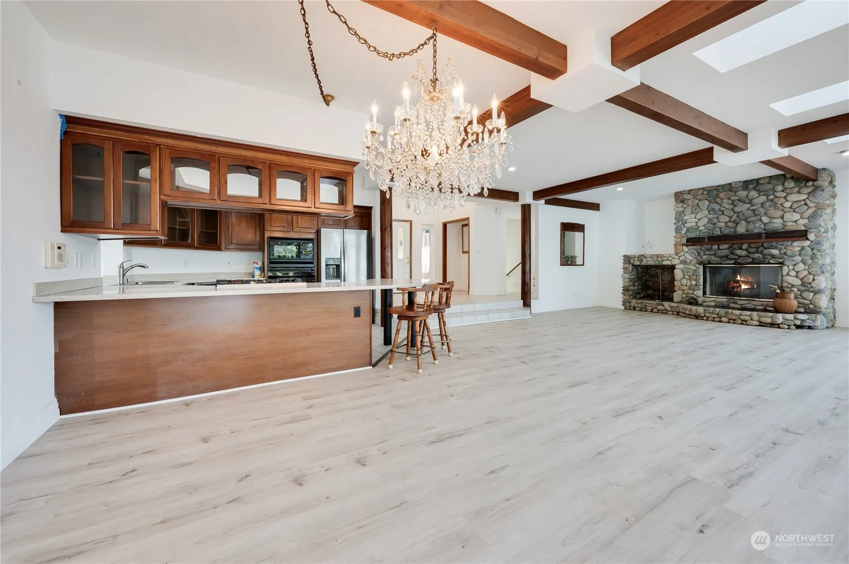 Absolutely breathtaking views of the mountains & water! This exquisite custom home boasts an elegant open floor plan that seamlessly combining dining & living room areas. Living room is bathed in natural light thanks to its walls of windows, offering a captivating 180-degree views. Beautiful chandeliers, gas fireplace creating a truly inviting atmosphere. Step out onto the oversized wrap-around deck, perfect for entertaining. Primary suite showcases a luxurious 5-piece bath w/ jetted tub. NEW exterior, interior paint, flooring, decks & landscaping. Lower floor can be ADU w/separate entrance & brand-new deck. Enjoy 82′ of waterfront w/ tidelands. Home offers ample space to dwell in. You ‘ll be enchanted by stunning views! A true gem.