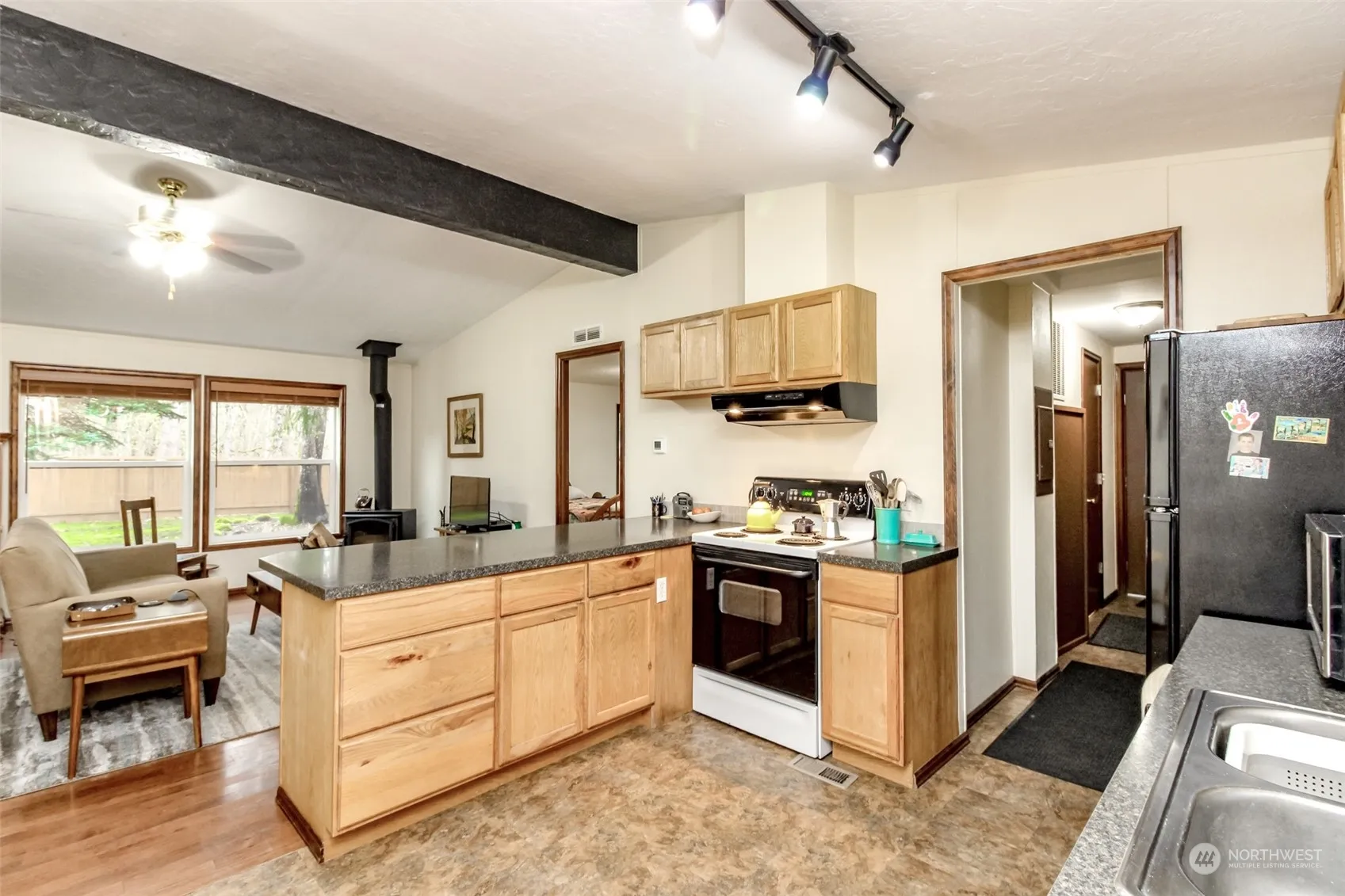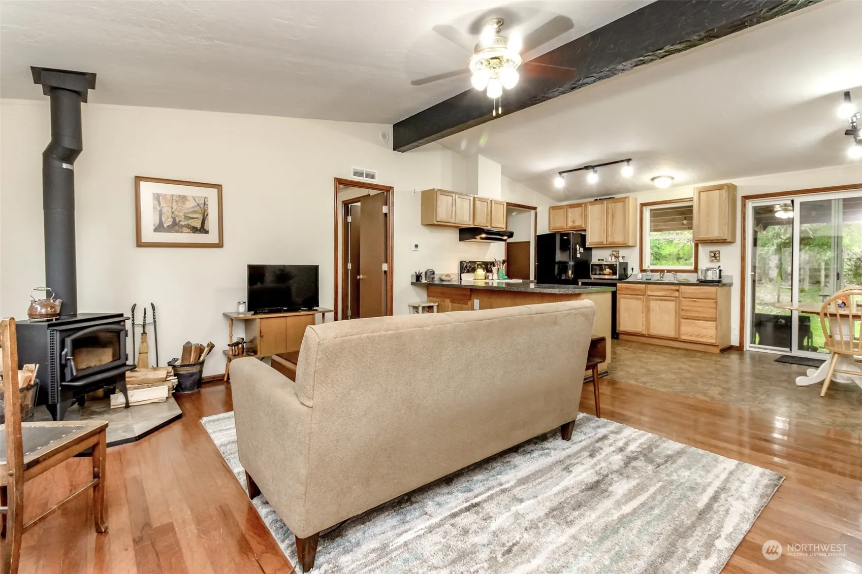 Enjoy the privacy and tranquility of country living. This 3 bedroom, 2 bathroom home is situated on a 1.16 acre lot, beautifully maintained and surrounded by trees. Upon entering you are greeted by a spacious and open floor plan. Large living room features a brand new airtight wood stove and opens to kitchen w/breakfast nook, breakfast bar and sliding door to the back yard. Master bedroom includes private bath and walk in closet. Exit the kitchen to the utility/mud room w/additional side door. Fresh exterior and interior paint. Adjacent to the home is a oversized 1200 sq ft steel shop/garage, fully insulated with commercial door. Mature landscaping, garden space and trees great for privacy and shade. Motivated seller in turnkey condition.