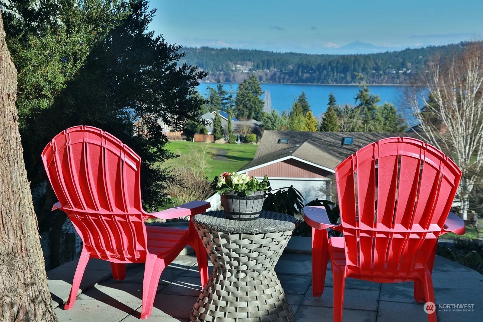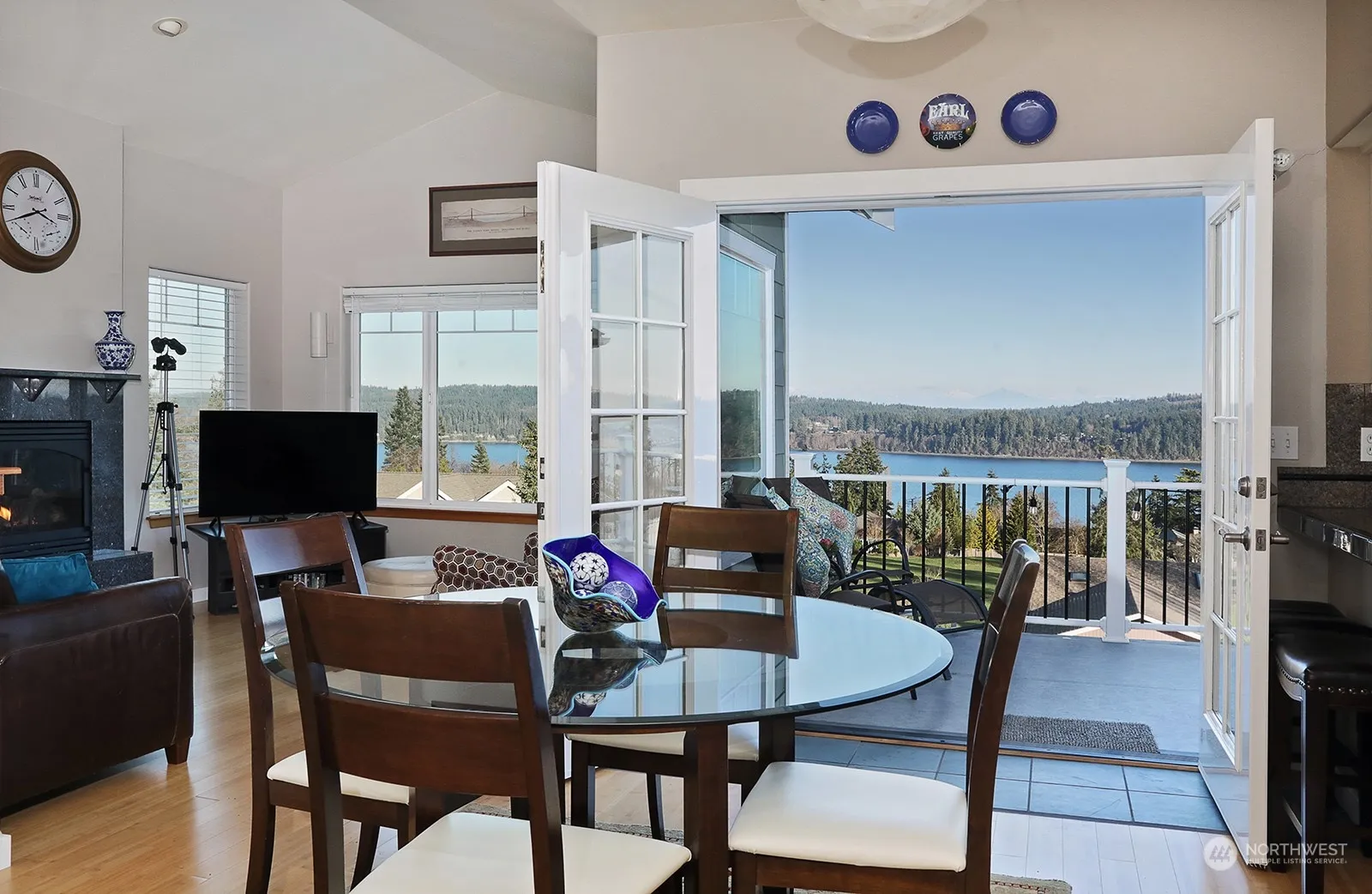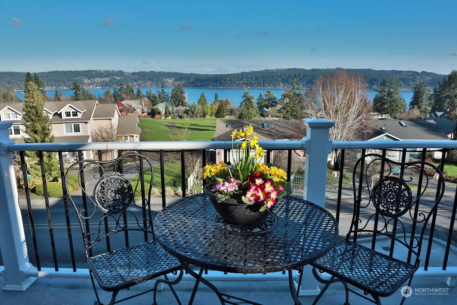 Turnkey charmer with a trifecta of stunning views including the mountains, harbor and golf course. Sip your morning beverage on the deck taking in the sunrise, Mt. Baker & Mt. Rainier! Meticulously cared for home and flows well offering a main floor designed for entertaining w/beautiful bamboo hardwood in the living & dining areas, an efficient kitchen w/granite countertops, along w/3 bedrooms & 2 full baths. A slate tile entry way on the lower floor leads to a large flex room, ¾ bath, utility room & garage. Roof, exterior paint, water heater, patio w/exterior door off primary, electric awning & EV outlet are recent updates. Terraced yard w/easy to maintain landscaping. Minutes to beaches, golf, trails, shops, wineries, restaurants & ferry!