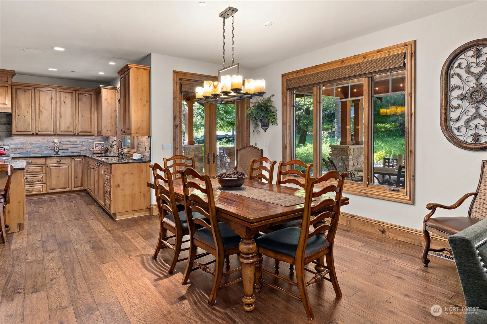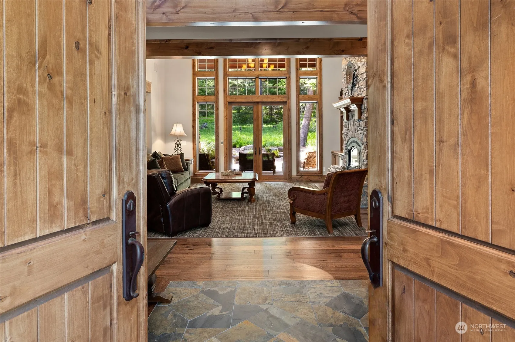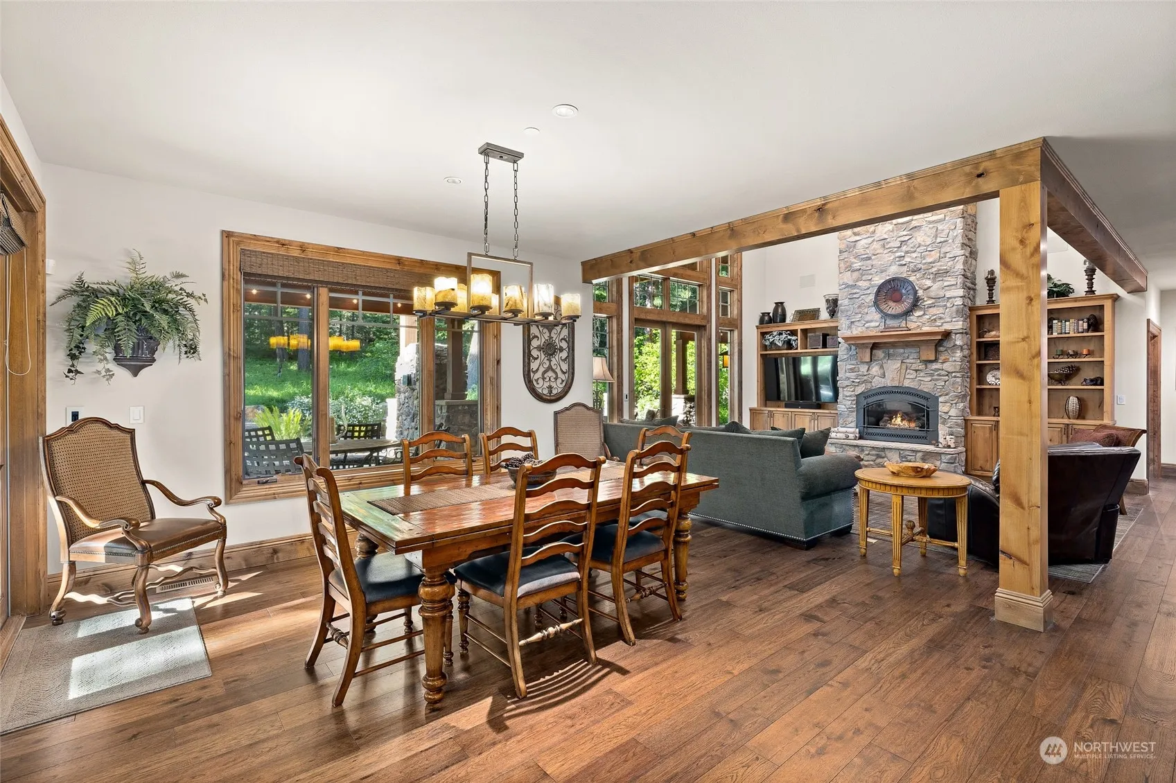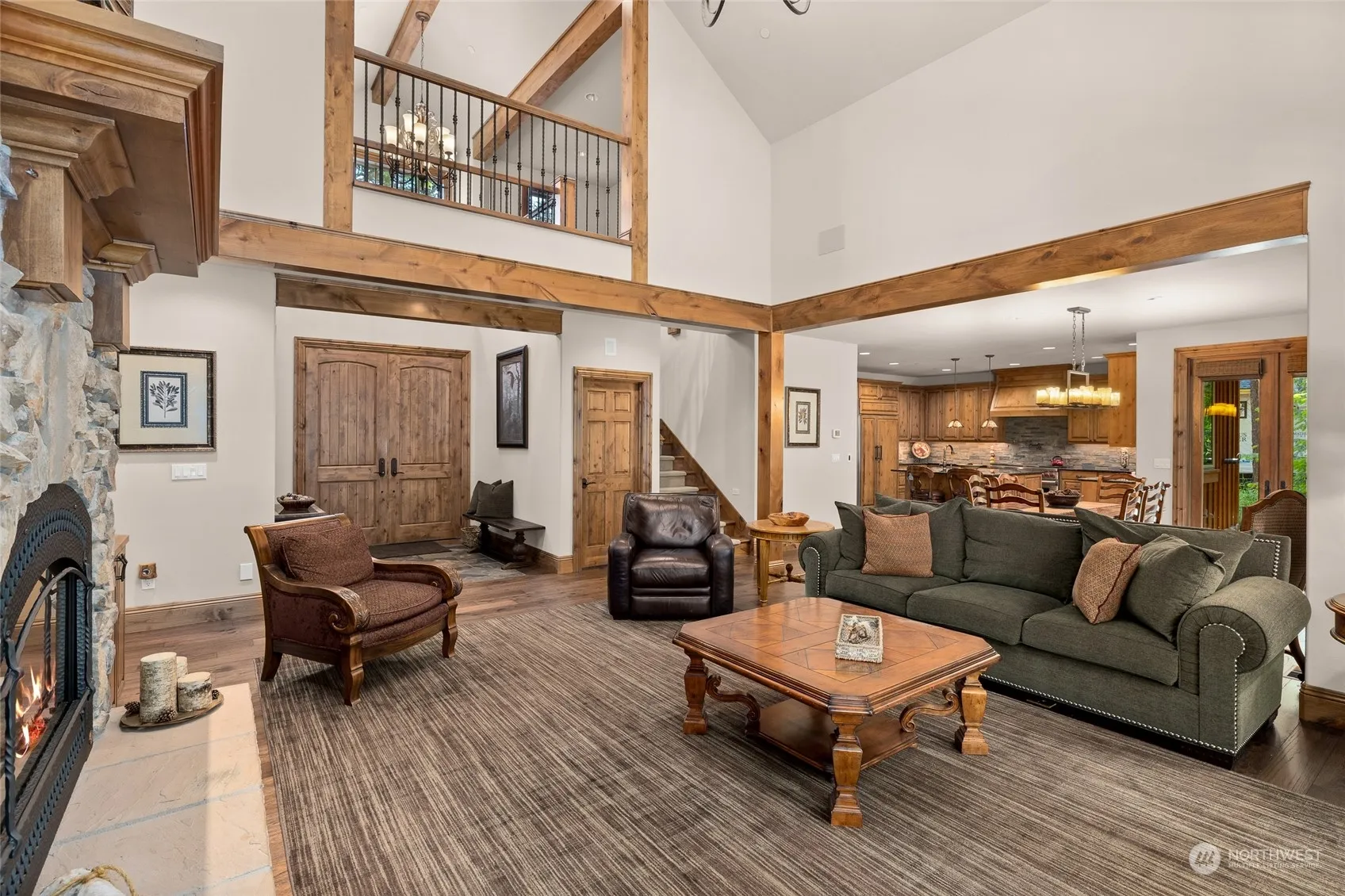Gorgeous custom lodge style home with all high end finishes & rare 3 car garage, sits on half acre secluded lot, backs to golf course. Double door entry leads to huge great room, large dining & chef’s kitchen boasting Viking stove, wine fridge & hot water tap. Main floor primary bedroom with fireplace and bath w heated floors & steam shower. Additional bedroom, half bath & laundry complete lower level. Upper level includes en suite bedroom with bath, walk in closet & loads of storage, additional bedroom, full bath and huge bonus/theater room could easily convert to more sleeping area. Expansive, outdoor, covered living space includes built in bbq, fireplace & hot tub. Third garage bay currently set as game rm. EVERYTHING stays for buyer!